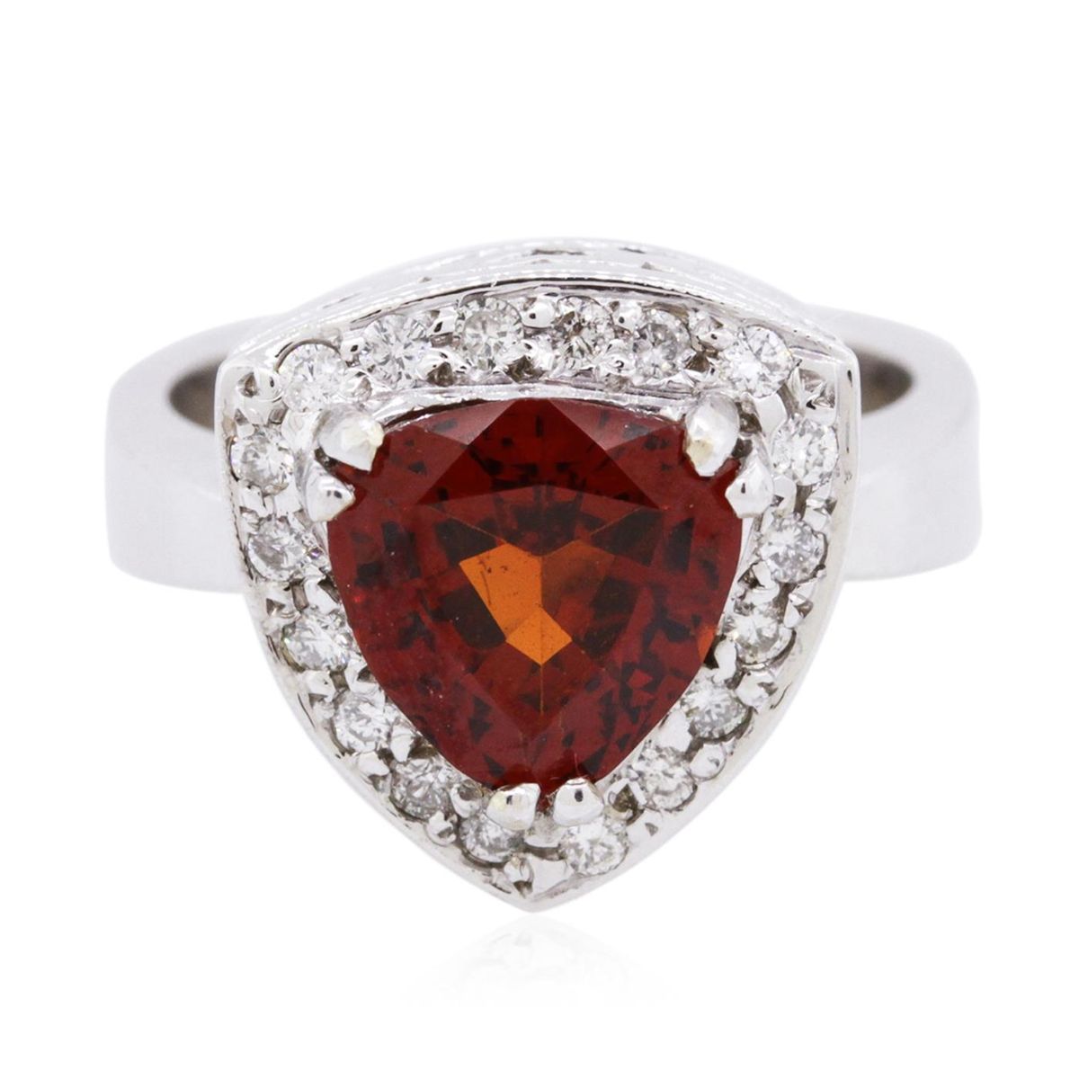 One electronically tested 18KT white gold ladies combination cast & assembled garnet and diamond ring with a flat shank with a bright polish finish. Identified with markings of "18K". Condition is new. Containing: One prong set triangle modified brilliant cut natural pyrope garnet, measuring 9.00 x 9.00 x 5.85mm, approximate weight of 3.18ct., clarity is eye clean, type II, dark, very slightly brownish, brownish red color, (GIA slpR 7/3), cut is very good. Eighteen prong set round brilliant cut diamonds, measuring 1.50 - 1.50 x 0.90mm (depth est.) approximate total weight of 18 Stones = 0.22ct. Clarity: SI-2 to I-1. Color: I - J, Cut is Good. All diamonds and colored gemstones are graded in the mounting, unless otherwise stated. Colored gemstones are presumed to have been subjected to commonly used enhancement processes. Total Weight of Colored Stones 3.18ct. Total Weight of Diamonds 0.22ct. Total Weight of Ring 11.20 grams. GGL Appraised at $6,000.00.
