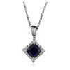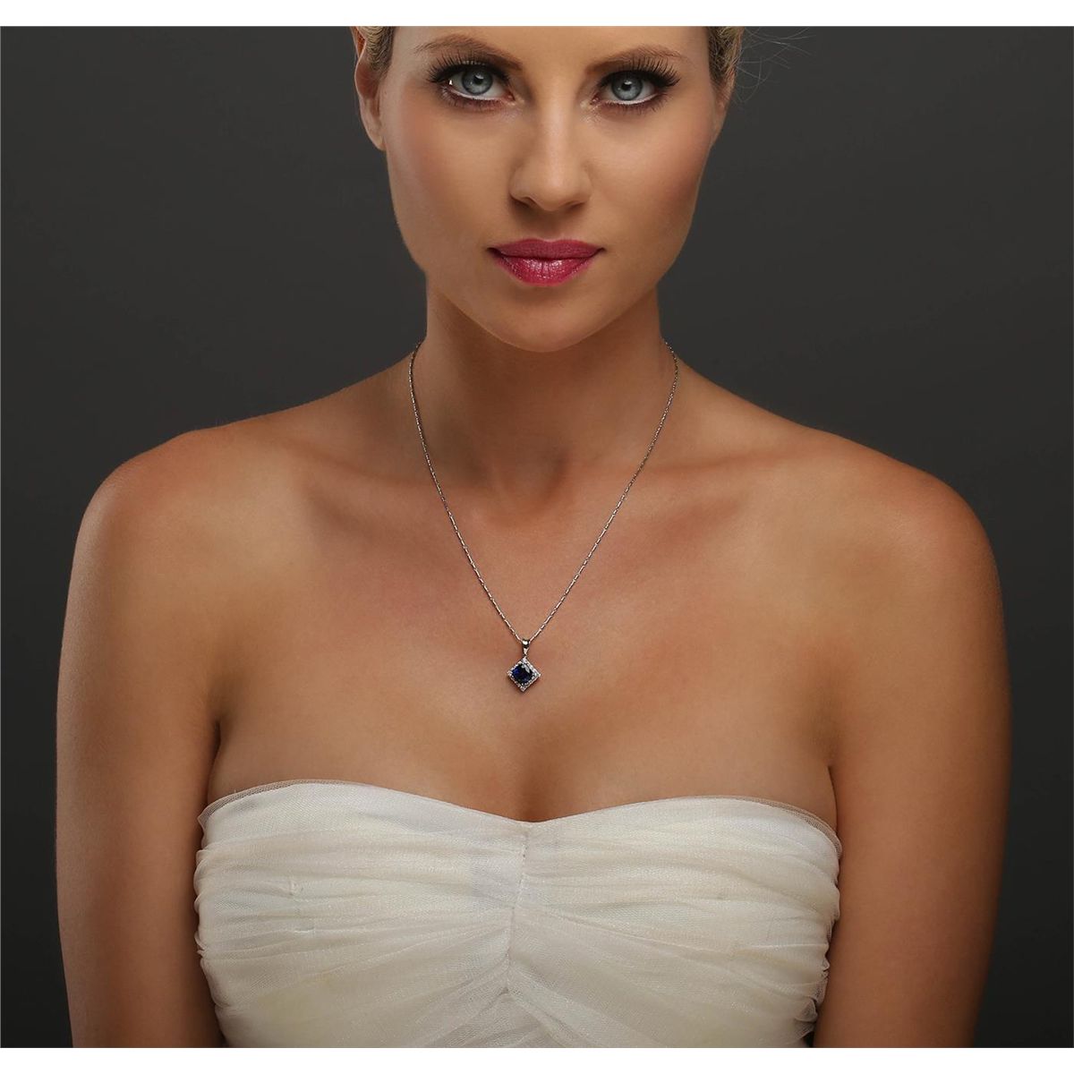 One electronically tested 18KT White Gold ladies cast & assembled sapphire and diamond pendant with chain. The pendant features a sapphire set within a diamond bezel, completed by a White Gold bail. The pendant is supported by an eighteen inch length 14KT White Gold designer style chain, terminating in a lobster claw clasp. Bright polish finish. Identified with markings of "18K 750". Condition is new, good workmanship. Containing: One prong set square cushion brilliant cut blue sapphire, measuring 7.70 x 7.60 x 5.45mm, 6% bulge factor, approximate weight of 3.18ct., clarity is eye clean, type II, dark, moderately strong, blue color, (GIA B 7/4), cut is good. Transmitting light with no distortion, transparent. Indications of laboratory high temperature diffusion treatment. Whether or not this gemstone is natural cannot currently be determined due to diffusion treatment. Graded in the setting. Sixteen prong set round brilliant cut diamonds, measuring 1.90 - 1.80 x 1.11mm (depth est.) approximate total weight of 16 Stones = 0.47ct. Graded in the setting. Clarity: VS-1 to SI-1. Color: F - H. Total Weight of Colored Stones 3.18ct. Total Weight of Diamonds 0.47ct. Total Weight of Pendant With Chain 4.95 grams. AIG Appraised at $2,940.00.