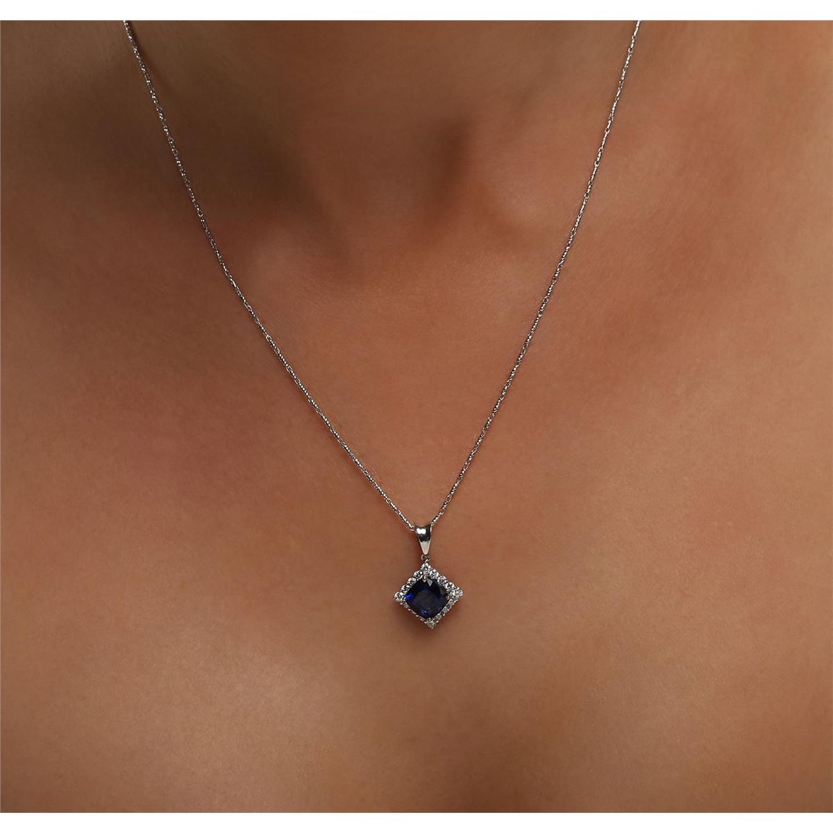 One electronically tested 18KT White Gold ladies cast & assembled sapphire and diamond pendant with chain. The pendant features a sapphire set within a diamond bezel, completed by a White Gold bail. The pendant is supported by an eighteen inch length 14KT White Gold designer style chain, terminating in a lobster claw clasp. Bright polish finish. Identified with markings of "18K 750". Condition is new, good workmanship. Containing: One prong set square cushion brilliant cut blue sapphire, measuring 7.70 x 7.60 x 5.45mm, 6% bulge factor, approximate weight of 3.18ct., clarity is eye clean, type II, dark, moderately strong, blue color, (GIA B 7/4), cut is good. Transmitting light with no distortion, transparent. Indications of laboratory high temperature diffusion treatment. Whether or not this gemstone is natural cannot currently be determined due to diffusion treatment. Graded in the setting. Sixteen prong set round brilliant cut diamonds, measuring 1.90 - 1.80 x 1.11mm (depth est.) approximate total weight of 16 Stones = 0.47ct. Graded in the setting. Clarity: VS-1 to SI-1. Color: F - H. Total Weight of Colored Stones 3.18ct. Total Weight of Diamonds 0.47ct. Total Weight of Pendant With Chain 4.95 grams. AIG Appraised at $2,940.00.