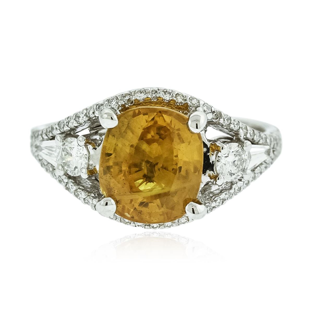 One electronically tested 18KT white gold Ladies combination cast & assembled ring with a bright polish finish. Condition is new. Identified with markings of "K18". Containing: One Hundred prong set round brilliant cut diamonds, measuring 1.00 - 1.00 x 0.60mm (depth est.) approximate. Total Weight of 100 Stones = 0.36ct. Clarity: I-1 to I-2. Color: I - J, Cut is Good. One prong set oval modified brilliant cut natural yellow sapphire, measuring 9.30 x 8.10 x 5.27mm, approximate weight of 3.19ct., clarity is eye clean, type II, medium light, brownish, yellow color, (GIA Y 4/3), cut is good. Colored gemstones are presumed to have been subjected to commonly used color/clarity enhancement processes. Two prong set round brilliant cut diamonds, measuring 3.00 - 3.00 x 1.80mm (depth est.) approximate. Total Weight of 2 Stones = 0.20ct. Clarity: SI-1. Color: I, Cut is Very Good. Two prong set baguette cut diamonds, measuring 4.50 x 1.90 x 1.62mm (depth est.) approximate. Total Weight of 2 Stones = 0.25ct. Clarity: SI-1. Color: I, Cut is Good. Total Weight of Colored Stones 3.19ct. Total Weight of Diamonds 0.81ct. Total Weight of Ring 6.10 grams. GGL Appraised at $7,765.00.