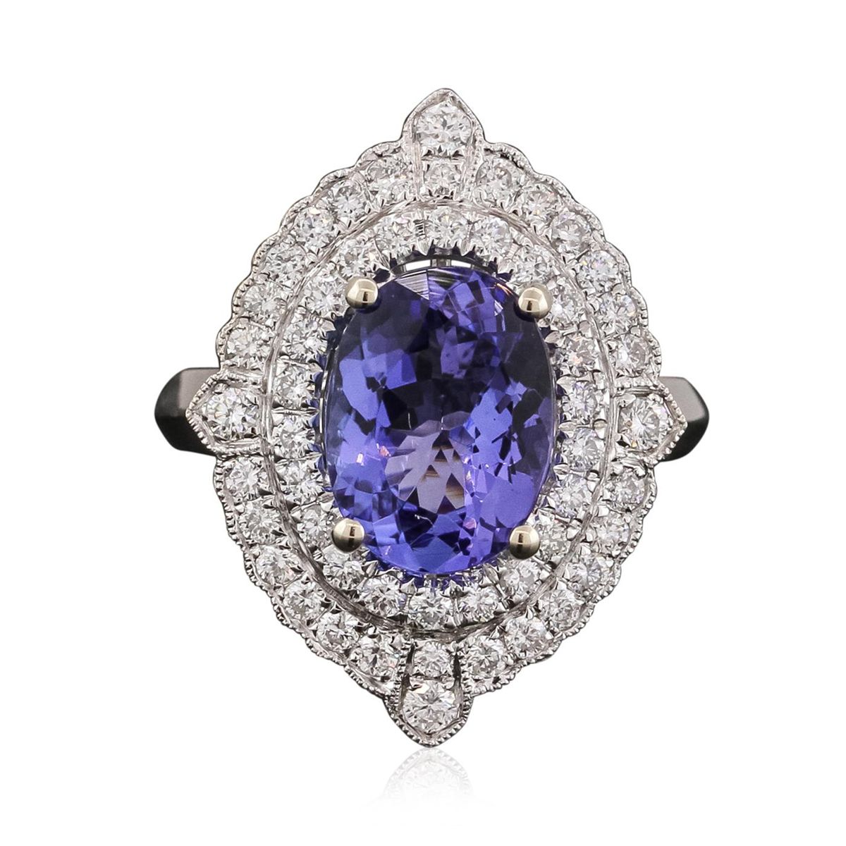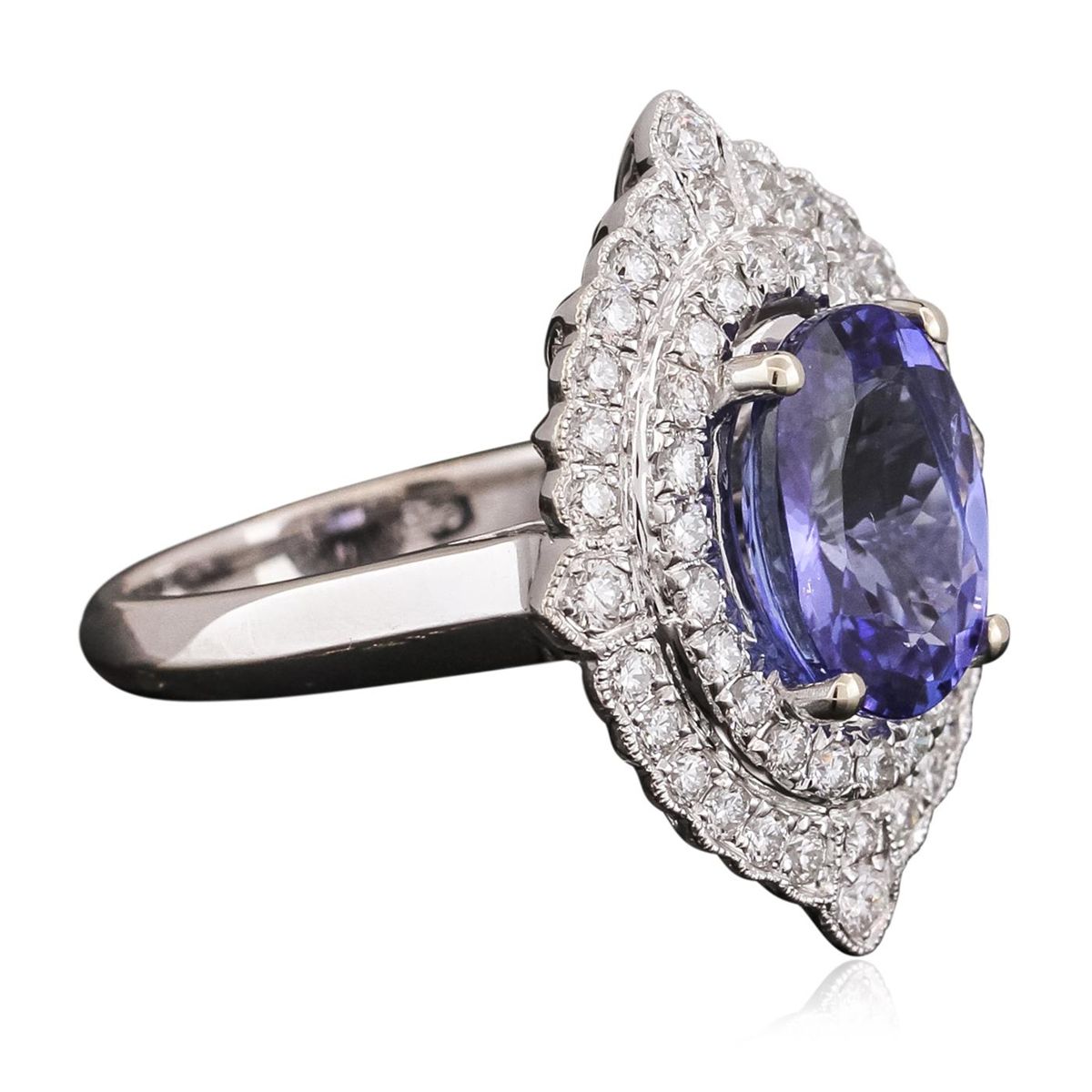 One electronically tested 18KT white gold ladies combination cast & assembled prong set ring with a cathedral shank with a bright polish finish. Identified with markings of "750 18K". Condition is new. Containing: One prong set oval modified brilliant cut natural tanzanite, measuring 11.11 x 8.02 x 5.21mm, approximate weight of 3.19ct., clarity is eye clean, type I, medium light, very slightly grayish, violet color, (GIA V 4/3), cut is good. Fifty-Two prong set round brilliant cut diamonds, measuring 1.70 - 1.50 x 0.96mm (depth est.) approximate total weight of 52 Stones = 0.88ct. Clarity: SI-1. Color: H - I, Cut is Good. All diamonds are graded in the mounting, unless otherwise stated, Colored gemstones are presumed to have been subjected to commonly used enhancement processes. Total Weight of Colored Stones 3.19ct. Total Weight of Diamonds 0.88ct. Total Weight of Ring 6.90 grams. GGL Appraised at $9,915.00.
