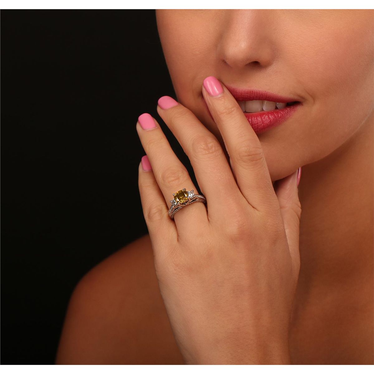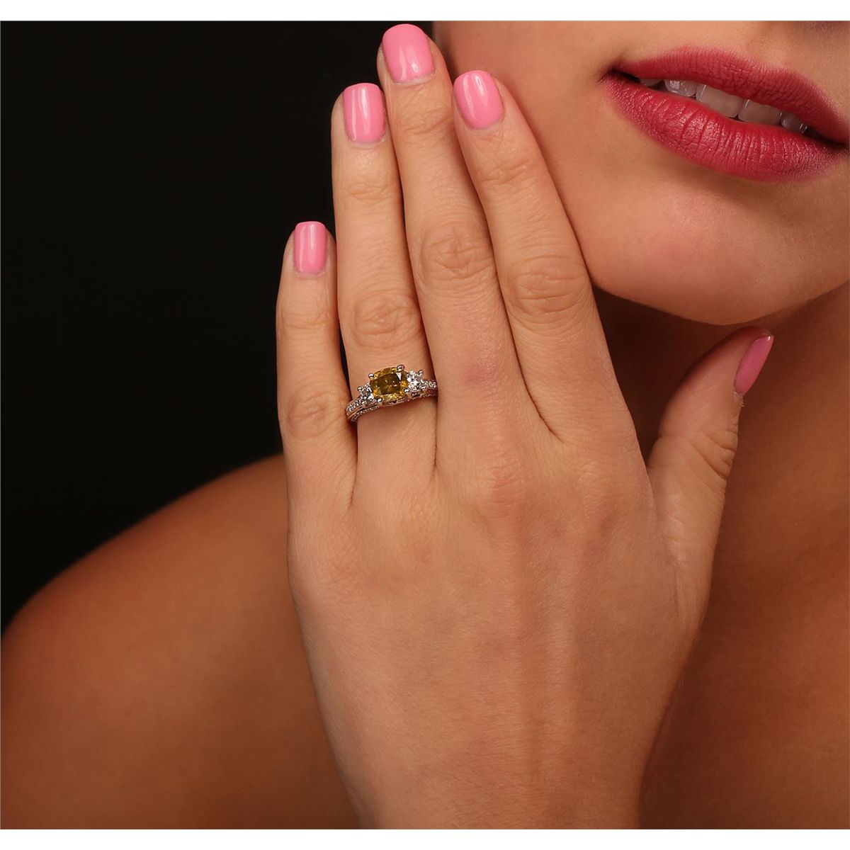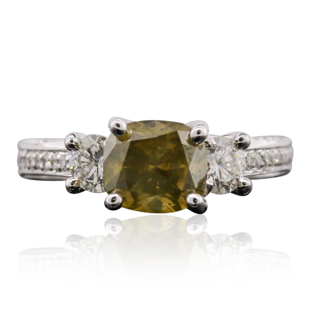 One electronically tested 18KT white gold ladies cast diamond unity ring with a bright polish finish. Identified with markings of "18K". Condition is good. Containing: One prong set cushion cut diamond, measuring 7.50 x 6.80 x 5.00mm (depth est) exact weight of 2.13ct. Indications of laboratory irradiated enhanced color. Graded in the setting. Clarity I-1 Color Fancy Greenish Yellow. Depth 73.5% Table 61.8% Two prong set round brilliant cut diamonds, measuring 4.40 - 4.40 x 2.64mm (depth est) approximate total weight of 2 Stones = 0.61ct. Graded in the setting. Clarity I-1 Color H. Sixty-Four bright cut & bead set round brilliant cut diamonds, measuring 1.30 - 1.20 x 0.75mm (depth est) approximate total weight of 64 Stones = 0.50ct. Graded in the setting. Clarity I-1 to I-2. Color H-J. Total Weight of Diamonds 3.24ct. Total Weight of Ring 6.52 grams. AIG Appraised at $23,075.00.