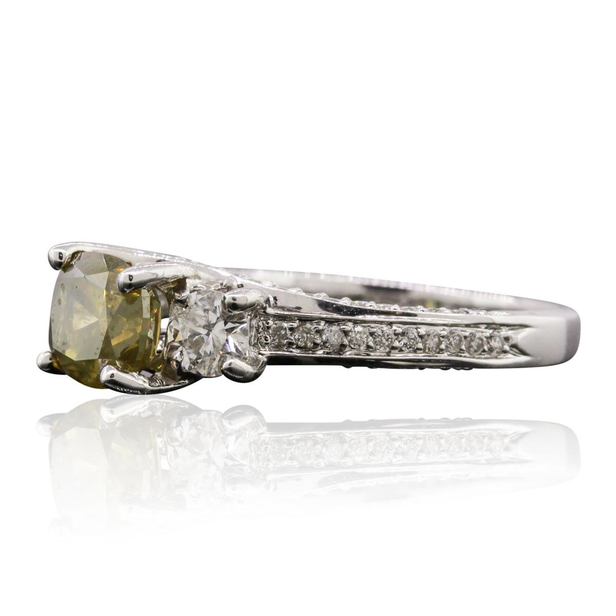 One electronically tested 18KT white gold ladies cast diamond unity ring with a bright polish finish. Identified with markings of "18K". Condition is good. Containing: One prong set cushion cut diamond, measuring 7.50 x 6.80 x 5.00mm (depth est) exact weight of 2.13ct. Indications of laboratory irradiated enhanced color. Graded in the setting. Clarity I-1 Color Fancy Greenish Yellow. Depth 73.5% Table 61.8% Two prong set round brilliant cut diamonds, measuring 4.40 - 4.40 x 2.64mm (depth est) approximate total weight of 2 Stones = 0.61ct. Graded in the setting. Clarity I-1 Color H. Sixty-Four bright cut & bead set round brilliant cut diamonds, measuring 1.30 - 1.20 x 0.75mm (depth est) approximate total weight of 64 Stones = 0.50ct. Graded in the setting. Clarity I-1 to I-2. Color H-J. Total Weight of Diamonds 3.24ct. Total Weight of Ring 6.52 grams. AIG Appraised at $23,075.00.