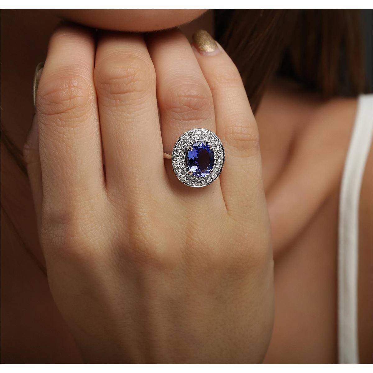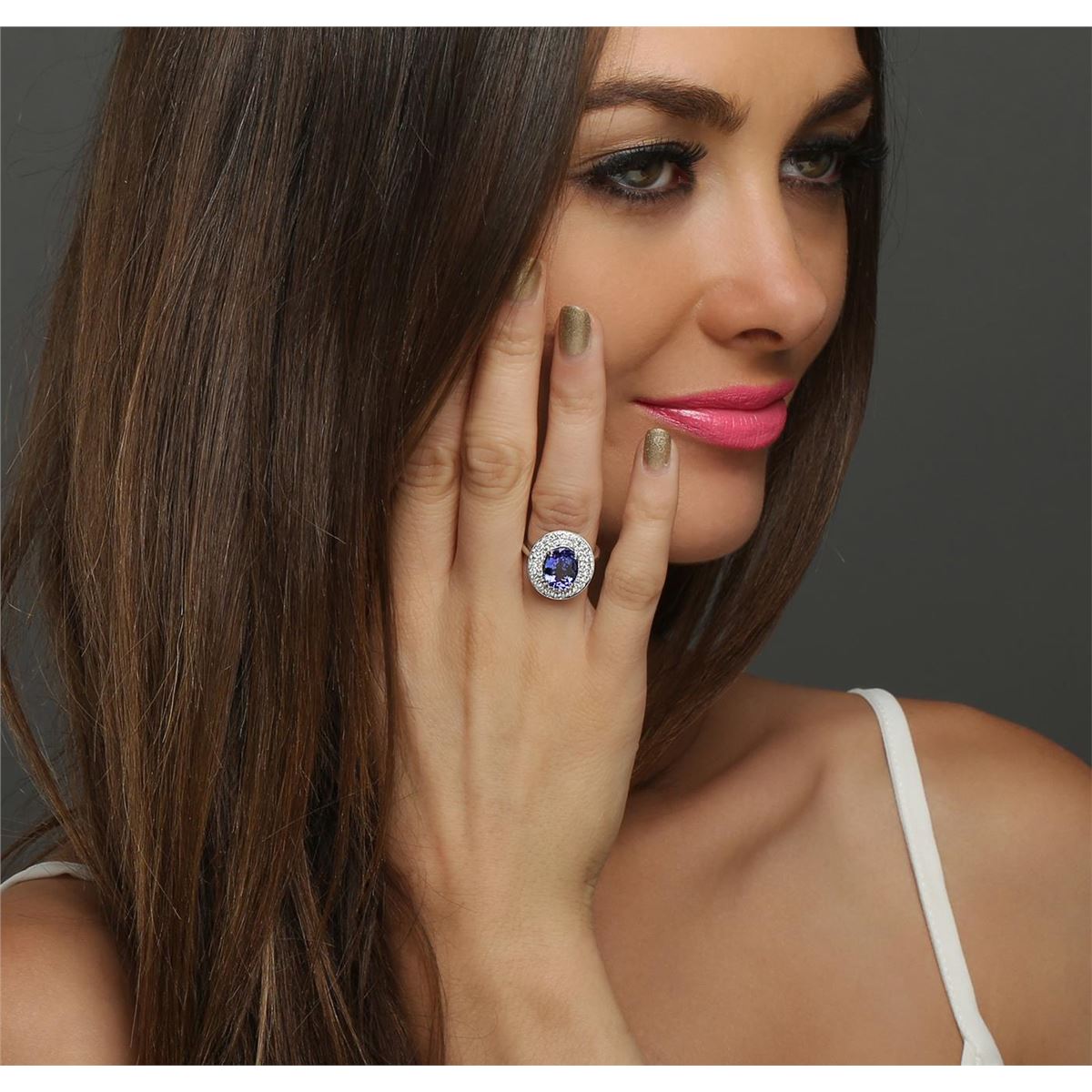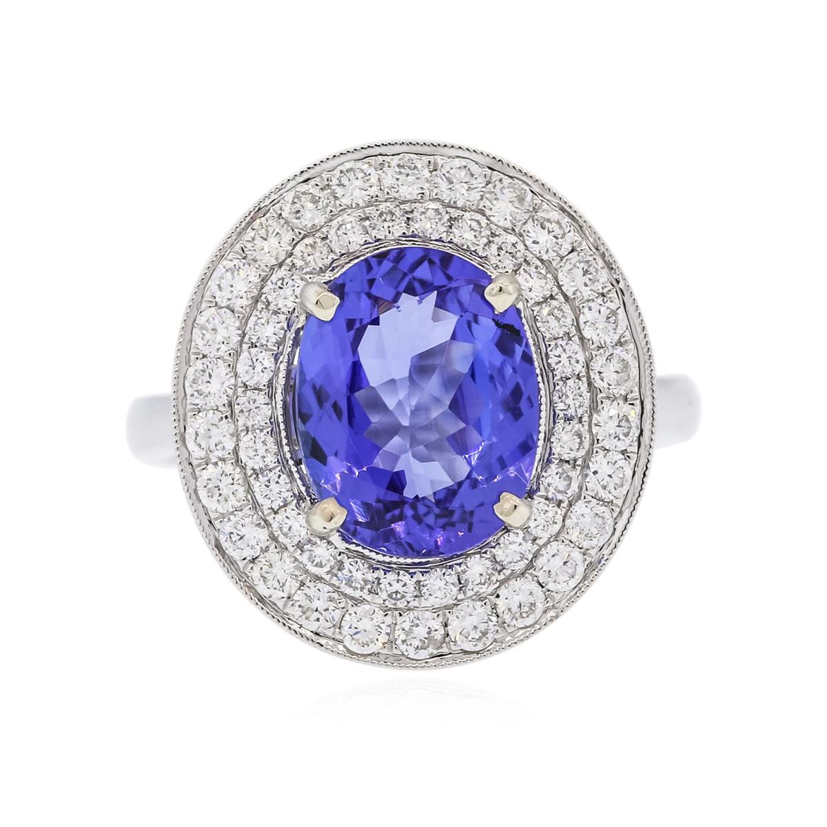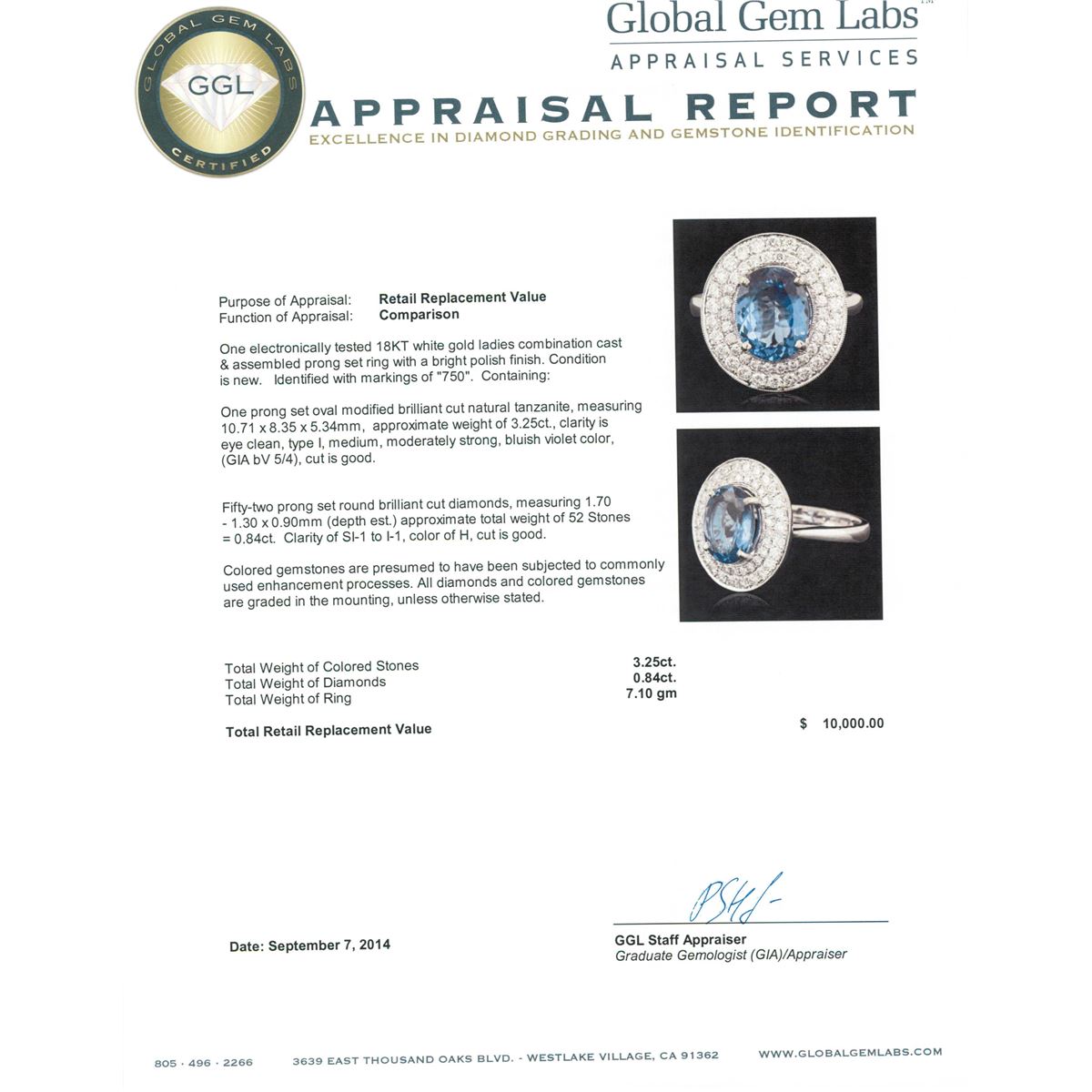 One electronically tested 18KT white gold ladies combination cast & assembled prong set ring with a bright polish finish. Identified with markings of "750". Condition is new. Containing: One prong set oval modified brilliant cut natural tanzanite, measuring 10.71 x 8.35 x 5.34mm, approximate weight of 3.25ct., clarity is eye clean, type I, medium, moderately strong, bluish violet color, (GIA bV 5/4), cut is good. Fifty-Two prong set round brilliant cut diamonds, measuring 1.70 - 1.30 x 0.90mm (depth est.) approximate total weight of 52 Stones = 0.84ct. Clarity: SI-1 to I-1. Color: H, Cut is Good. Colored gemstones are presumed to have been subjected to commonly used enhancement processes. All diamonds and colored gemstones are graded in the mounting, unless otherwise stated. Total Weight of Colored Stones 3.25ct. Total Weight of Diamonds 0.84ct. Total Weight of Ring 7.10 grams. GGL Appraised at $10,000.00.