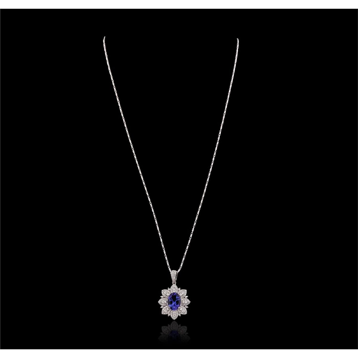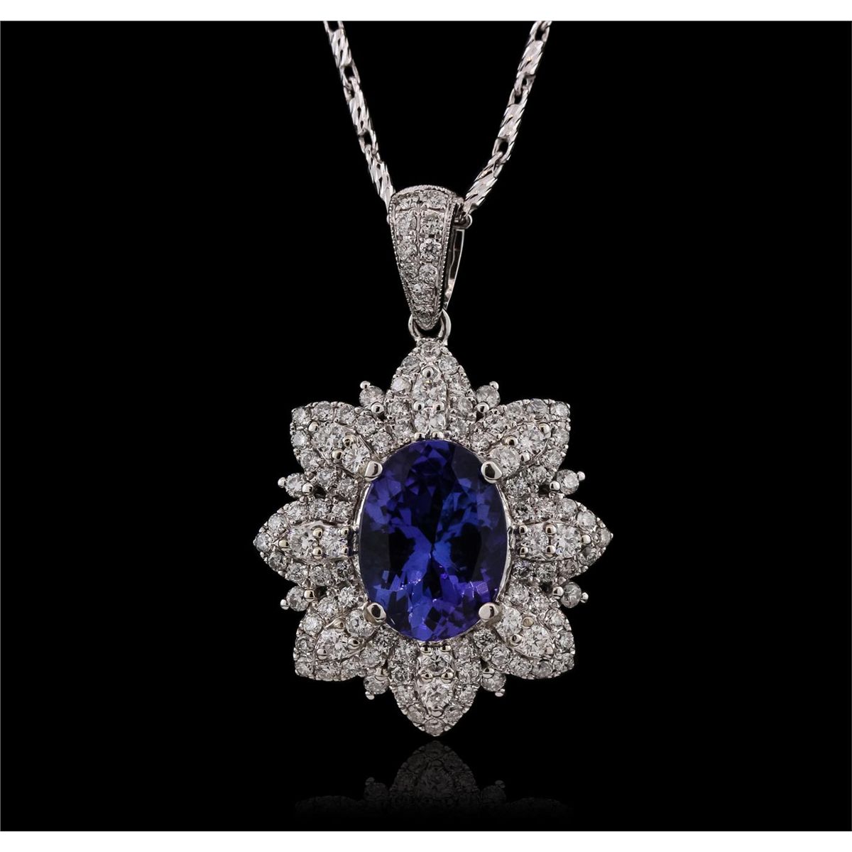 One electronically tested 18KT White Gold ladies cast & assembled tanzanite and diamond pendant with chain. The pendant features a tanzanite set within a stylized diamond set floral gallery, completed by a diamond set bail. The pendant is supported by an eighteen inch length 14KT White Gold des Identified with markings of "18K 750". Condition is new, good workmanship. Containing: One prong set oval brilliant cut natural tanzanite, measuring 10.95 x 8.04 x 5.05mm, 8% bulge factor, approximate weight of 3.29ct., clarity is eye clean, type I, medium dark, very slightly grayish, violetish blue color, (GIA vB 6/3), cut is good. Transmitting light with no distortion, transparent. Graded in the setting. Tanzanite is a very rare gemstone that is only found in the country of Tanzania. Originally discovered in 1967. Tiffany & Company, named the stone Tanzanite. It is found in the Usumburu Mountains that border the Umba Valley of northern Tanzania. Tanzanite occurs in gray, brown, violet, blue, reddish-purple, & green. The gem is interesting because of its exceptional pleochroism. Rotated in different directions a tanzanite will exhibit multiple changes of color. Tanzanite has a low tolerance to ultrasonic cleaning, and should not be cleaned using this method. Sixteen prong set round brilliant cut diamonds, measuring 1.90 - 1.70 x 1.08mm (depth est.) approximate total weight of 16 Stones = 0.44ct. Graded in the setting. Clarity: VS-1 to SI-1. Color: G - I Ninety prong set round brilliant cut diamonds, measuring 1.30 - 1.10 x 0.72mm (depth est.) approximate total weight of 90 Stones = 0.66ct. Graded in the setting. Clarity: VS-1 to VS-2. Color: G - I. Total Weight of Colored Stones 3.29ct. Total Weight of Diamonds 1.10ct. Total Weight of Pendant With Chain 8.35 grams. AIG Appraised at $14,460.00.