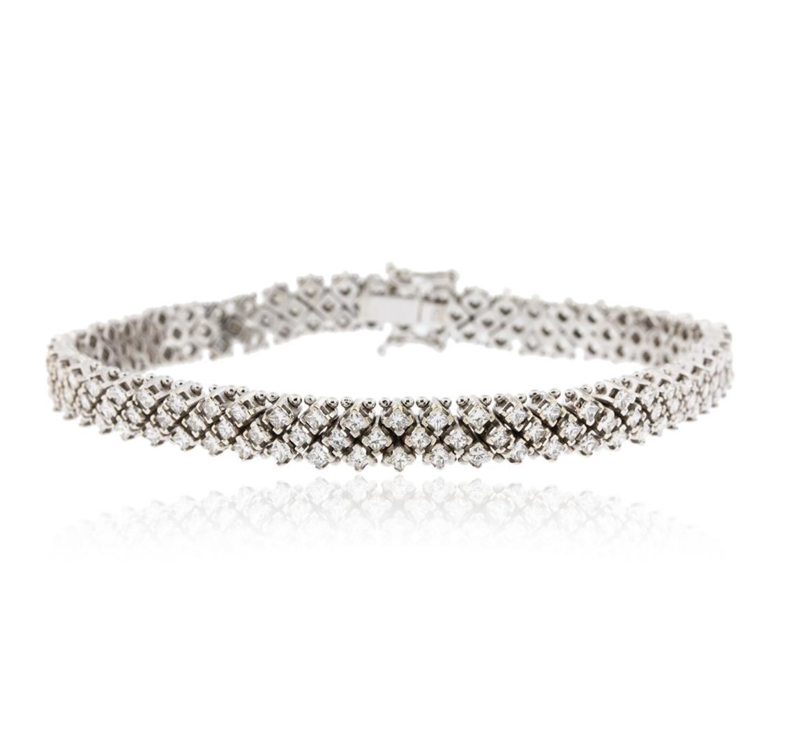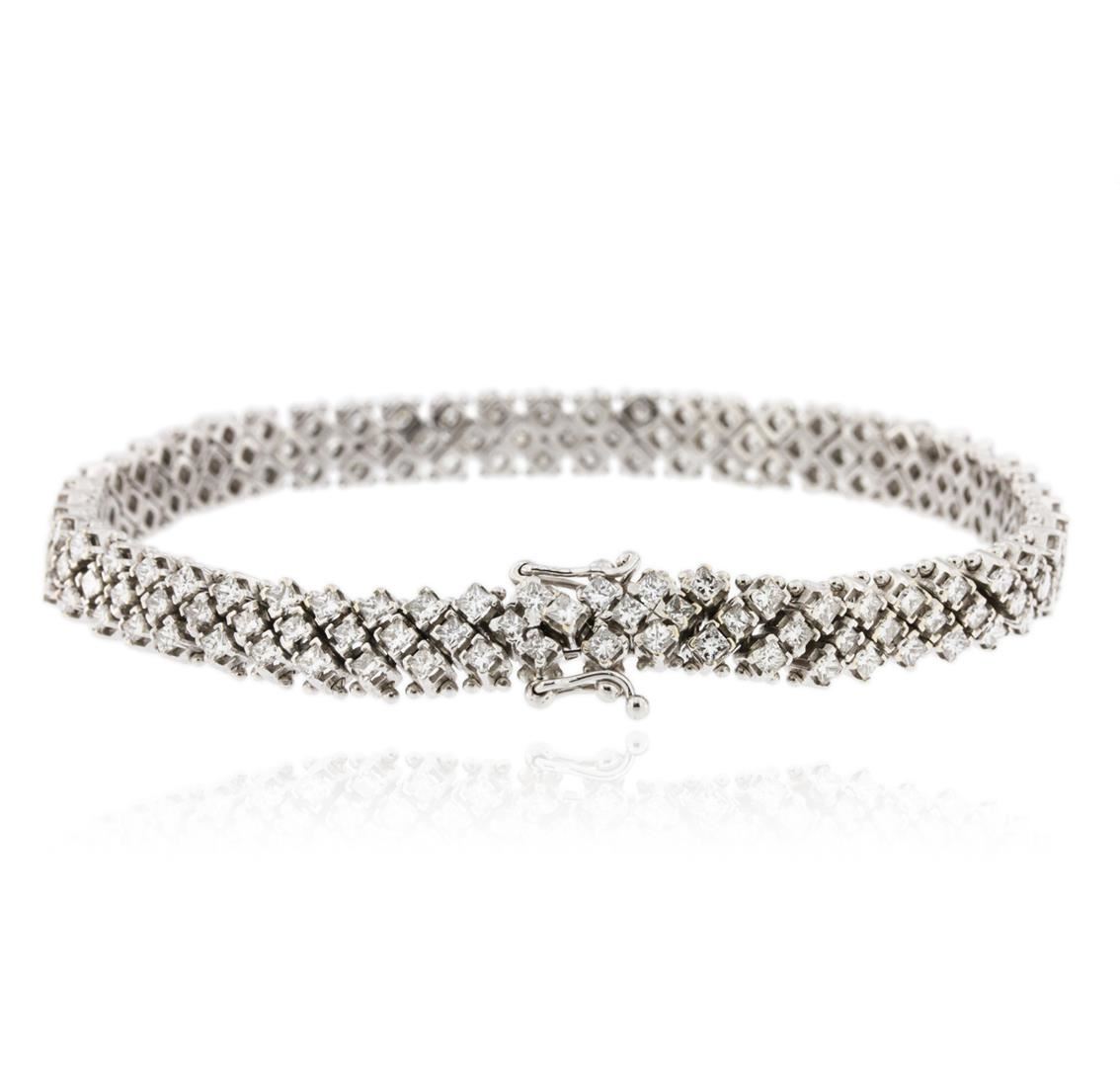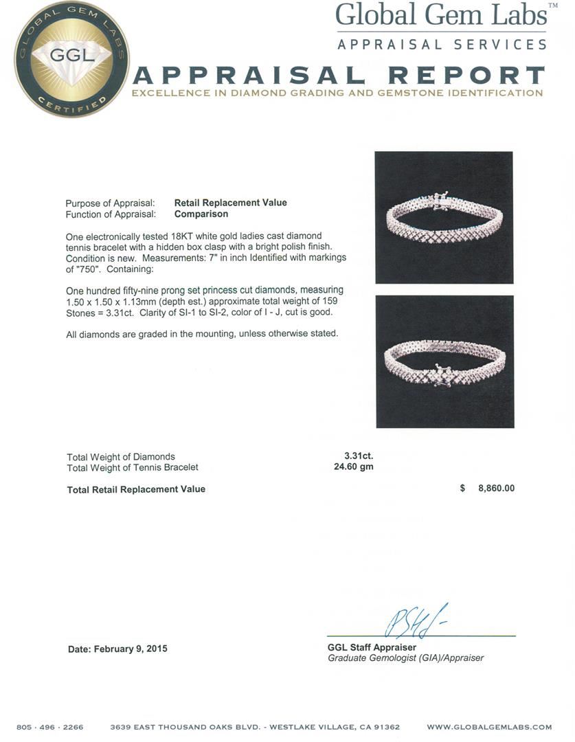 One electronically tested 18KT white gold ladies cast diamond tennis bracelet with a hidden box clasp with a bright polish finish. Measurements: 7" in inch Identified with markings of "750". Condition is new. Containing: One Hundred Fifty-Nine prong set princess cut diamonds, measuring 1.50 x 1.50 x 1.13mm (depth est.) approximate total weight of 159 Stones = 3.31ct. Clarity: SI-1 to SI-2. Color: I - J, Cut is Good. All diamonds are graded in the mounting, unless otherwise stated. Total Weight of Diamonds 3.31ct. Total Weight of Tennis Bracelet 24.60 grams. GGL Appraised at $8,860.00.