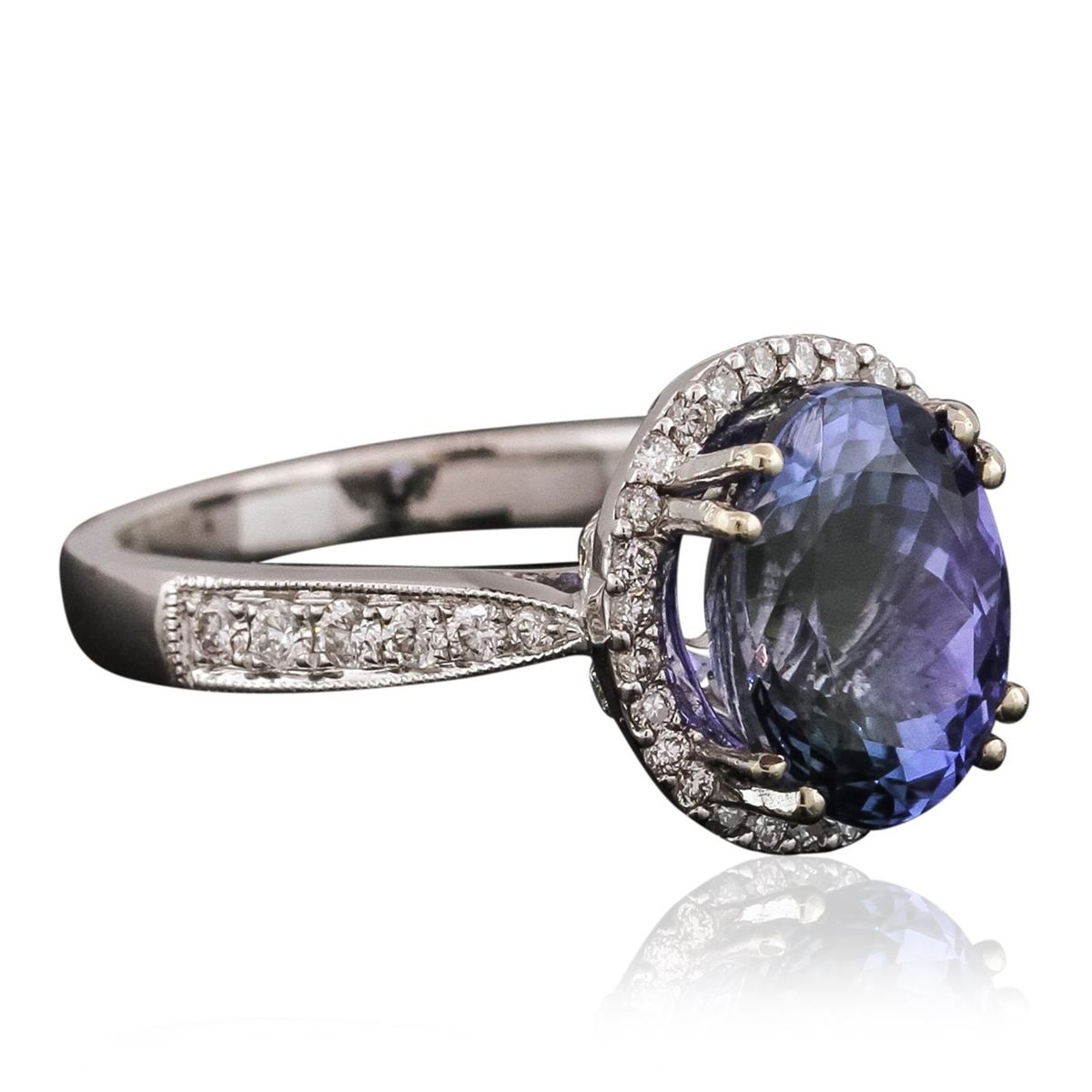 One electronically tested 18KT white gold ladies combination cast & assembled prong set ring with a flat shank with a bright polish finish. Identified with markings of "750 18K". Condition is new. Containing: One prong set oval modified brilliant cut natural tanzanite, measuring 10.18 x 7.65 x 6.21mm, approximate weight of 3.31ct., clarity is eye clean, type I, medium light, very slightly grayish, violet color, (GIA V 4/3), cut is good. Sixty prong set round brilliant cut diamonds, measuring 1.50 - 1.10 x 0.78mm (depth est.) approximate total weight of 60 Stones = 0.44ct. Clarity: SI-2. Color: I - J, Cut is Good. All diamonds are graded in the mounting, unless otherwise stated, Colored gemstones are presumed to have been subjected to commonly used enhancement processes. Total Weight of Colored Stones 3.31ct. Total Weight of Diamonds 0.44ct. Total Weight of Ring 5.10 grams. GGL Appraised at $7,970.00.