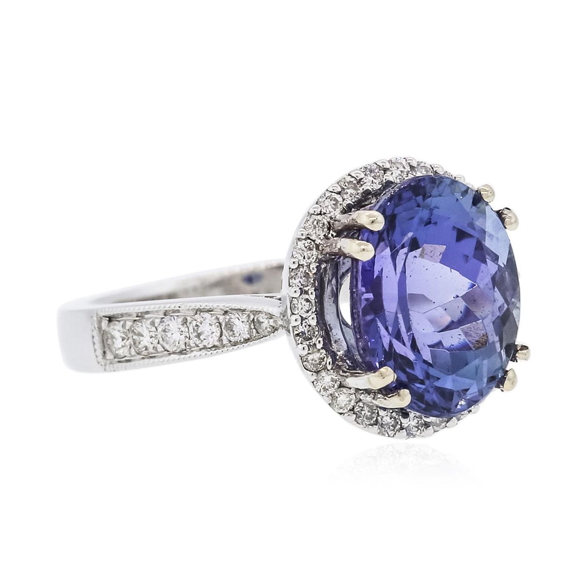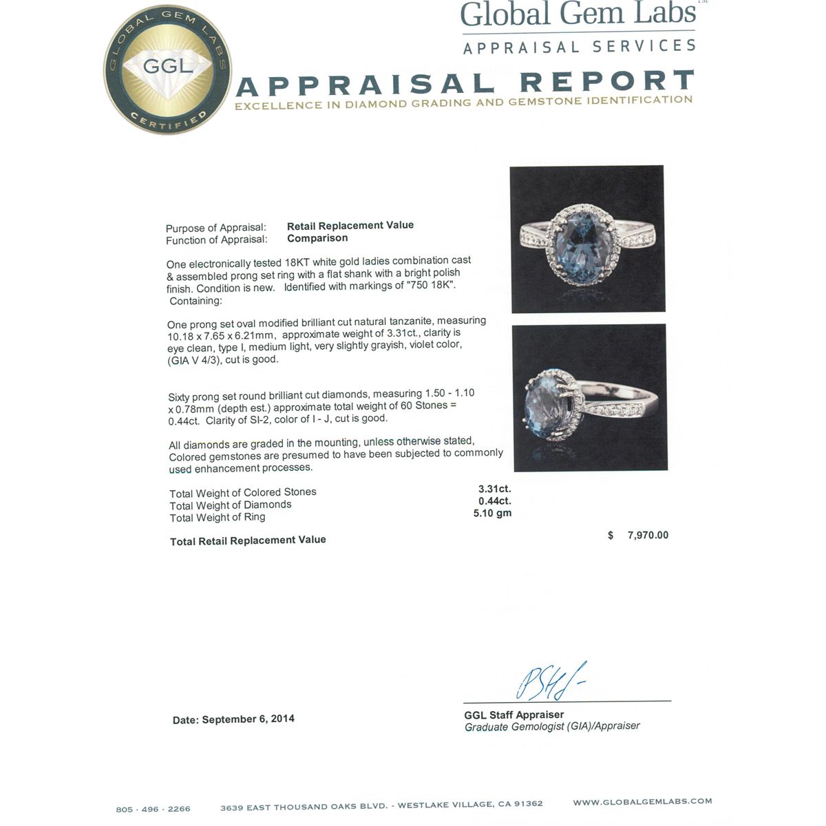 One electronically tested 18KT white gold ladies combination cast & assembled prong set ring with a flat shank with a bright polish finish. Identified with markings of "750 18K". Condition is new. Containing: One prong set oval modified brilliant cut natural tanzanite, measuring 10.18 x 7.65 x 6.21mm, approximate weight of 3.31ct., clarity is eye clean, type I, medium light, very slightly grayish, violet color, (GIA V 4/3), cut is good. Sixty prong set round brilliant cut diamonds, measuring 1.50 - 1.10 x 0.78mm (depth est.) approximate total weight of 60 Stones = 0.44ct. Clarity: SI-2. Color: I - J, Cut is Good. All diamonds are graded in the mounting, unless otherwise stated, Colored gemstones are presumed to have been subjected to commonly used enhancement processes. Total Weight of Colored Stones 3.31ct. Total Weight of Diamonds 0.44ct. Total Weight of Ring 5.10 grams. GGL Appraised at $7,970.00.