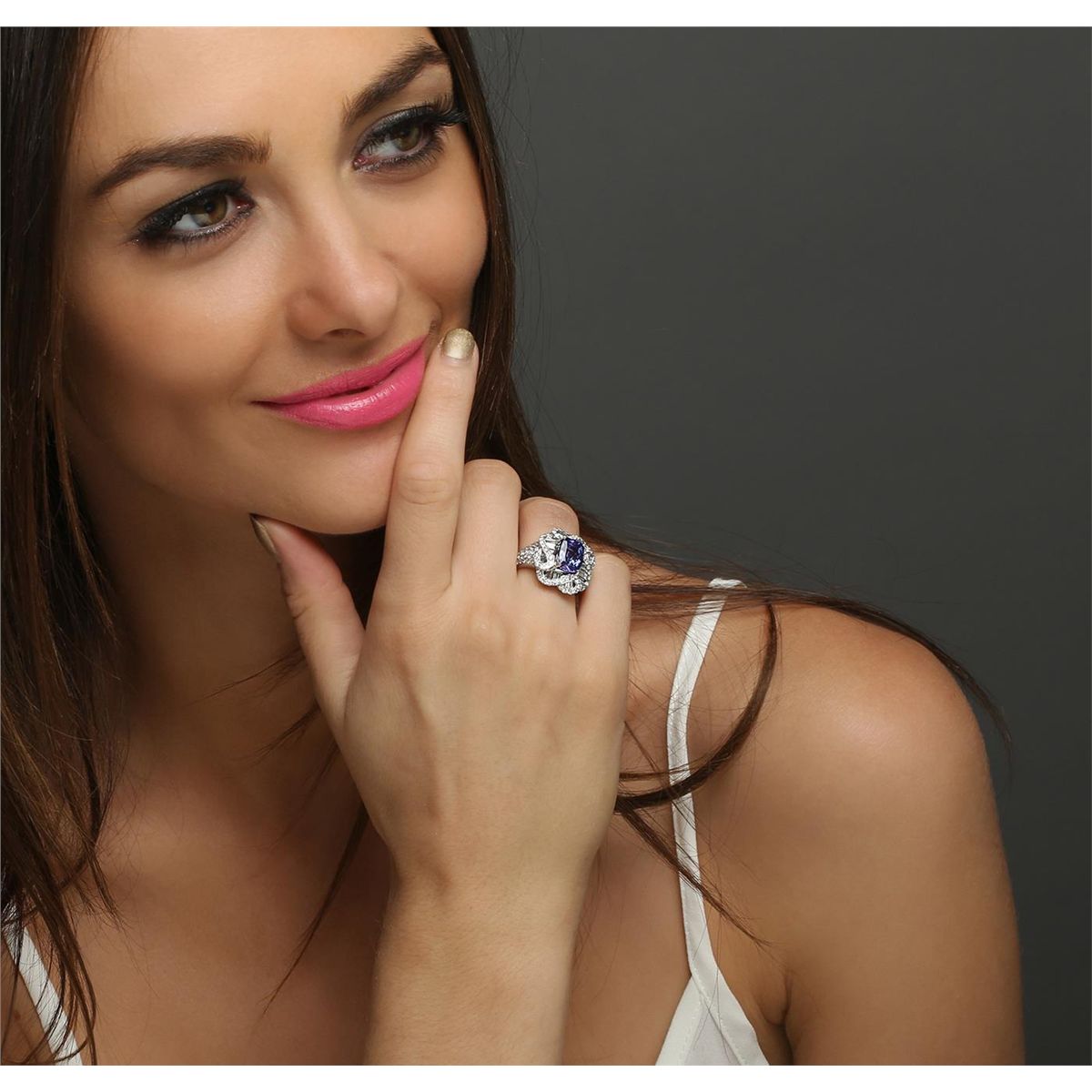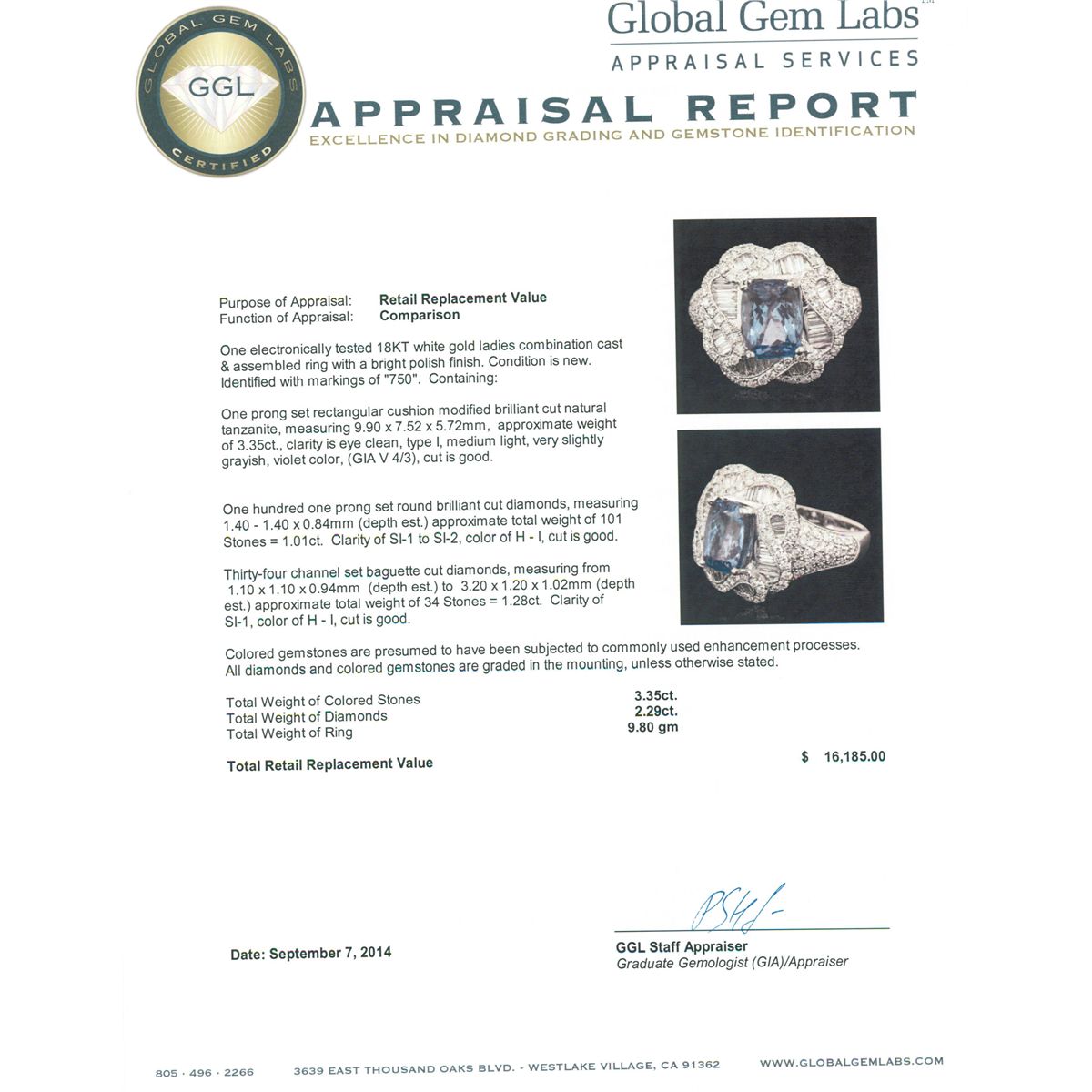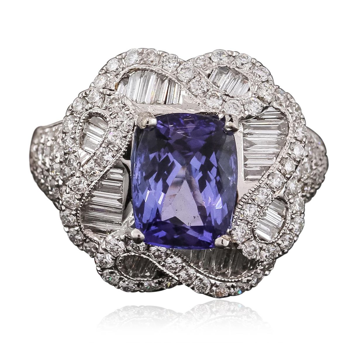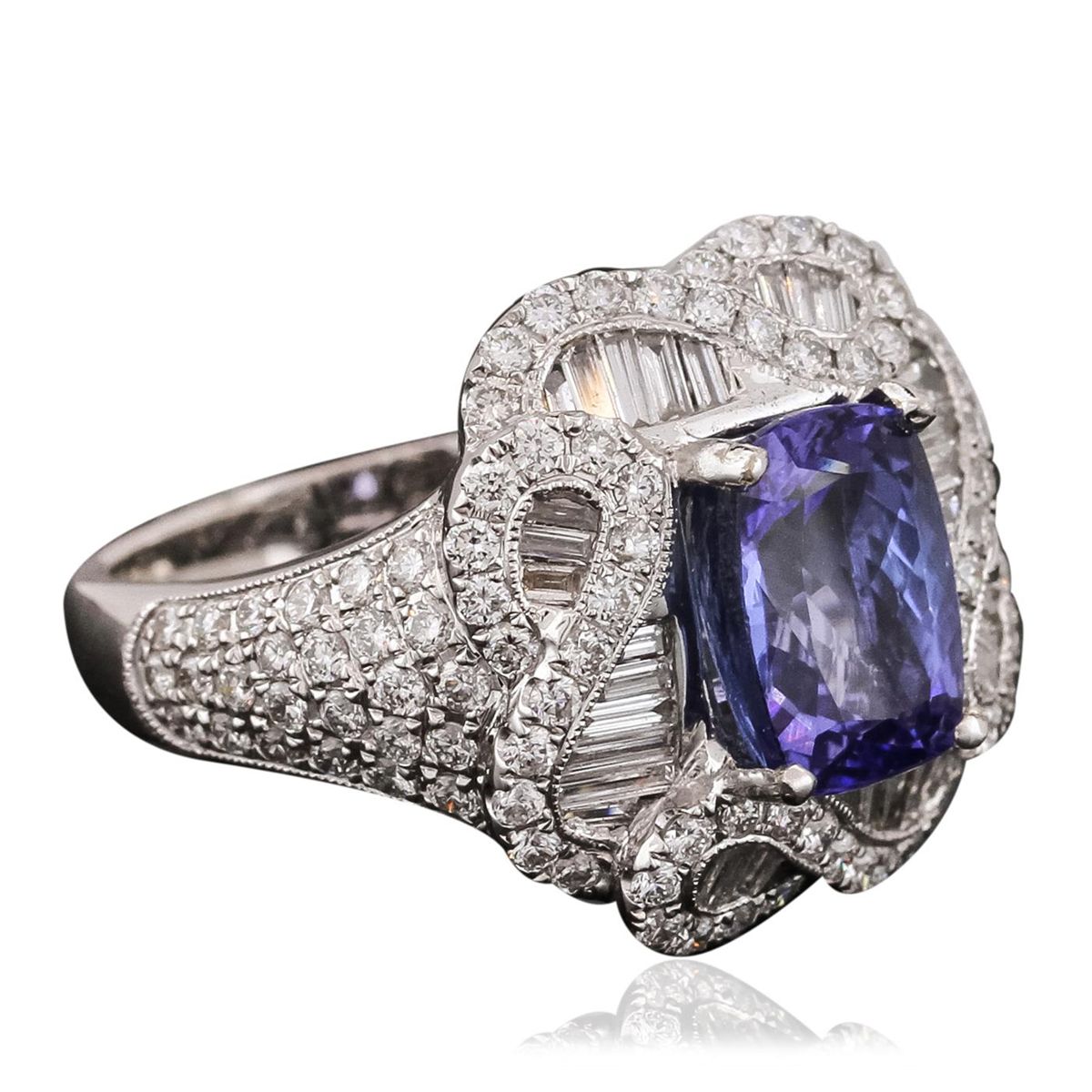 One electronically tested 18KT white gold ladies combination cast & assembled ring with a bright polish finish. Identified with markings of "750". Condition is new. Containing: One prong set rectangular cushion modified brilliant cut natural tanzanite, measuring 9.90 x 7.52 x 5.72mm, approximate weight of 3.35ct., clarity is eye clean, type I, medium light, very slightly grayish, violet color, (GIA V 4/3), cut is good. One Hundred One prong set round brilliant cut diamonds, measuring 1.40 - 1.40 x 0.84mm (depth est.) approximate total weight of 101 Stones = 1.01ct. Clarity: SI-1 to SI-2. Color: H - I, Cut is Good. Thirty-Four channel set baguette cut diamonds, measuring from 1.10 x 1.10 x 0.94mm (depth est.) to 3.20 x 1.20 x 1.02mm (depth est.) approximate total weight of 34 Stones = 1.28ct. Clarity: SI-1. Color: H - I, Cut is Good. Colored gemstones are presumed to have been subjected to commonly used enhancement processes. All diamonds and colored gemstones are graded in the mounting, unless otherwise stated. Total Weight of Colored Stones 3.35ct. Total Weight of Diamonds 2.29ct. Total Weight of Ring 9.80 grams. GGL Appraised at $16,185.00.