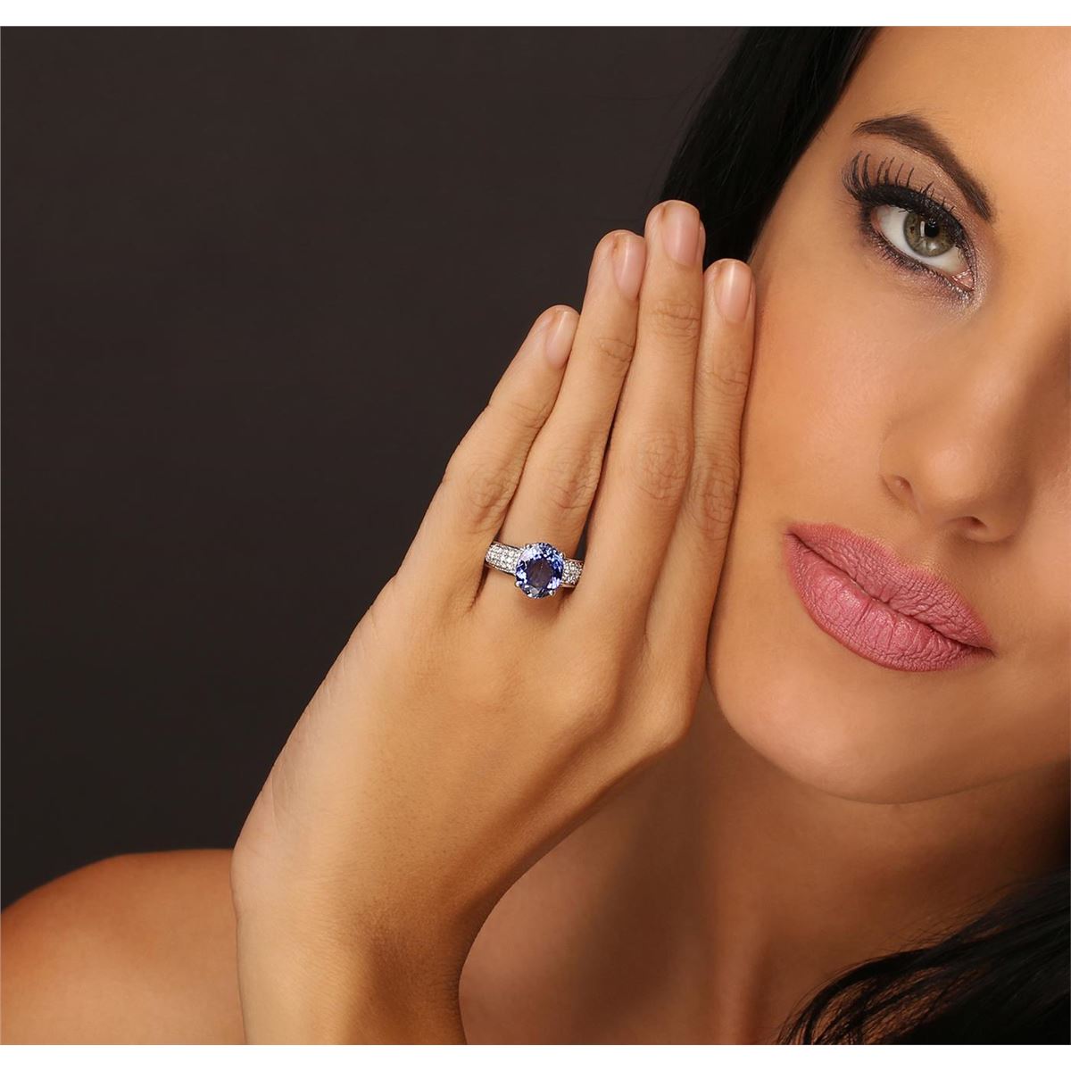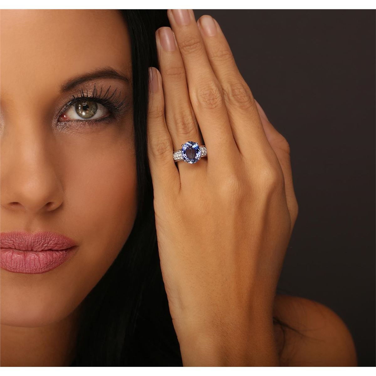 One electronically tested 18KT white gold Ladies combination cast & assembled ring with a bright polish finish. Condition is new. Identified with markings of "18K". Containing: One prong set oval modified brilliant cut natural tanzanite, measuring 11.25 x 9.40 x 4.70mm, approximate weight of 3.36ct., clarity is eye clean, type I, medium light, very slightly grayish, violet color, (GIA V 4/3), cut is good. Colored gemstones are presumed to have been subjected to commonly used color/clarity enhancement processes. Thirty-Six prong set round brilliant cut diamonds, measuring 1.30 - 1.30 x 0.78mm (depth est.) approximate total weight of 36 Stones = 0.29ct. Clarity of I-1 to I-2, Color of H - I, Cut is Good. Total Weight of Colored Stones 3.36ct. Total Weight of Diamonds 0.29ct. Total Weight of Ring 7.80 grams. GGL Appraised at $9,070.00.