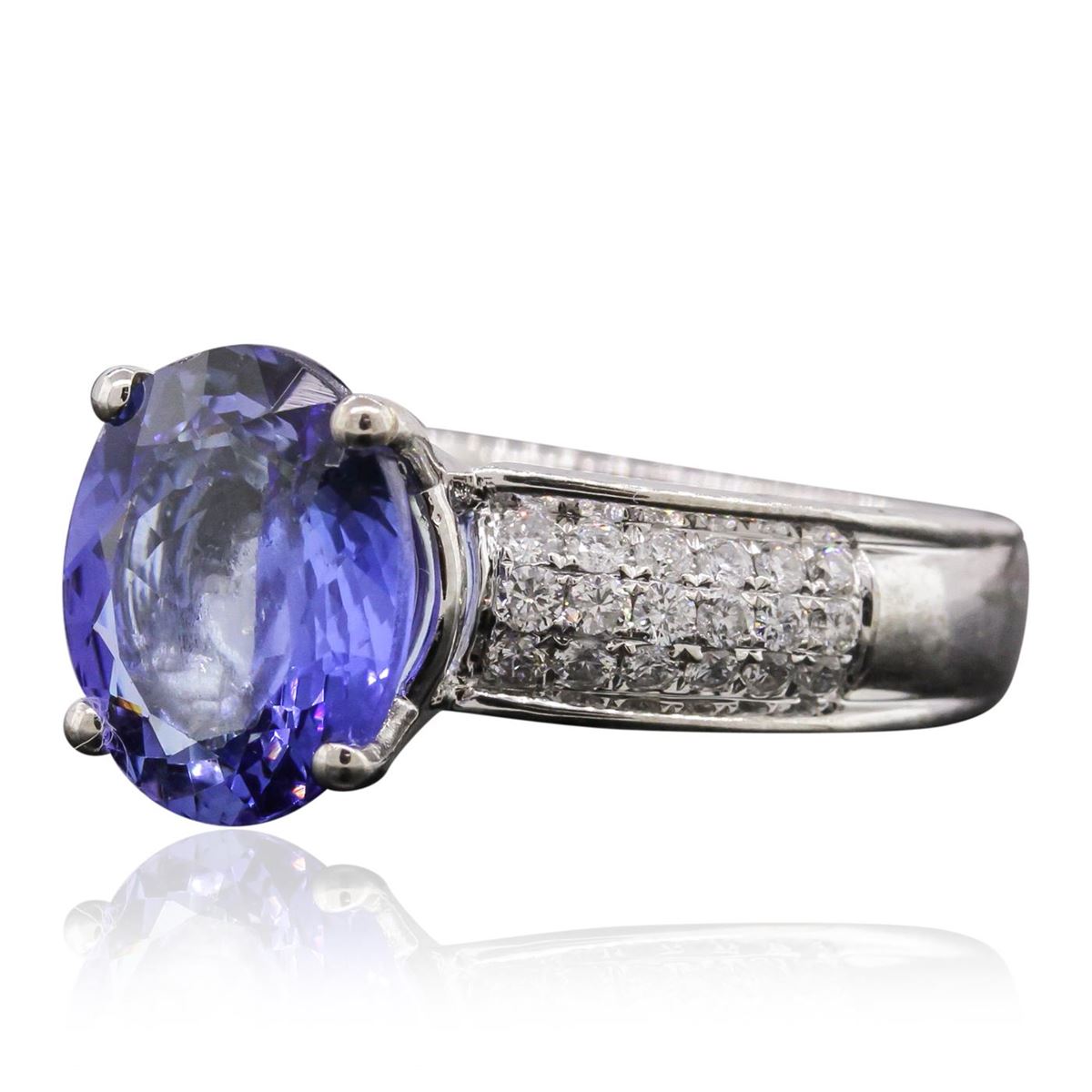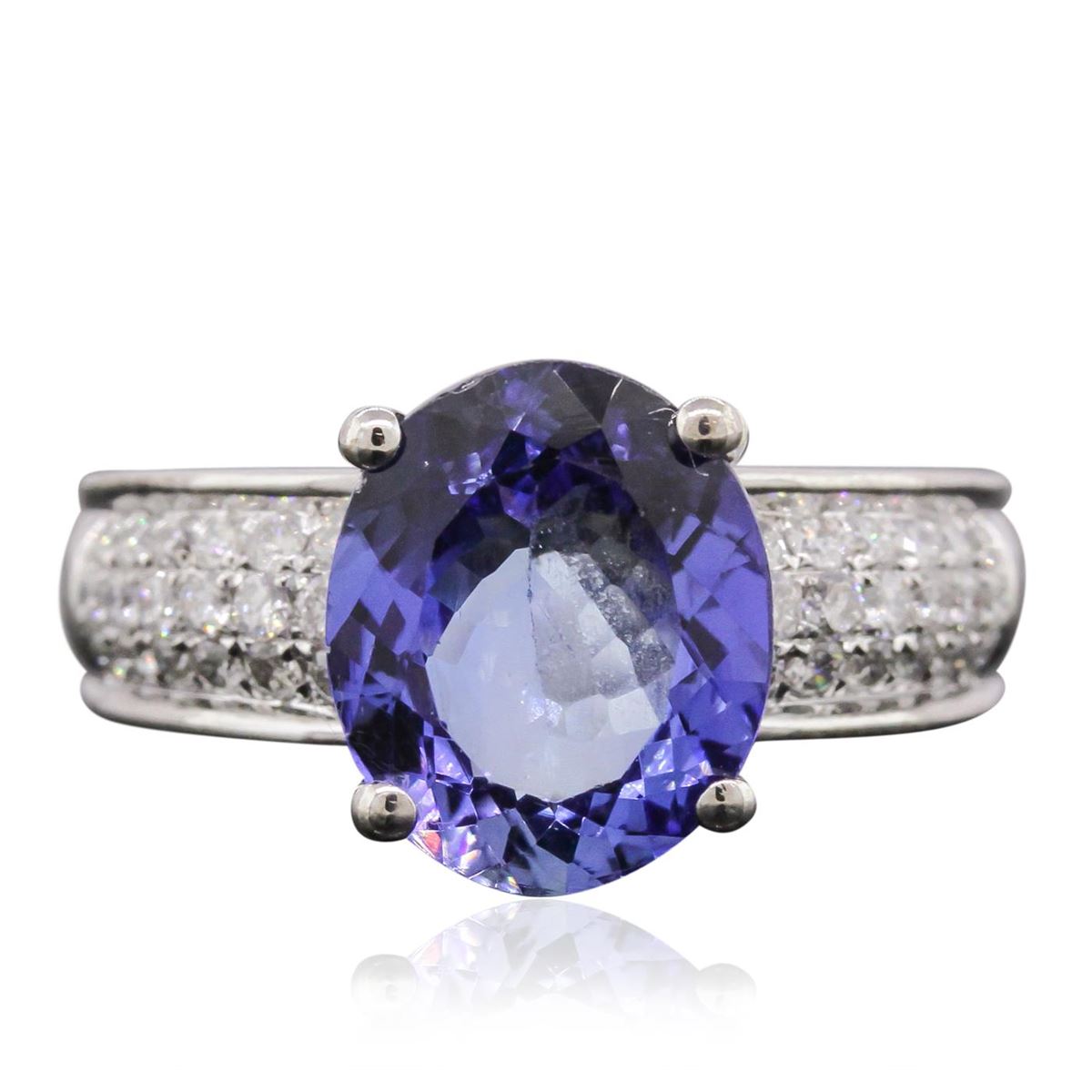 One electronically tested 18KT white gold Ladies combination cast & assembled ring with a bright polish finish. Condition is new. Identified with markings of "18K". Containing: One prong set oval modified brilliant cut natural tanzanite, measuring 11.25 x 9.40 x 4.70mm, approximate weight of 3.36ct., clarity is eye clean, type I, medium light, very slightly grayish, violet color, (GIA V 4/3), cut is good. Colored gemstones are presumed to have been subjected to commonly used color/clarity enhancement processes. Thirty-Six prong set round brilliant cut diamonds, measuring 1.30 - 1.30 x 0.78mm (depth est.) approximate total weight of 36 Stones = 0.29ct. Clarity of I-1 to I-2, Color of H - I, Cut is Good. Total Weight of Colored Stones 3.36ct. Total Weight of Diamonds 0.29ct. Total Weight of Ring 7.80 grams. GGL Appraised at $9,070.00.