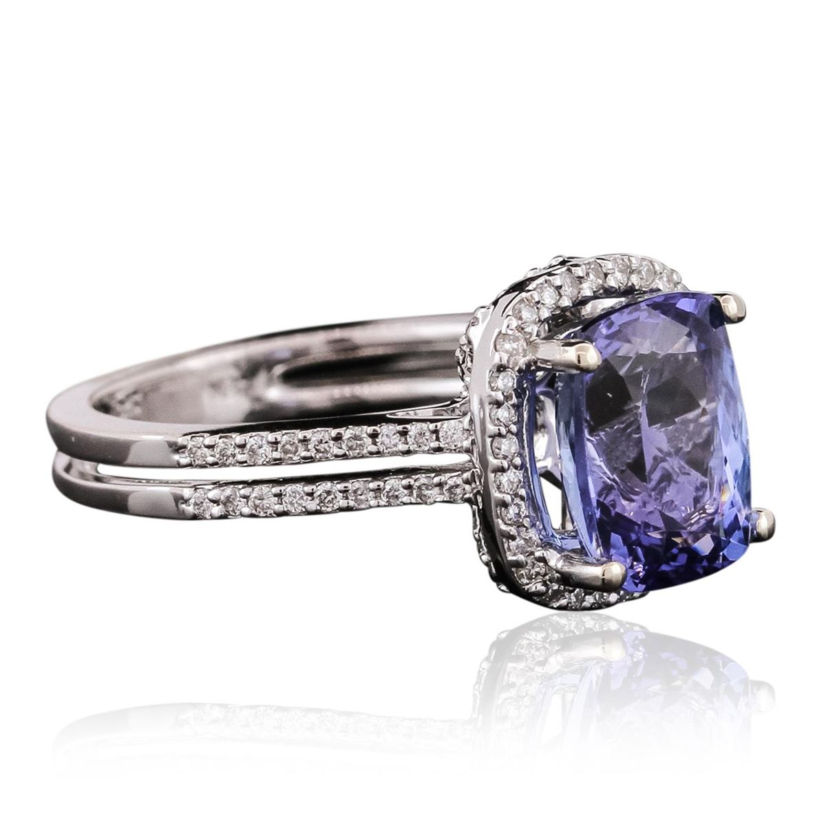 One electronically tested 18KT White Gold ladies cast tanzanite and diamond ring with a bright polish finish. The featured tanzanite is set within a diamond bezel supported by a diamond set under gallery and diamond set split shoulders, completed by a two and one-half millimeter wide band. Identified with markings of "18K 750". Condition is new, good workmanship. Containing: One prong set rectangular cushion mixed cut natural tanzanite, measuring 9.50 x 7.40 x 5.70mm, 8% bulge factor, approximate weight of 3.41ct., clarity is eye clean, type I, medium dark, slightly grayish, bluish violet color, (GIA bV 6/2), cut is good. Transmitting light with no distortion, transparent. Graded in the setting. Tanzanite is a very rare gemstone that is only found in the country of Tanzania. Originally discovered in 1967. Tiffany & Company, named the stone Tanzanite. It is found in the Usumburu Mountains that border the Umba Valley of northern Tanzania. Tanzanite occurs in gray, brown, violet, blue, reddish-purple, & green. The gem is interesting because of its exceptional pleochroism. Rotated in different directions a tanzanite will exhibit multiple changes of color. Tanzanite has a low tolerance to ultrasonic cleaning, and should not be cleaned using this method. Ninety-Six prong set round brilliant cut diamonds approximate total weight of 96 Stones = 0.39ct. Graded in the setting. Clarity: VS-1 to SI-1. Color: H - J. Total Weight of Colored Stones 3.41ct. Total Weight of Diamonds 0.39ct. Total Weight of Ring 5.38 grams. AIG Appraised at $9,505.00.