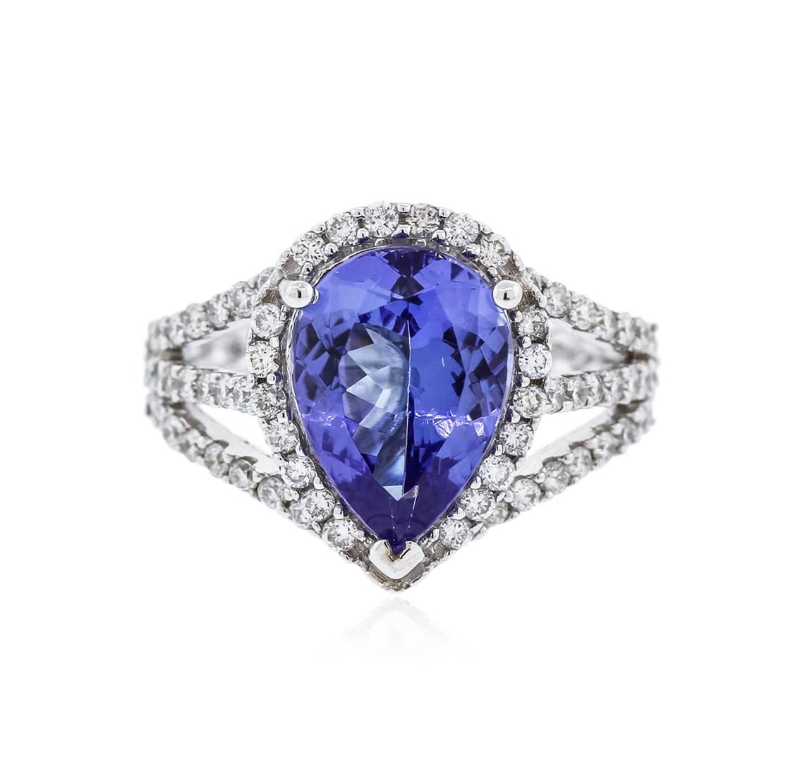 One electronically tested 18KT white gold ladies cast tanzanite and diamond ring with a bright polish finish. Identified with markings of "18K". Condition is new. Containing: One prong set pear modified brilliant cut natural tanzanite, measuring 13.00 x 7.80 x 5.07mm, approximate weight of 3.44ct., clarity is eye clean, type I, medium, moderately strong, violet color, (GIA V 5/4), cut is good. Seventy-Two prong set round brilliant cut diamonds, measuring 1.30 - 1.30 x 0.78mm (depth est.) approximate total weight of 72 Stones = 1.00ct. Clarity: SI-2 to I-2. Color: I - J. All diamonds and colored gemstones are graded in the mounting, unless otherwise stated. Colored gemstones are presumed to have been subjected to commonly used enhancement processes. Total Weight of Colored Stones 3.44ct. Total Weight of Diamonds 1.00ct. Total Weight of Ring 5.60 grams. GGL Appraised at $6,325.00.