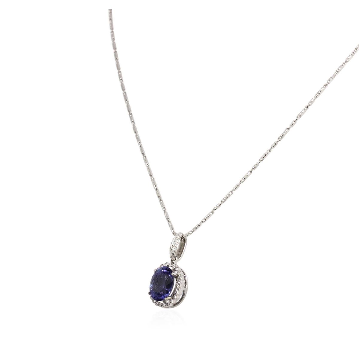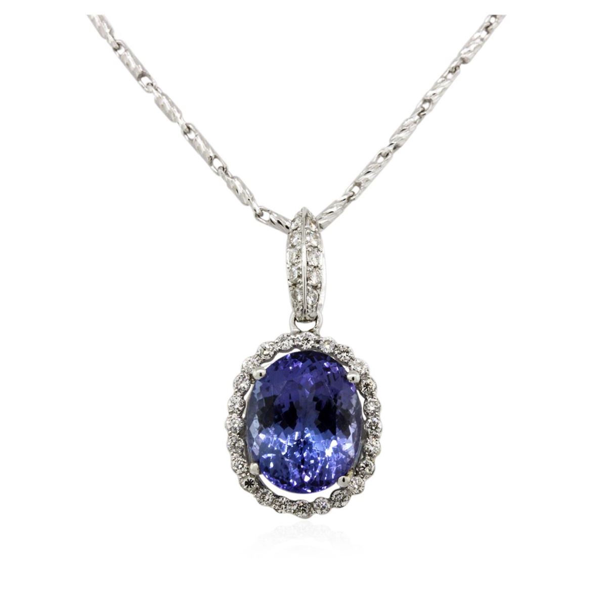 One electronically tested 18KT White Gold ladies cast & assembled tanzanite and diamond pendant with chain. The pendant features a tanzanite set within a diamond bezel, completed by a diamond set bail. The pendant is supported by an eighteen inch length 14KT White Gold designer style chain, terminating in a lobster claw clasp. Bright polish finish. Identified with markings of "18K". Condition is new, good workmanship. Containing: One prong set oval mixed cut natural tanzanite, measuring 10.10 x 8.00 x 5.90mm, 8% bulge factor, approximate weight of 3.50ct., clarity is eye clean, type I, medium dark, slightly grayish, bluish violet color, (GIA bV 6/2), cut is good. Transmitting light with no distortion, transparent. Graded in the setting. Tanzanite is a very rare gemstone that is only found in the country of Tanzania. Originally discovered in 1967. Tiffany & Company, named the stone Tanzanite. It is found in the Usumburu Mountains that border the Umba Valley of northern Tanzania. Tanzanite occurs in gray, brown, violet, blue, reddish-purple, & green. The gem is interesting because of its exceptional pleochroism. Rotated in different directions a tanzanite will exhibit multiple changes of color. Tanzanite has a low tolerance to ultrasonic cleaning, and should not be cleaned using this method. Thirty-Four prong set round brilliant cut diamonds, measuring 1.40 - 1.20 x 0.78mm (depth est.) approximate total weight of 34 Stones = 0.37ct. Graded in the setting. Clarity: VS-1 to SI-1. Color: G - I. Total Weight of Colored Stones 3.50ct. Total Weight of Diamonds 0.37ct. Total Weight of Pendant With Chain 6.67 grams. AIG Appraised at $9,740.00.