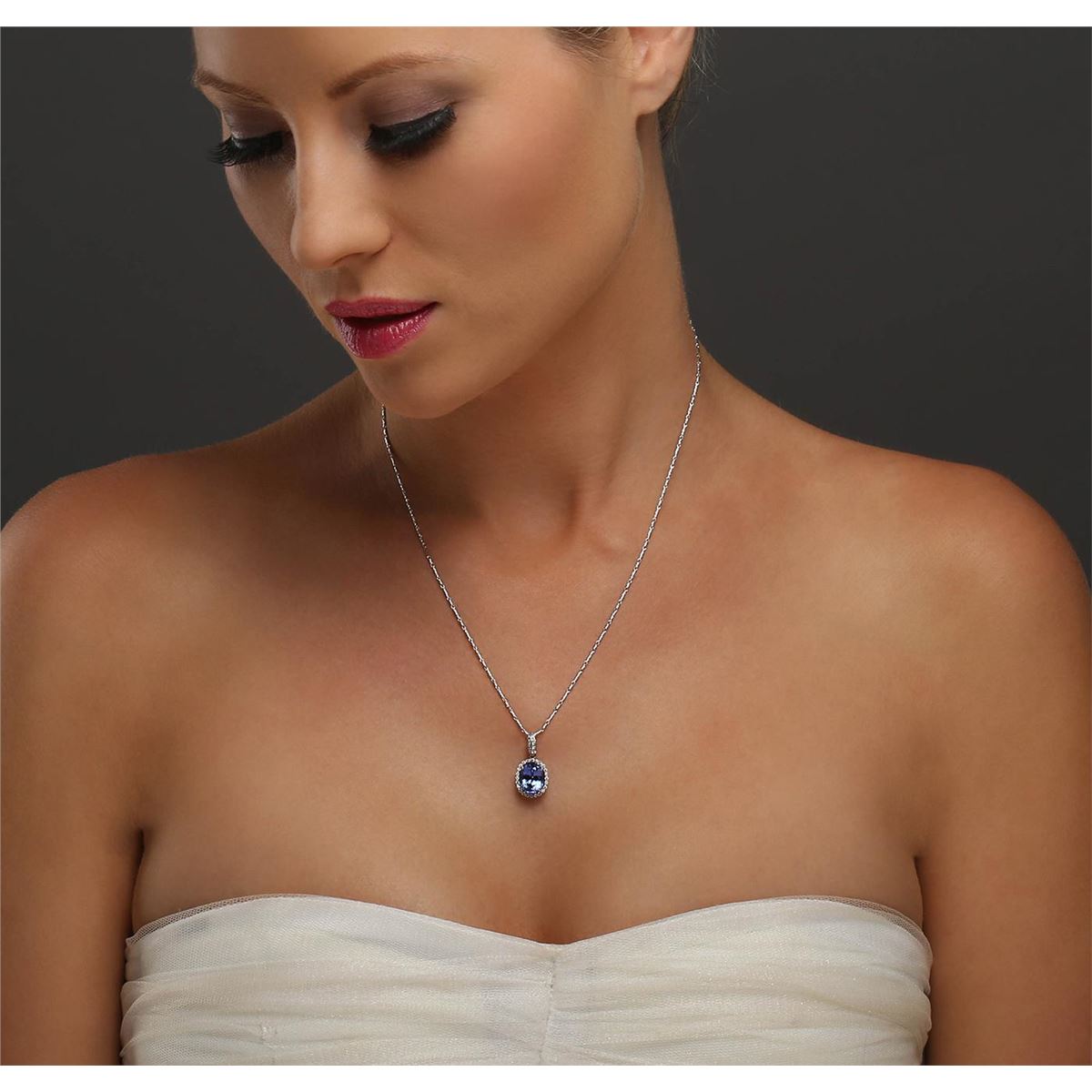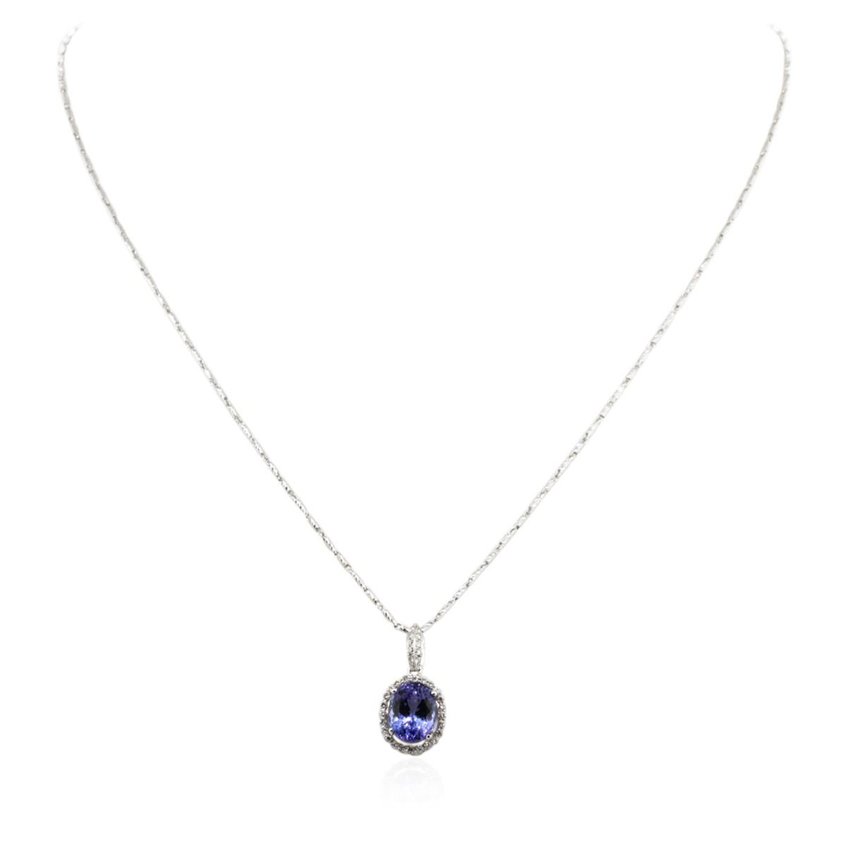 One electronically tested 18KT White Gold ladies cast & assembled tanzanite and diamond pendant with chain. The pendant features a tanzanite set within a diamond bezel, completed by a diamond set bail. The pendant is supported by an eighteen inch length 14KT White Gold designer style chain, terminating in a lobster claw clasp. Bright polish finish. Identified with markings of "18K". Condition is new, good workmanship. Containing: One prong set oval mixed cut natural tanzanite, measuring 10.10 x 8.00 x 5.90mm, 8% bulge factor, approximate weight of 3.50ct., clarity is eye clean, type I, medium dark, slightly grayish, bluish violet color, (GIA bV 6/2), cut is good. Transmitting light with no distortion, transparent. Graded in the setting. Tanzanite is a very rare gemstone that is only found in the country of Tanzania. Originally discovered in 1967. Tiffany & Company, named the stone Tanzanite. It is found in the Usumburu Mountains that border the Umba Valley of northern Tanzania. Tanzanite occurs in gray, brown, violet, blue, reddish-purple, & green. The gem is interesting because of its exceptional pleochroism. Rotated in different directions a tanzanite will exhibit multiple changes of color. Tanzanite has a low tolerance to ultrasonic cleaning, and should not be cleaned using this method. Thirty-Four prong set round brilliant cut diamonds, measuring 1.40 - 1.20 x 0.78mm (depth est.) approximate total weight of 34 Stones = 0.37ct. Graded in the setting. Clarity: VS-1 to SI-1. Color: G - I. Total Weight of Colored Stones 3.50ct. Total Weight of Diamonds 0.37ct. Total Weight of Pendant With Chain 6.67 grams. AIG Appraised at $9,740.00.