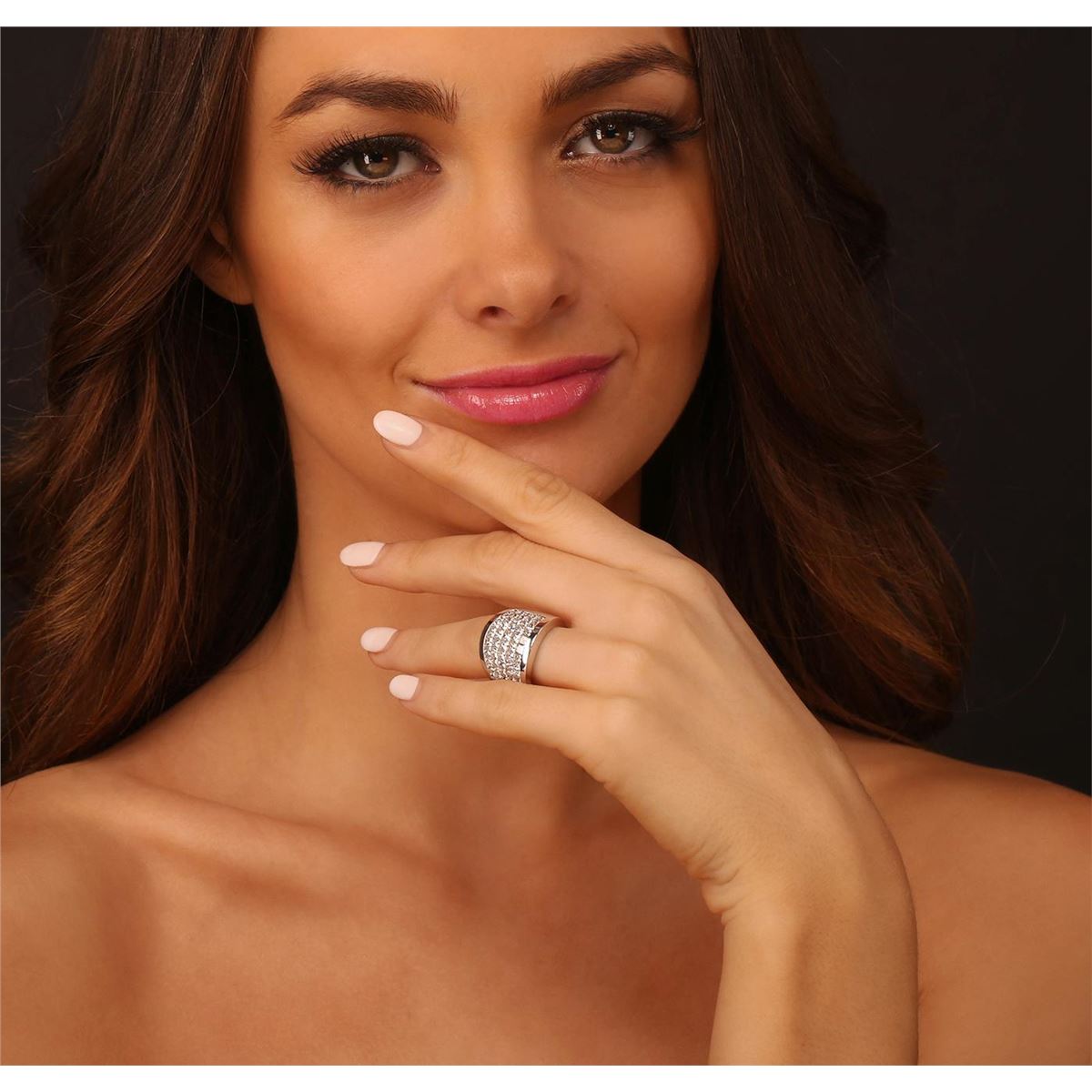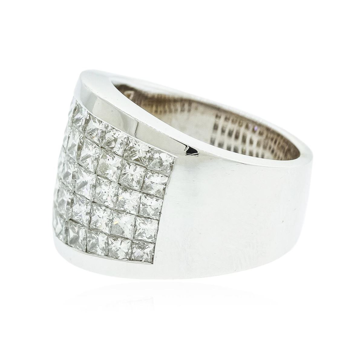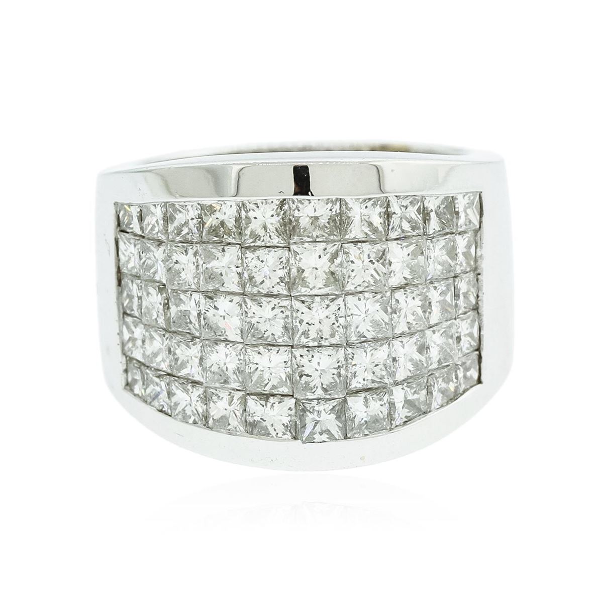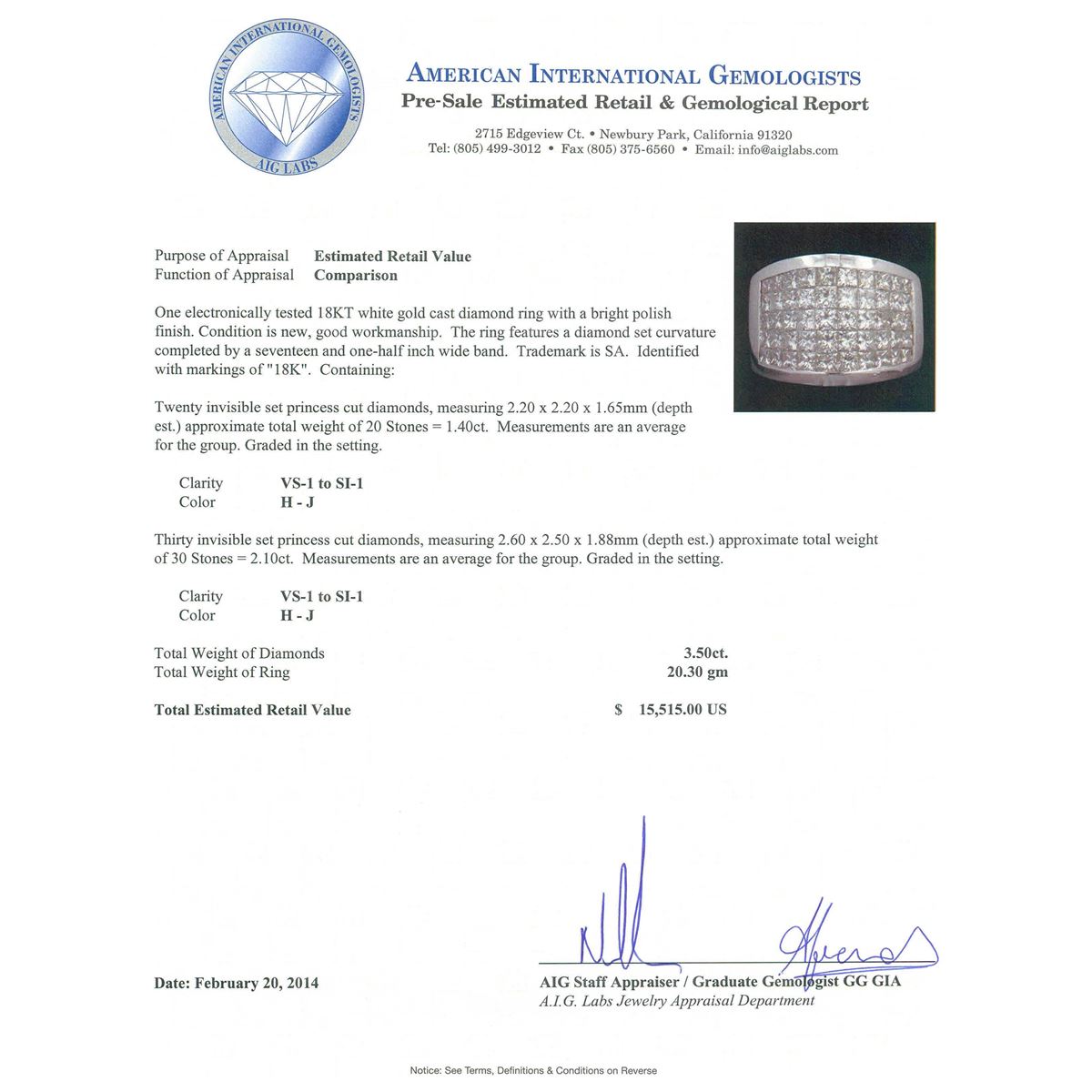 One electronically tested 18KT White Gold cast diamond ring with a bright polish finish. Condition is new, good workmanship. The ring features a diamond set curvature completed by a seventeen and one-half inch wide band. Trademark is SA. Identified with markings of "18K". Containing: Twenty invisible set princess cut diamonds, measuring 2.20 x 2.20 x 1.65mm (depth est.) approximate. Total Weight of 20 Stones = 1.40ct. Measurements are an average for the group. Graded in the setting. Clarity: VS-1 to SI-1. Color: H - J Thirty invisible set princess cut diamonds, measuring 2.60 x 2.50 x 1.88mm (depth est.) approximate. Total Weight of 30 Stones = 2.10ct. Measurements are an average for the group. Graded in the setting. Clarity: VS-1 to SI-1. Color: H - J. Total Weight of Diamonds 3.50ct. Total Weight of Ring 20.3 grams. AIG Appraised at $15,515.00.