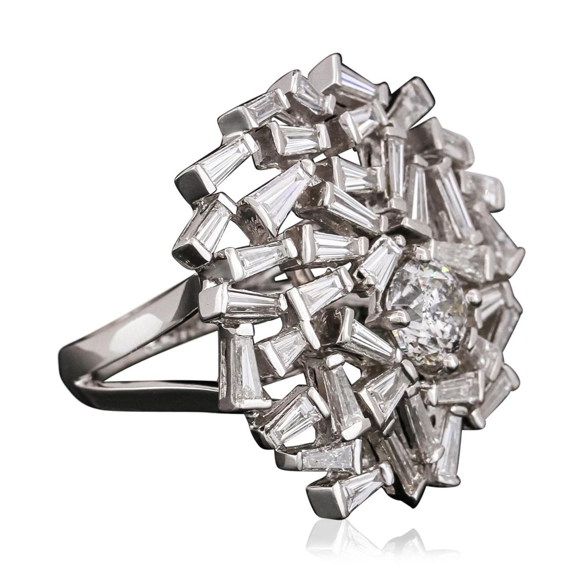 One electronically tested 18KT white gold ladies combination cast & assembled diamond ring with a bright polish finish. Identified with markings of "18K". Condition is new. Containing: One prong set round brilliant cut diamond, measuring 6.60 - 6.60 x 4.21mm (depth est.) approximate weight of 1.12ct. Clarity: I-2. Color: J, Cut is Good. Forty prong set baguette cut (tapered) diamonds, measuring from 2.50 x 1.50 x 1.28mm (depth est.) to 4.50 x 1.50 x 1.28mm (depth est.) approximate total weight of 40 Stones = 2.46ct. Clarity: VS-2 to SI-1. Color: H - I, Cut is Good. All diamonds are graded in the mounting, unless otherwise stated. Total Weight of Diamonds 3.58ct. Total Weight of Ring 12.10 grams. GGL Appraised at $25,280.00.