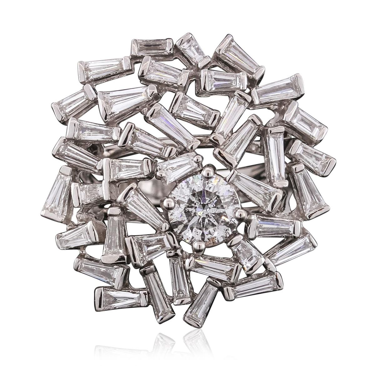 One electronically tested 18KT white gold ladies combination cast & assembled diamond ring with a bright polish finish. Identified with markings of "18K". Condition is new. Containing: One prong set round brilliant cut diamond, measuring 6.60 - 6.60 x 4.21mm (depth est.) approximate weight of 1.12ct. Clarity: I-2. Color: J, Cut is Good. Forty prong set baguette cut (tapered) diamonds, measuring from 2.50 x 1.50 x 1.28mm (depth est.) to 4.50 x 1.50 x 1.28mm (depth est.) approximate total weight of 40 Stones = 2.46ct. Clarity: VS-2 to SI-1. Color: H - I, Cut is Good. All diamonds are graded in the mounting, unless otherwise stated. Total Weight of Diamonds 3.58ct. Total Weight of Ring 12.10 grams. GGL Appraised at $25,280.00.