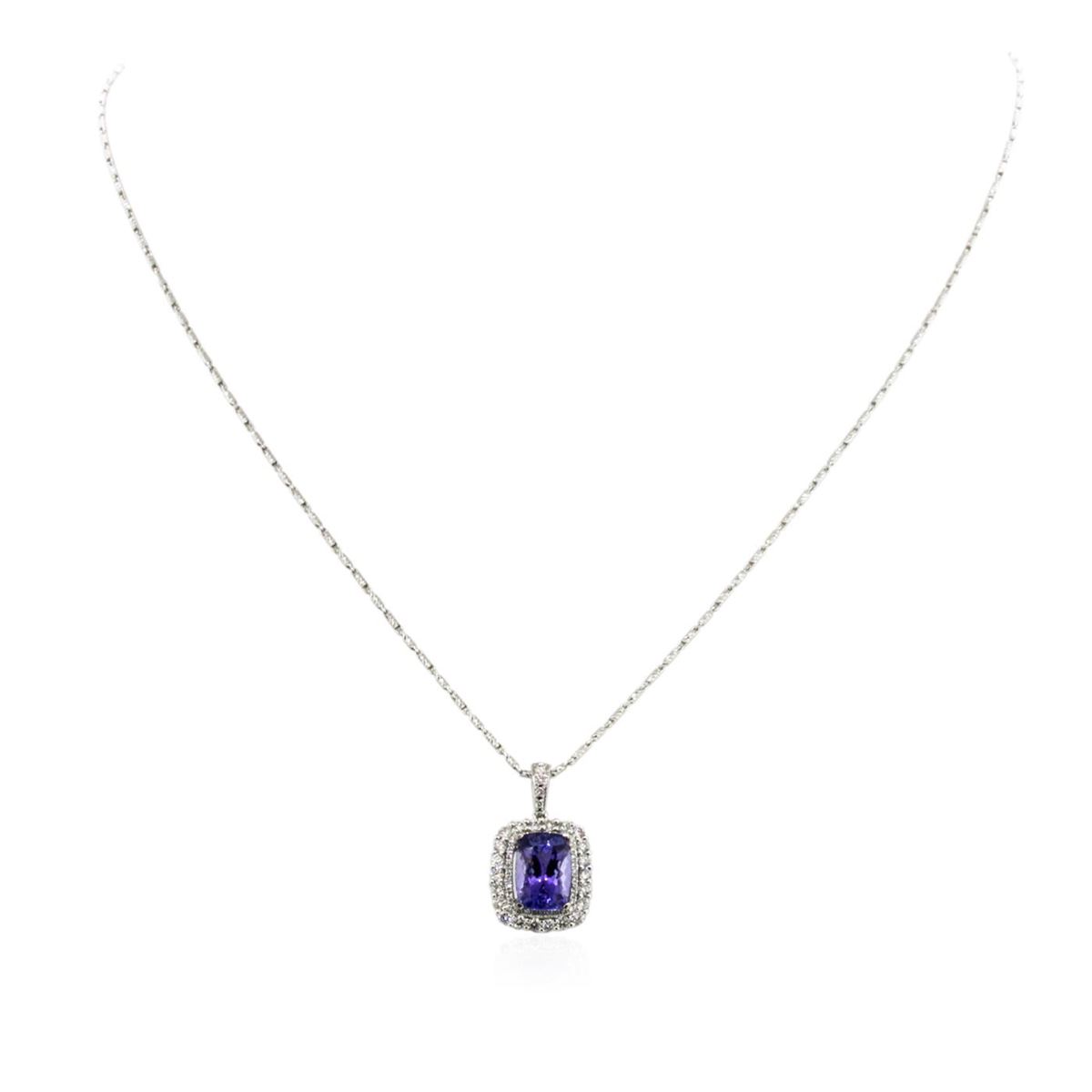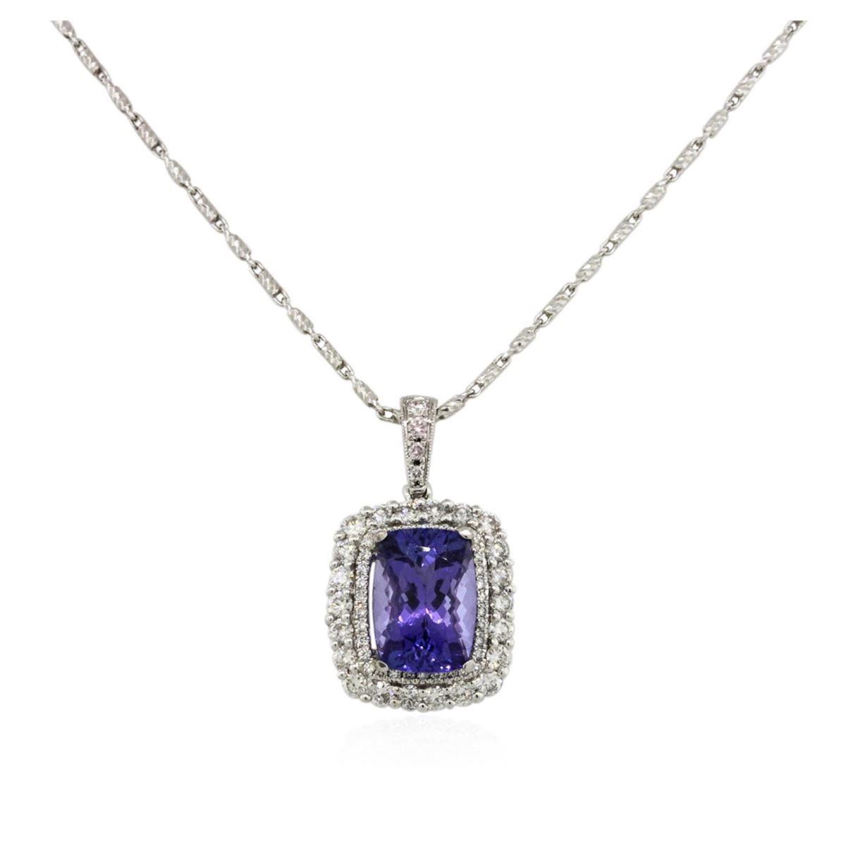 One electronically tested 18KT White Gold ladies cast tanzanite and diamond pendant with chain. The pendant features a tanzanite set within two tiered diamond bezels, completed by a diamond set bail. The pendant is supported by an eighteen inch length 14KT White Gold designer style chain, terminating in a lobster claw clasp. Bright polish finish. Identified with markings of "18K 750". Condition is new, good workmanship. Containing: One prong set rectangular cushion brilliant cut natural tanzanite, measuring 10.30 x 7.25 x 5.65mm, 8% bulge factor, approximate weight of 3.59ct., clarity is eye clean, type I, dark, very slightly grayish, bluish violet color, (GIA bV 7/3), cut is good. Transmitting light with no distortion, transparent. Graded in the setting. Tanzanite is a very rare gemstone that is only found in the country of Tanzania. Originally discovered in 1967. Tiffany & Company, named the stone Tanzanite. It is found in the Usumburu Mountains that border the Umba Valley of northern Tanzania. Tanzanite occurs in gray, brown, violet, blue, reddish-purple, & green. The gem is interesting because of its exceptional pleochroism. Rotated in different directions a tanzanite will exhibit multiple changes of color. Tanzanite has a low tolerance to ultrasonic cleaning, and should not be cleaned using this method. Twenty-Six prong set round brilliant cut diamonds, measuring 1.90 - 1.80 x 1.11mm (depth est.) approximate total weight of 26 Stones = 0.70ct. Graded in the setting. Clarity: VS-2 to SI-2. Color: G - I Thirty-Four prong set round brilliant cut diamonds, measuring 1.00 - 0.90 x 0.57mm (depth est.) approximate total weight of 34 Stones = 0.20ct. Graded in the setting. Clarity: VS-1 to SI-1. Color: G - I. Total Weight of Colored Stones 3.59ct. Total Weight of Diamonds 0.90ct. Total Weight of Pendant With Chain 6.27 grams. AIG Appraised at $13,310.00.