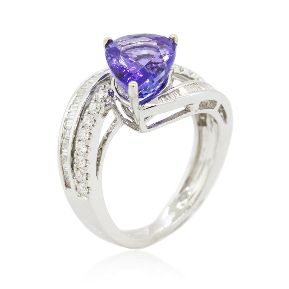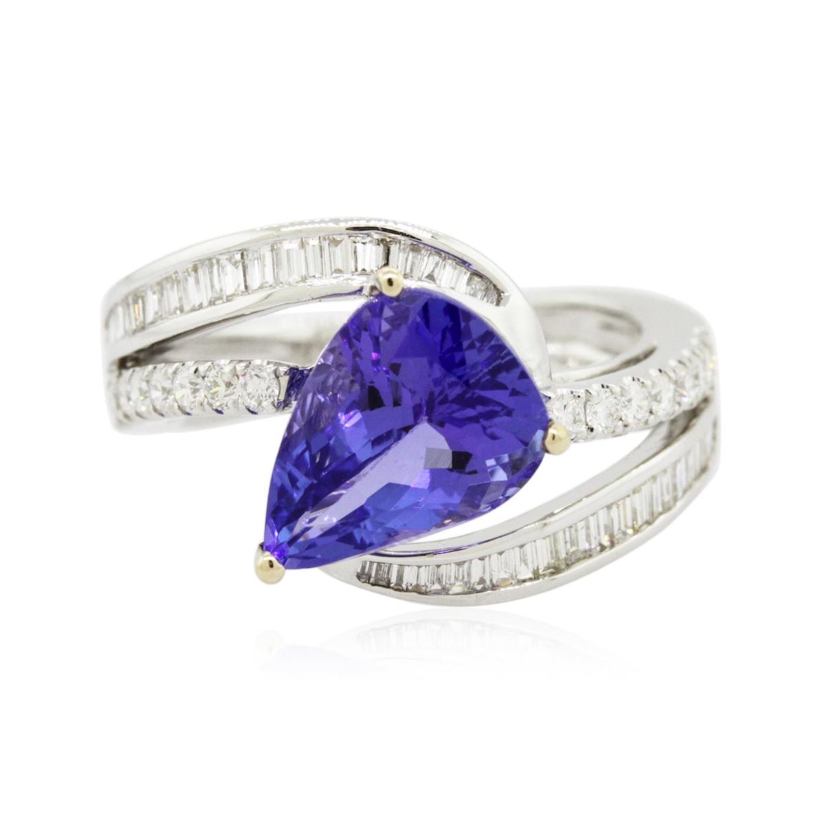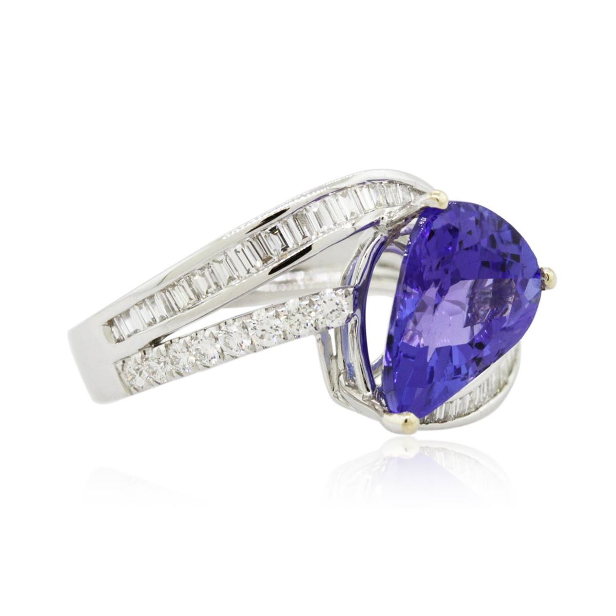 One electronically tested 18KT white gold ladies combination cast & assembled engagement ring with a bright polish finish. Identified with markings of "18K". Condition is new. Containing: One prong set pear modified brilliant cut natural tanzanite, measuring 11.90 x 8.32 x 5.41mm, approximate weight of 3.59ct., clarity is eye clean, type I, medium light, moderately strong, bluish violet color, (GIA bV 4/4), cut is good. Sixteen prong set round brilliant cut diamonds, measuring 1.80 - 1.80 x 1.08mm (depth est.) approximate total weight of 16 Stones = 0.34ct. Clarity: SI-1 to SI-2. Color: I - J, Cut is Good. Forty-Six channel set baguette cut diamonds, measuring 1.80 x 1.80 x 1.53mm (depth est.) approximate total weight of 46 Stones = 0.46ct. Clarity: VS-2 to SI-1. Color: I - J, Cut is Good. Colored gemstones are presumed to have been subjected to commonly used enhancement processes. All diamonds and colored gemstones are graded in the mounting, unless otherwise stated. Total Weight of Colored Stones 3.59ct. Total Weight of Diamonds 0.80ct. Total Weight of Ring 6.80 grams. GGL Appraised at $10,330.00.