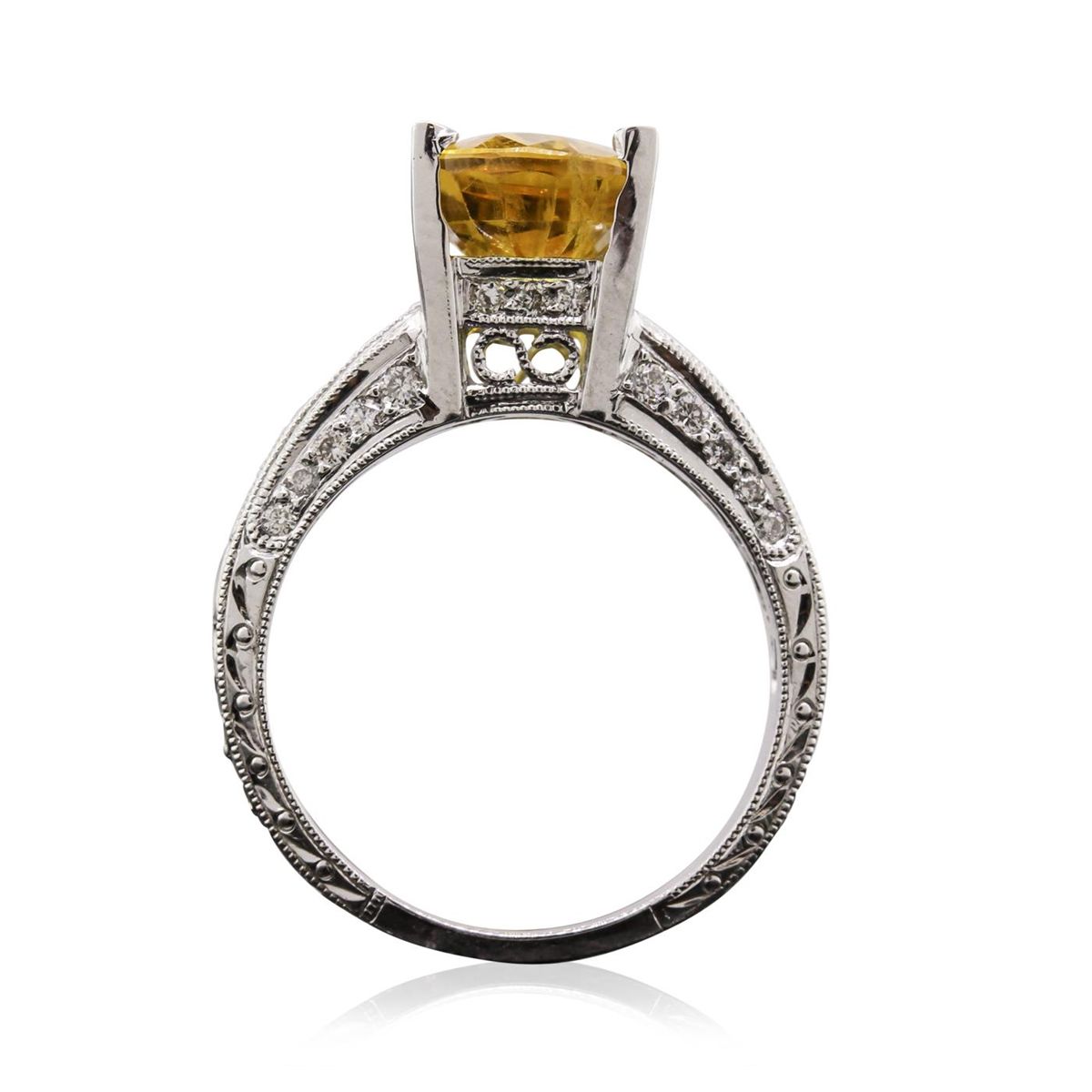 One electronically tested 18KT white gold Ladies combination cast & assembled ring with a engraved finish. Condition is new. Identified with markings of "18K". Containing: One prong set oval modified brilliant cut natural yellow sapphire, measuring 10.50 x 7.90 x 5.30mm, approximate weight of 3.59ct., clarity is eye clean, type II, medium light, brownish, yellow color, (GIA Y 4/3), cut is very good. Colored gemstones are presumed to have been subjected to commonly used color/clarity enhancement processes. Twenty-Six bead set round brilliant cut diamonds, measuring 1.40 - 1.30 x 0.81mm (depth est.) approximate. Total Weight of 26 Stones = 0.23ct. Clarity: SI-1 to I-1. Color: I - J, Cut is Good. Eight channel set baguette cut diamonds, measuring from 2.00 x 1.50 x 1.28mm (depth est.) to 2.50 x 1.50 x 1.28mm (depth est.) approximate. Total Weight of 8 Stones = 0.32ct. Clarity: VS-2. Color: I - J, Cut is Very Good. Total Weight of Colored Stones 3.59ct. Total Weight of Diamonds 0.55ct. Total Weight of Ring 6.50 grams. GGL Appraised at $6,965.00.