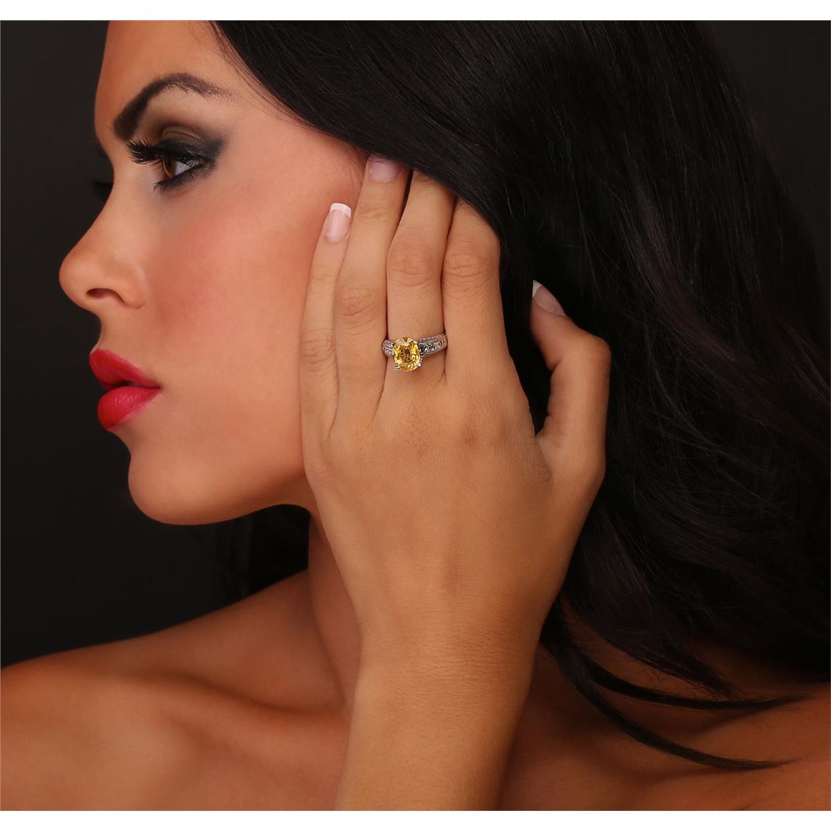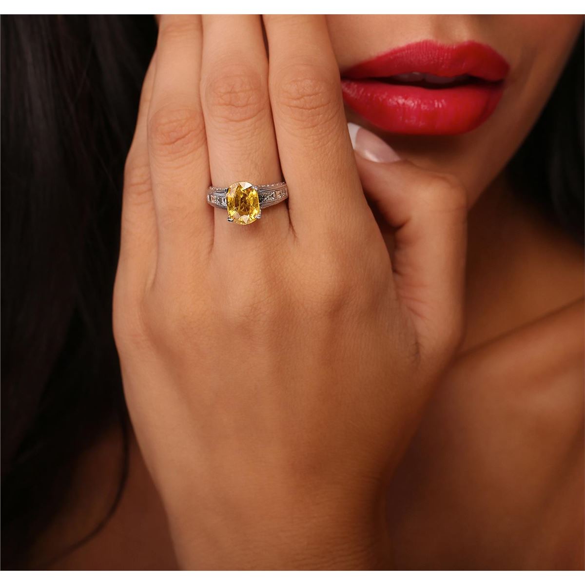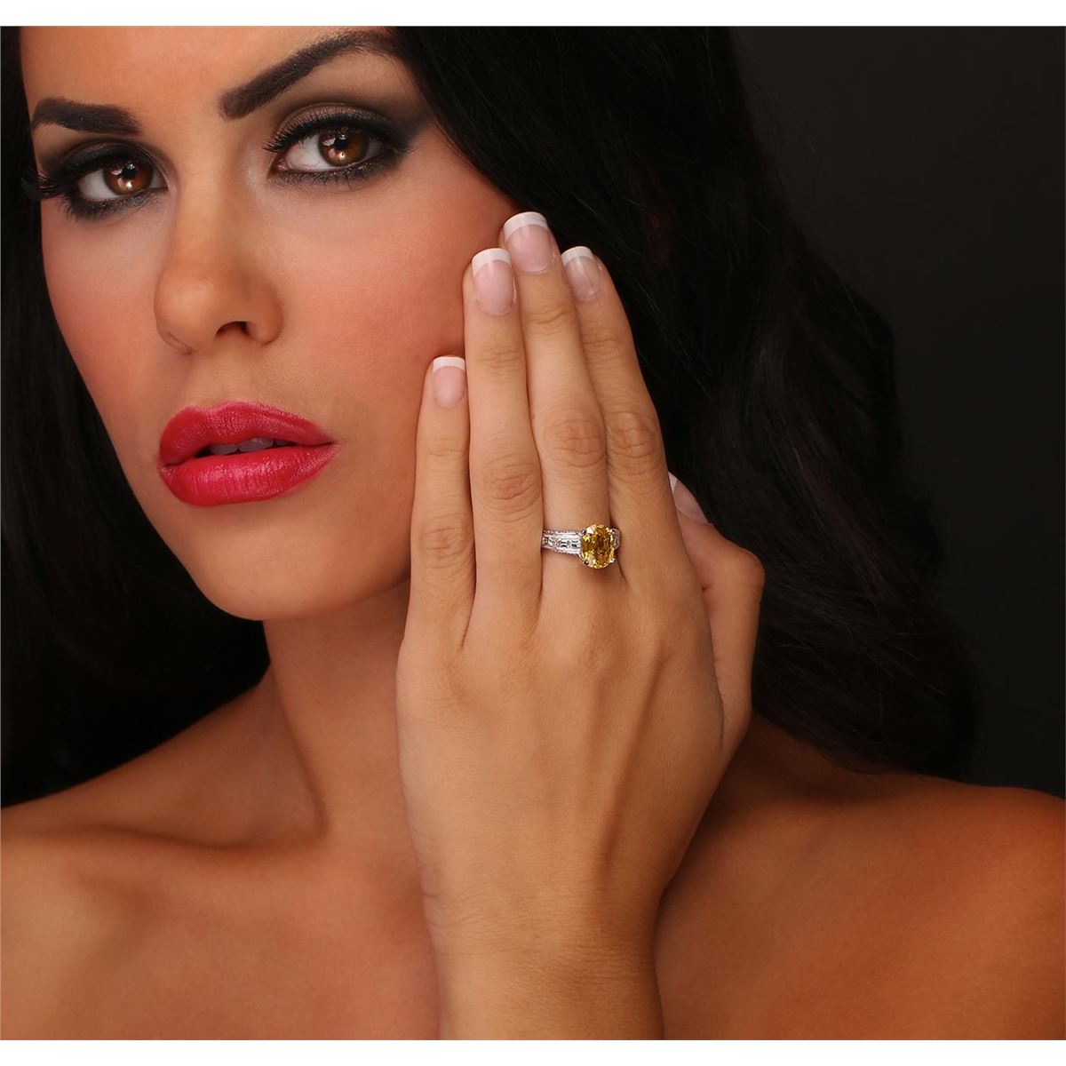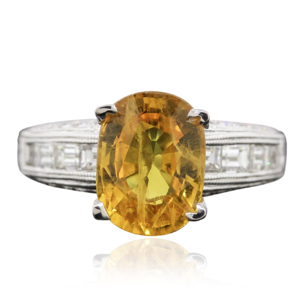 One electronically tested 18KT white gold Ladies combination cast & assembled ring with a engraved finish. Condition is new. Identified with markings of "18K". Containing: One prong set oval modified brilliant cut natural yellow sapphire, measuring 10.50 x 7.90 x 5.30mm, approximate weight of 3.59ct., clarity is eye clean, type II, medium light, brownish, yellow color, (GIA Y 4/3), cut is very good. Colored gemstones are presumed to have been subjected to commonly used color/clarity enhancement processes. Twenty-Six bead set round brilliant cut diamonds, measuring 1.40 - 1.30 x 0.81mm (depth est.) approximate. Total Weight of 26 Stones = 0.23ct. Clarity: SI-1 to I-1. Color: I - J, Cut is Good. Eight channel set baguette cut diamonds, measuring from 2.00 x 1.50 x 1.28mm (depth est.) to 2.50 x 1.50 x 1.28mm (depth est.) approximate. Total Weight of 8 Stones = 0.32ct. Clarity: VS-2. Color: I - J, Cut is Very Good. Total Weight of Colored Stones 3.59ct. Total Weight of Diamonds 0.55ct. Total Weight of Ring 6.50 grams. GGL Appraised at $6,965.00.