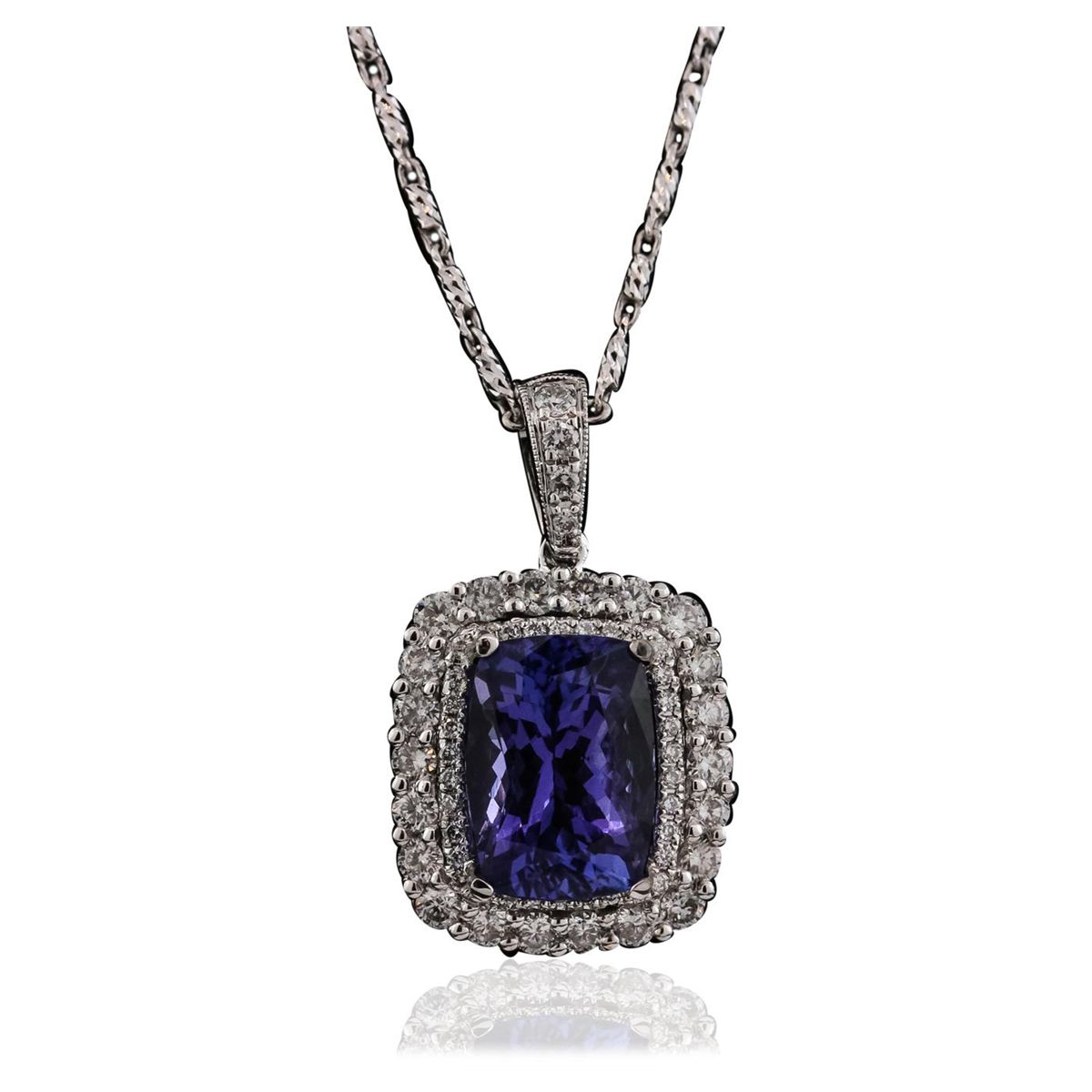One electronically tested 18KT White Gold ladies cast tanzanite and diamond pendant with chain. The pendant features a tanzanite set within two tiered diamond bezels, completed by a diamond set bail. The pendant is supported by an eighteen inch length 14KT White Gold designer style chain, terminating in a lobster claw clasp. Bright polish finish. Identified with markings of "18K 750". Condition is new, good workmanship. Containing: One prong set rectangular cushion brilliant cut natural tanzanite, measuring 10.30 x 7.25 x 5.65mm, 8% bulge factor, approximate weight of 3.59ct., clarity is eye clean, type I, dark, very slightly grayish, bluish violet color, (GIA bV 7/3), cut is good. Transmitting light with no distortion, transparent. Graded in the setting. Tanzanite is a very rare gemstone that is only found in the country of Tanzania. Originally discovered in 1967. Tiffany & Company, named the stone Tanzanite. It is found in the Usumburu Mountains that border the Umba Valley of northern Tanzania. Tanzanite occurs in gray, brown, violet, blue, reddish-purple, & green. The gem is interesting because of its exceptional pleochroism. Rotated in different directions a tanzanite will exhibit multiple changes of color. Tanzanite has a low tolerance to ultrasonic cleaning, and should not be cleaned using this method. Twenty-Six prong set round brilliant cut diamonds, measuring 1.90 - 1.80 x 1.11mm (depth est.) approximate total weight of 26 Stones = 0.70ct. Graded in the setting. Clarity: VS-2 to SI-2. Color: G - I Thirty-Four prong set round brilliant cut diamonds, measuring 1.00 - 0.90 x 0.57mm (depth est.) approximate total weight of 34 Stones = 0.20ct. Graded in the setting. Clarity: VS-1 to SI-1. Color: G - I. Total Weight of Colored Stones 3.59ct. Total Weight of Diamonds 0.90ct. Total Weight of Pendant With Chain 6.27 grams. AIG Appraised at $13,310.00.