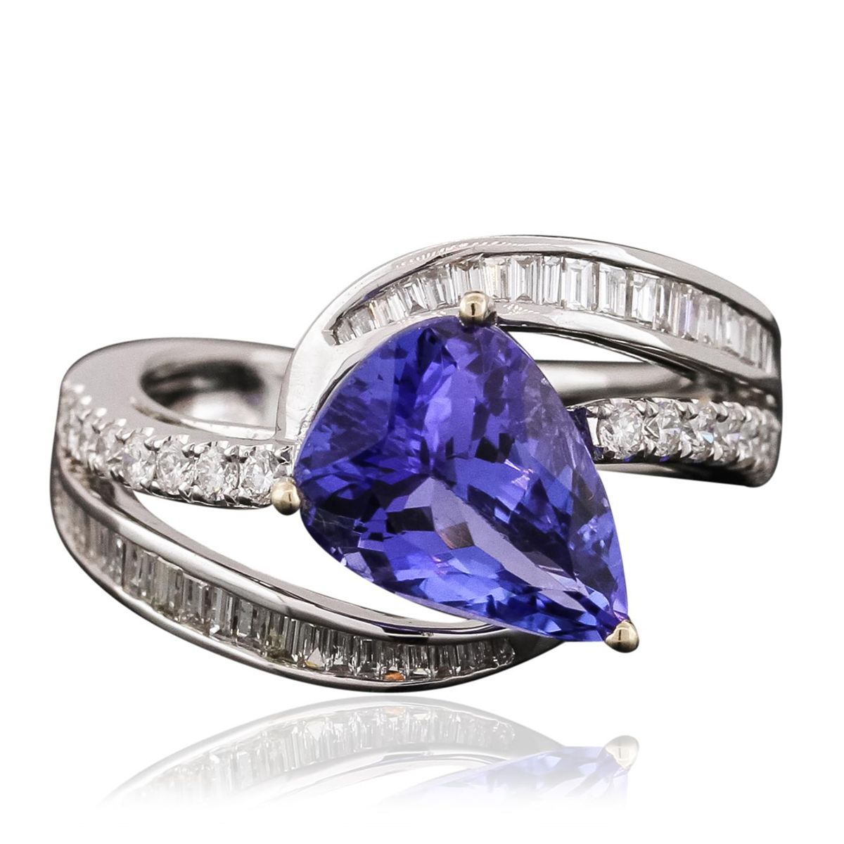 One electronically tested 18KT white gold ladies combination cast & assembled engagement ring with a bright polish finish. Identified with markings of "18K". Condition is new. Containing: One prong set pear modified brilliant cut natural tanzanite, measuring 11.90 x 8.32 x 5.41mm, approximate weight of 3.59ct., clarity is eye clean, type I, medium light, moderately strong, bluish violet color, (GIA bV 4/4), cut is good. Sixteen prong set round brilliant cut diamonds, measuring 1.80 - 1.80 x 1.08mm (depth est.) approximate total weight of 16 Stones = 0.34ct. Clarity: SI-1 to SI-2. Color: I - J, Cut is Good. Forty-Six channel set baguette cut diamonds, measuring 1.80 x 1.80 x 1.53mm (depth est.) approximate total weight of 46 Stones = 0.46ct. Clarity: VS-2 to SI-1. Color: I - J, Cut is Good. Colored gemstones are presumed to have been subjected to commonly used enhancement processes. All diamonds and colored gemstones are graded in the mounting, unless otherwise stated. Total Weight of Colored Stones 3.59ct. Total Weight of Diamonds 0.80ct. Total Weight of Ring 6.80 grams. GGL Appraised at $10,330.00.