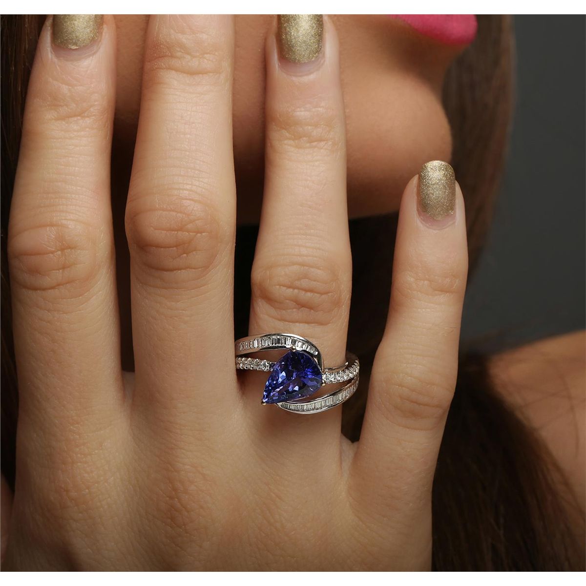 One electronically tested 18KT white gold ladies combination cast & assembled engagement ring with a bright polish finish. Identified with markings of "18K". Condition is new. Containing: One prong set pear modified brilliant cut natural tanzanite, measuring 11.90 x 8.32 x 5.41mm, approximate weight of 3.59ct., clarity is eye clean, type I, medium light, moderately strong, bluish violet color, (GIA bV 4/4), cut is good. Sixteen prong set round brilliant cut diamonds, measuring 1.80 - 1.80 x 1.08mm (depth est.) approximate total weight of 16 Stones = 0.34ct. Clarity: SI-1 to SI-2. Color: I - J, Cut is Good. Forty-Six channel set baguette cut diamonds, measuring 1.80 x 1.80 x 1.53mm (depth est.) approximate total weight of 46 Stones = 0.46ct. Clarity: VS-2 to SI-1. Color: I - J, Cut is Good. Colored gemstones are presumed to have been subjected to commonly used enhancement processes. All diamonds and colored gemstones are graded in the mounting, unless otherwise stated. Total Weight of Colored Stones 3.59ct. Total Weight of Diamonds 0.80ct. Total Weight of Ring 6.80 grams. GGL Appraised at $10,330.00.