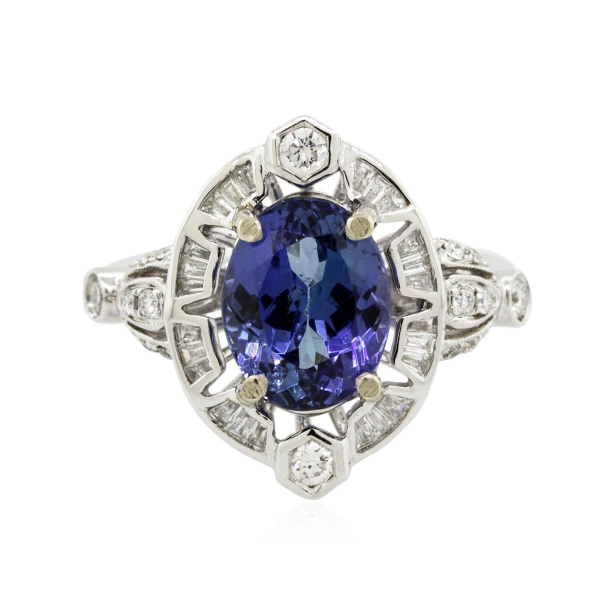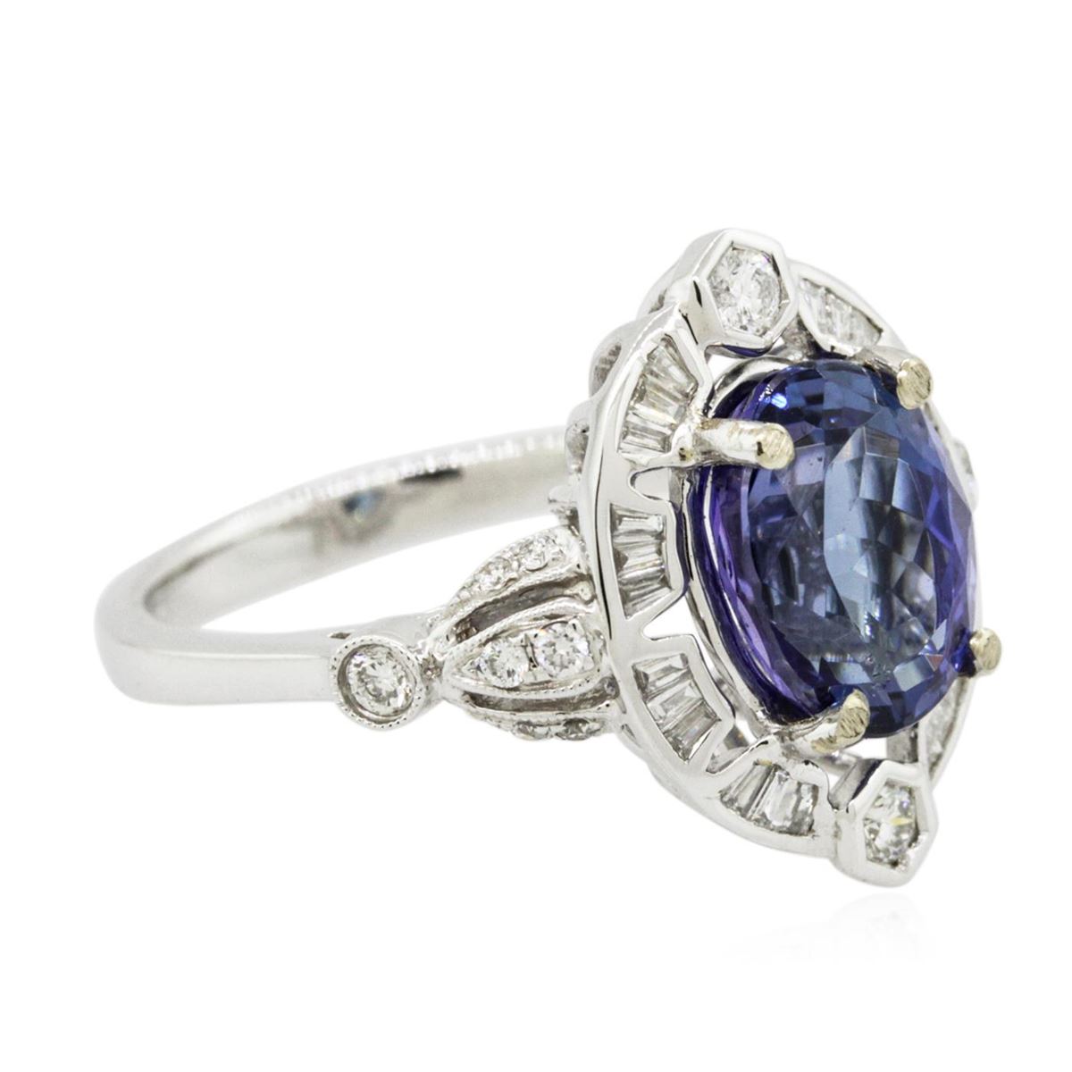 One electronically tested 18KT White Gold ladies cast tanzanite and diamond ring. The featured tanzanite is set within a diamond bezel supported by diamond set shoulders, completed by a two and one-half millimeter wide band. Bright polish finish with milgrain detailing. Identified with markings of "18K 750". Condition is new, good workmanship. Containing: One prong set oval brilliant cut natural tanzanite, measuring 10.20 x 8.00 x 6.00mm, 8% bulge factor, approximate weight of 3.60ct., clarity is eye clean, type I, medium dark, slightly grayish, violetish blue color, (GIA vB 6/2), cut is good. Transmitting light with no distortion, transparent. Graded in the setting. Tanzanite is a very rare gemstone that is only found in the country of Tanzania. Originally discovered in 1967. Tiffany & Company, named the stone Tanzanite. It is found in the Usumburu Mountains that border the Umba Valley of northern Tanzania. Tanzanite occurs in gray, brown, violet, blue, reddish-purple, & green. The gem is interesting because of its exceptional pleochroism. Rotated in different directions a tanzanite will exhibit multiple changes of color. Tanzanite has a low tolerance to ultrasonic cleaning, and should not be cleaned using this method. Forty channel, bead, & bezel set baguette & round brilliant cut diamonds approximate total weight of 40 Stones = 0.50ct. Graded in the setting. Clarity: VS-1 to SI-1. Color: G - I. Total Weight of Colored Stones 3.60ct. Total Weight of Diamonds 0.50ct. Total Weight of Ring 6.23 grams. AIG Appraised at $10,915.00.