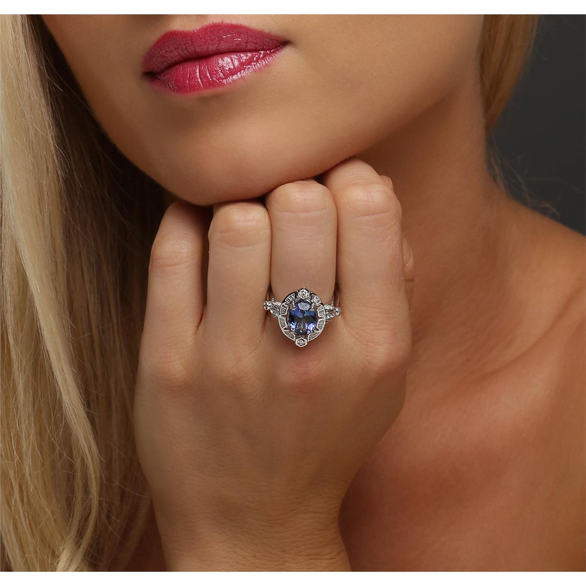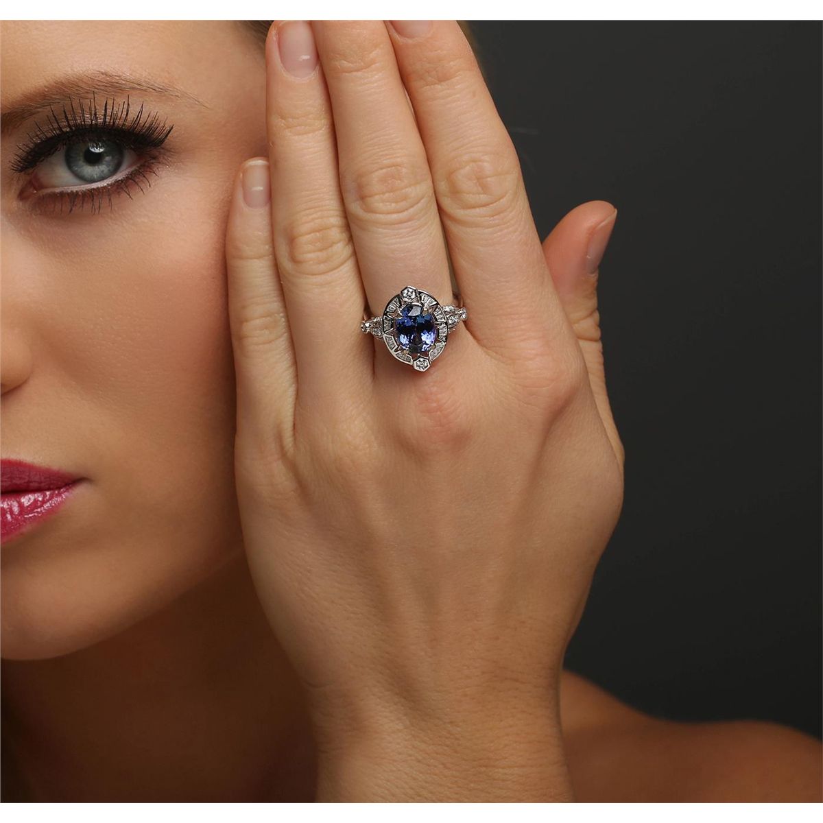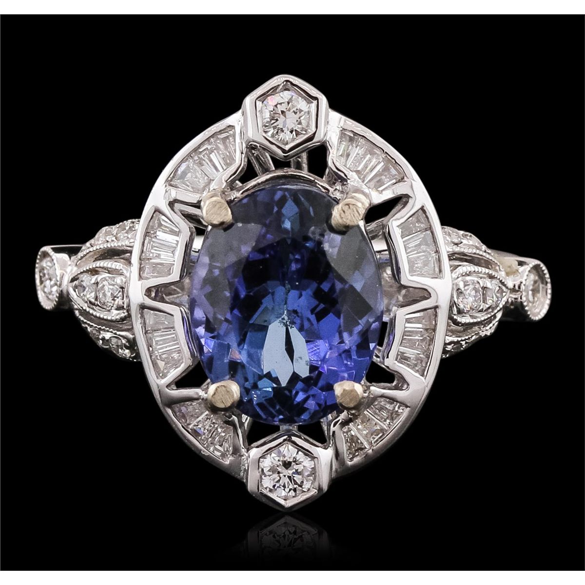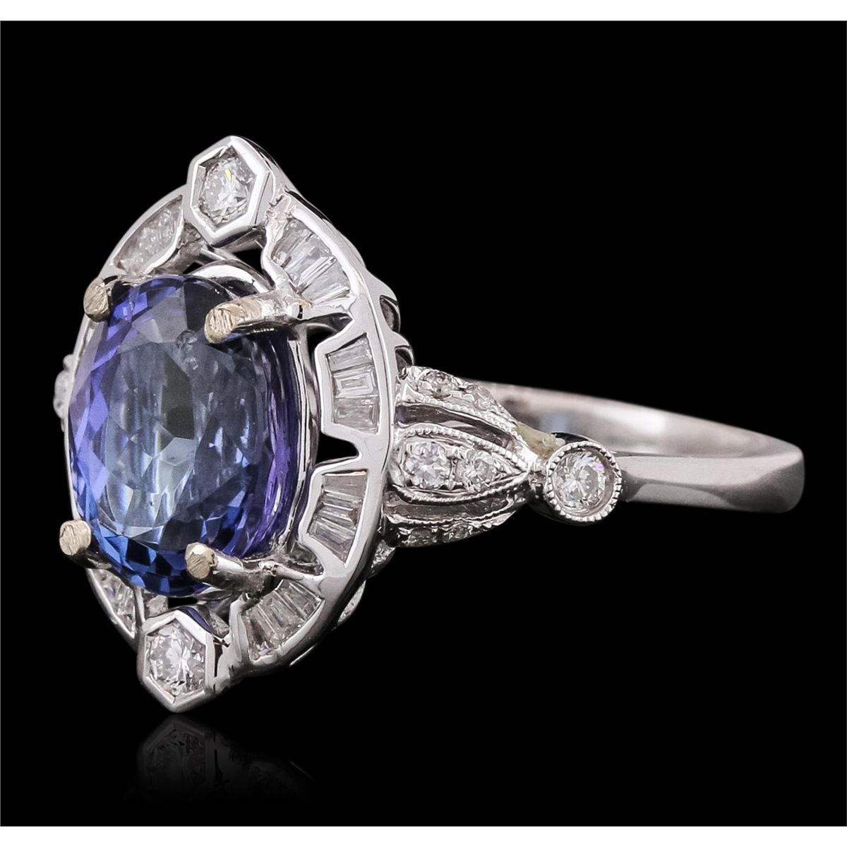One electronically tested 18KT White Gold ladies cast tanzanite and diamond ring. The featured tanzanite is set within a diamond bezel supported by diamond set shoulders, completed by a two and one-half millimeter wide band. Bright polish finish with milgrain detailing. Identified with markings of "18K 750". Condition is new, good workmanship. Containing: One prong set oval brilliant cut natural tanzanite, measuring 10.20 x 8.00 x 6.00mm, 8% bulge factor, approximate weight of 3.60ct., clarity is eye clean, type I, medium dark, slightly grayish, violetish blue color, (GIA vB 6/2), cut is good. Transmitting light with no distortion, transparent. Graded in the setting. Tanzanite is a very rare gemstone that is only found in the country of Tanzania. Originally discovered in 1967. Tiffany & Company, named the stone Tanzanite. It is found in the Usumburu Mountains that border the Umba Valley of northern Tanzania. Tanzanite occurs in gray, brown, violet, blue, reddish-purple, & green. The gem is interesting because of its exceptional pleochroism. Rotated in different directions a tanzanite will exhibit multiple changes of color. Tanzanite has a low tolerance to ultrasonic cleaning, and should not be cleaned using this method. Forty channel, bead, & bezel set baguette & round brilliant cut diamonds approximate total weight of 40 Stones = 0.50ct. Graded in the setting. Clarity: VS-1 to SI-1. Color: G - I. Total Weight of Colored Stones 3.60ct. Total Weight of Diamonds 0.50ct. Total Weight of Ring 6.23 grams. AIG Appraised at $10,915.00.