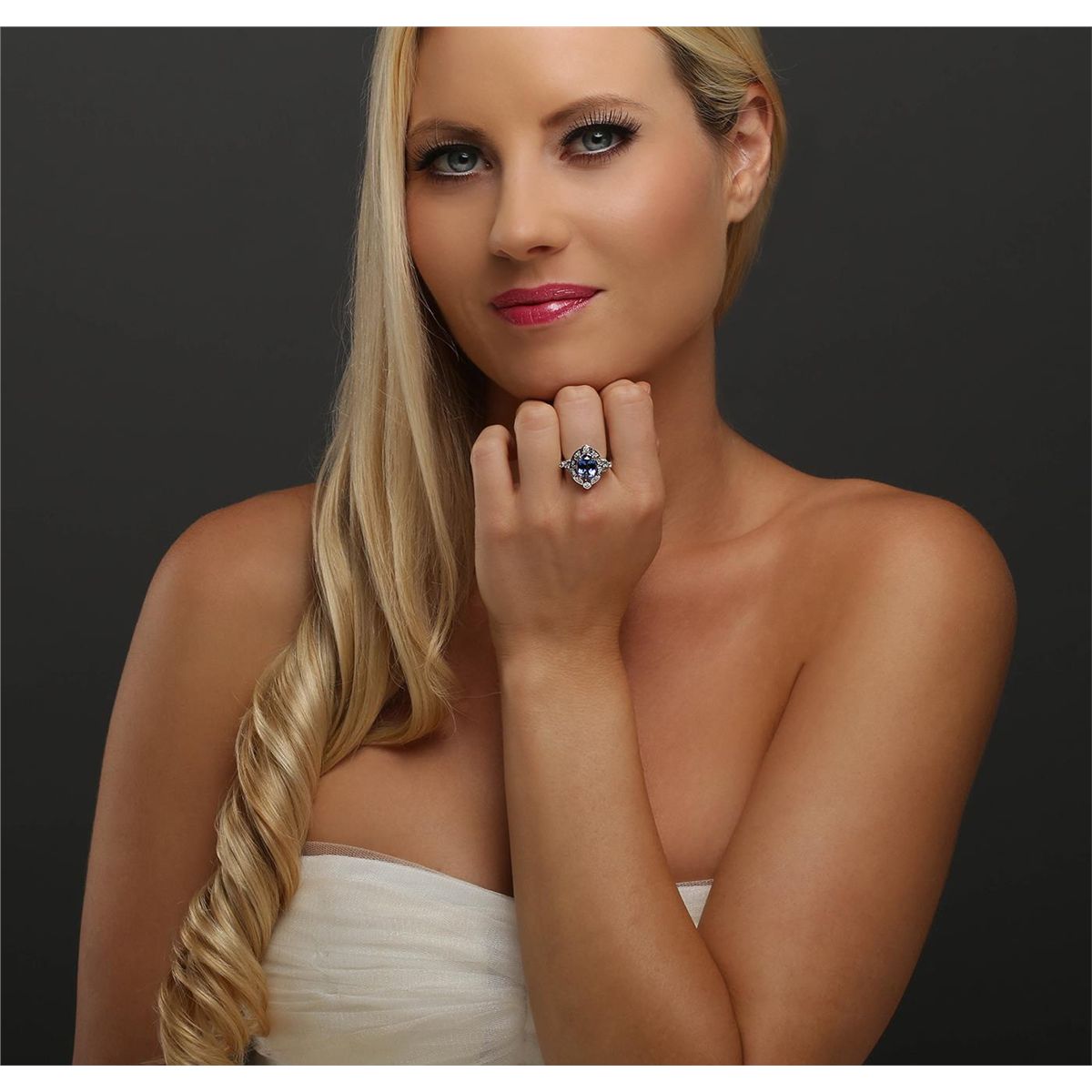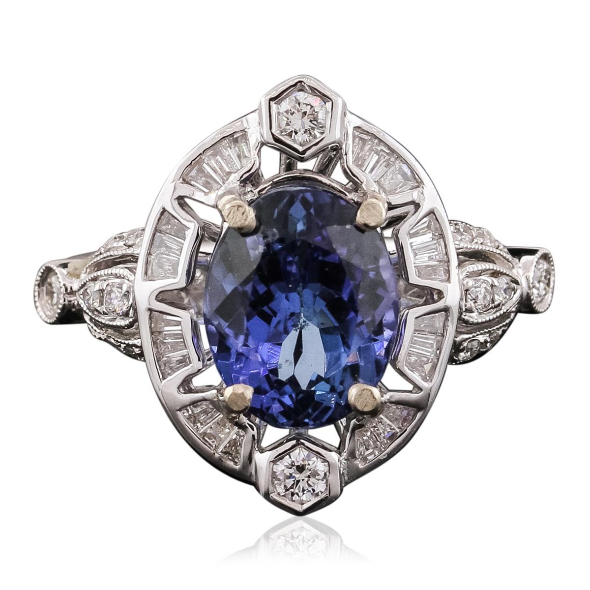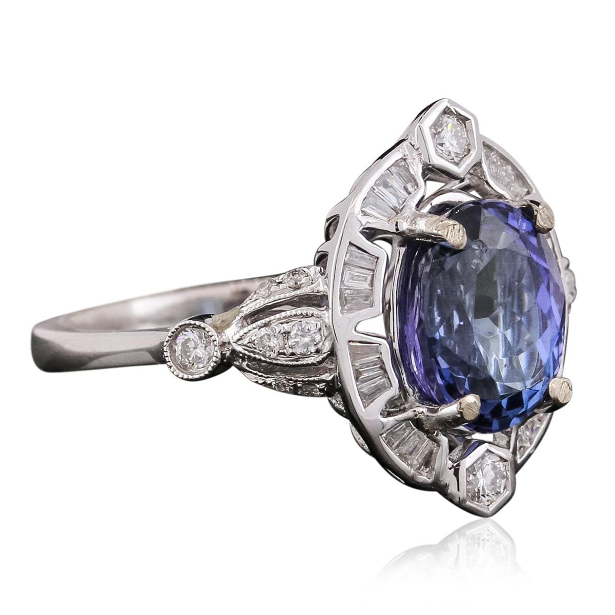 One electronically tested 18KT White Gold ladies cast tanzanite and diamond ring. The featured tanzanite is set within a diamond bezel supported by diamond set shoulders, completed by a two and one-half millimeter wide band. Bright polish finish with milgrain detailing. Identified with markings of "18K 750". Condition is new, good workmanship. Containing: One prong set oval brilliant cut natural tanzanite, measuring 10.20 x 8.00 x 6.00mm, 8% bulge factor, approximate weight of 3.60ct., clarity is eye clean, type I, medium dark, slightly grayish, violetish blue color, (GIA vB 6/2), cut is good. Transmitting light with no distortion, transparent. Graded in the setting. Tanzanite is a very rare gemstone that is only found in the country of Tanzania. Originally discovered in 1967. Tiffany & Company, named the stone Tanzanite. It is found in the Usumburu Mountains that border the Umba Valley of northern Tanzania. Tanzanite occurs in gray, brown, violet, blue, reddish-purple, & green. The gem is interesting because of its exceptional pleochroism. Rotated in different directions a tanzanite will exhibit multiple changes of color. Tanzanite has a low tolerance to ultrasonic cleaning, and should not be cleaned using this method. Forty channel, bead, & bezel set baguette & round brilliant cut diamonds approximate total weight of 40 Stones = 0.50ct. Graded in the setting. Clarity: VS-1 to SI-1. Color: G - I. Total Weight of Colored Stones 3.60ct. Total Weight of Diamonds 0.50ct. Total Weight of Ring 6.23 grams. AIG Appraised at $10,915.00.