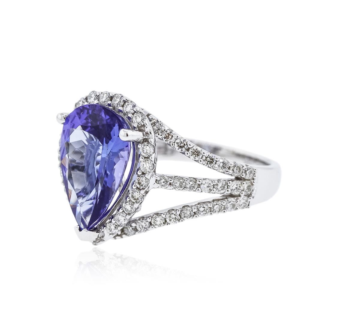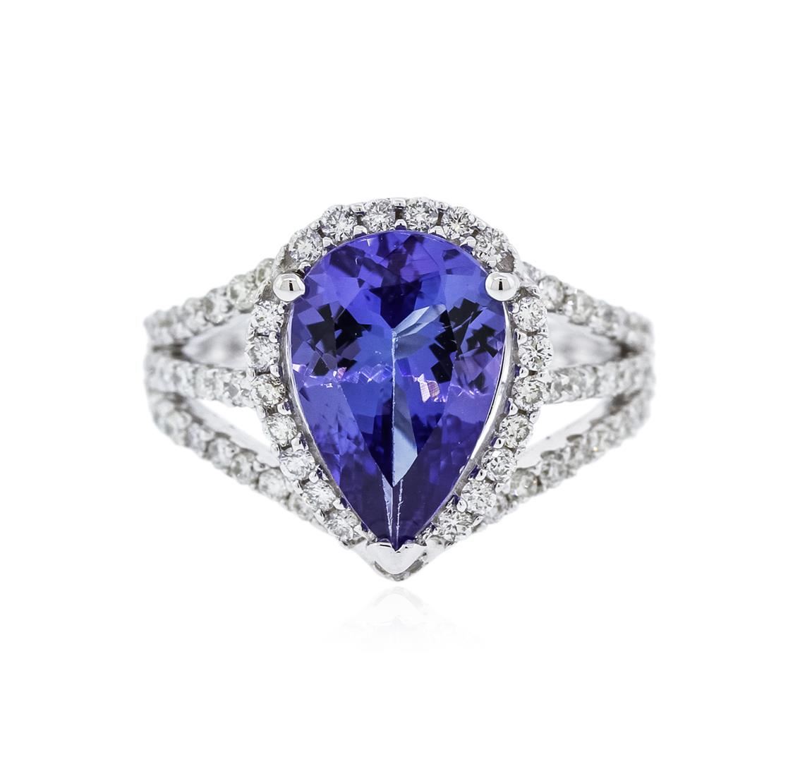 One electronically tested 18KT white gold ladies cast tanzanite and diamond ring with a tapered shank with a bright polish finish. Trademark is Orianne. Identified with markings of "18K". Condition is new. Containing: One prong set pear modified brilliant cut natural tanzanite, measuring 12.76 x 8.60 x 4.93mm, approximate weight of 3.62ct., clarity is eye clean, type I, medium, moderately strong, violetish blue color, (GIA vB 5/4), cut is good. Sixty-Eight prong set round brilliant cut diamonds, measuring 1.20 - 1.20 x 0.72mm (depth est.) approximate total weight of 68 Stones = 0.43ct. Clarity: I-1 to I-2. Color: I - J. All diamonds and colored gemstones are graded in the mounting, unless otherwise stated. Colored gemstones are presumed to have been subjected to commonly used enhancement processes. Total Weight of Colored Stones 3.62ct. Total Weight of Diamonds 0.43ct. Total Weight of Ring 5.60 grams. GGL Appraised at $5,310.00.