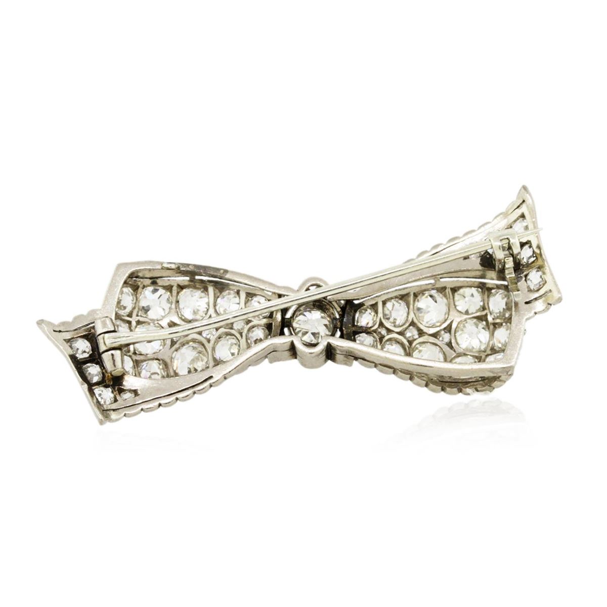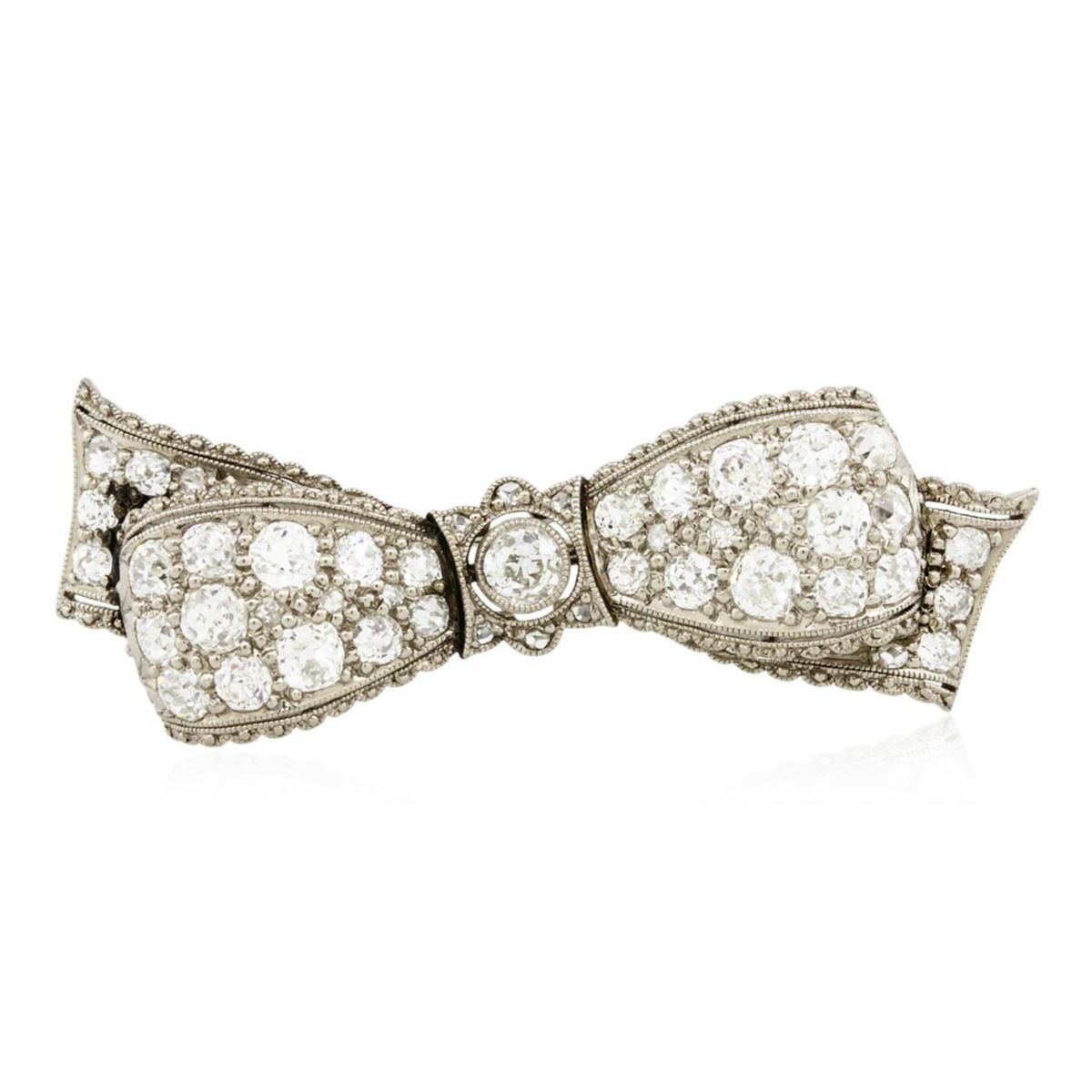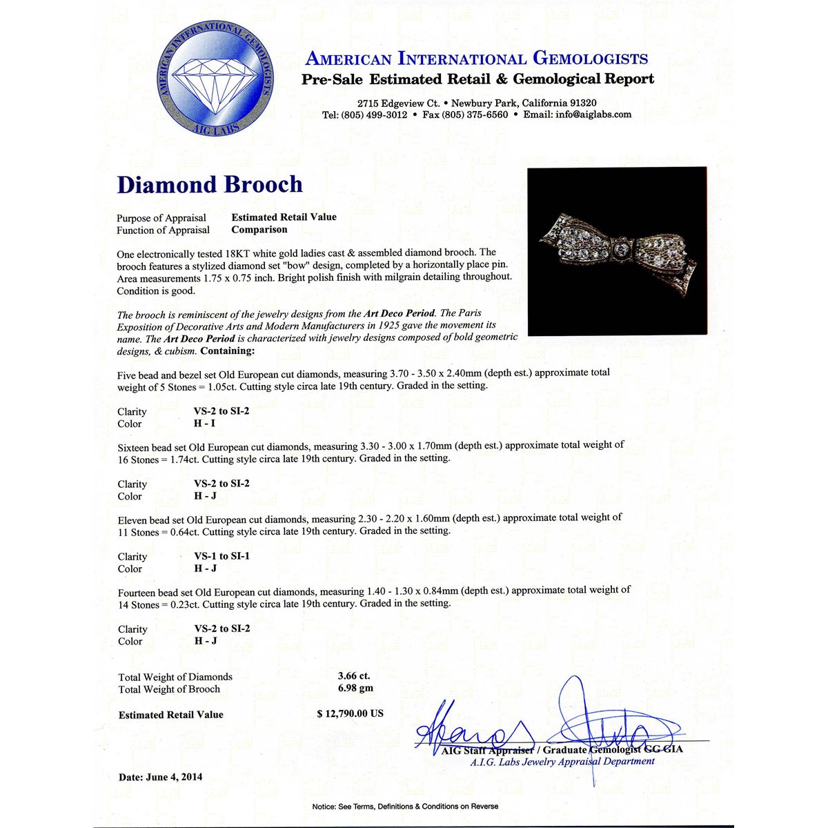 One electronically tested 18KT white gold ladies cast & assembled diamond brooch. Condition is good. The brooch features a stylized diamond set "bow" design, completed by a horizontally place pin. Area measurements 1.75 x 0.75 inch. Bright polish finish with milgrain detailing throughout. The brooch is reminiscent of the jewelry designs from the Art Deco Period. The Paris Exposition of Decorative Arts and Modern Manufacturers in 1925 gave the movement its name. The Art Deco Period is characterized with jewelry designs composed of bold geometric designs, & cubism. Containing: Five bead and bezel set Old European cut diamonds, measuring 3.70 - 3.50 x 2.40mm (depth est.) approximate total weight of 5 Stones = 1.05ct. Cutting style circa late 19th century. Graded in the setting. Clarity: VS-2 to SI-2. Color: H - I Sixteen bead set Old European cut diamonds, measuring 3.30 - 3.00 x 1.70mm (depth est.) approximate. Total Weight of 16 Stones = 1.74ct. Cutting style circa late 19th century. Graded in the setting. Clarity: VS-2 to SI-2. Color: H - J Eleven bead set Old European cut diamonds, measuring 2.30 - 2.20 x 1.60mm (depth est.) approximate. Total Weight of 11 Stones = 0.64ct. Cutting style circa late 19th century. Graded in the setting. Clarity: VS-1 to SI-1. Color: H - J Fourteen bead set Old European cut diamonds, measuring 1.40 - 1.30 x 0.84mm (depth est.) approximate. Total Weight of 14 Stones = 0.23ct. Cutting style circa late 19th century. Graded in the setting. Clarity: VS-2 to SI-2. Color: H - J. Total Weight of Diamonds 3.66ct. Total Weight of Brooch 6.98 grams. AIG Appraised at $12,790.00.