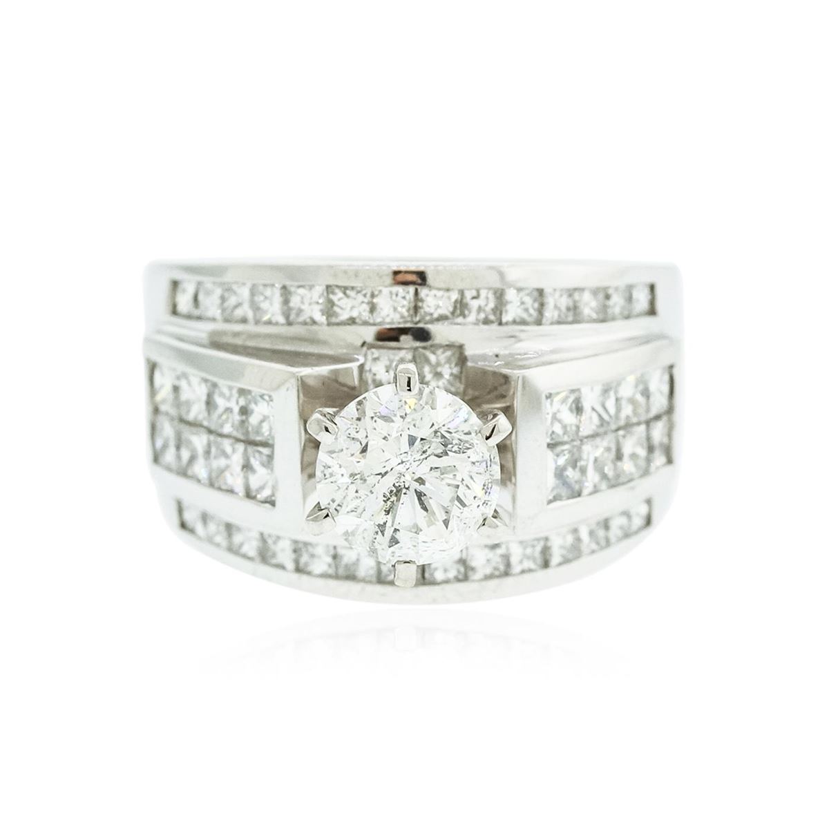 One electronically tested 18KT White Gold ladies cast & assembled diamond unity ring with a bright polish finish. Condition is good. The ring features a cathedral set diamond supported by diamond set shoulders and framed by mirroring diamond ribbons. The ring is completed by a five millimeter wide band. Identified with markings of "18K". Containing: One prong set round brilliant cut diamond, measuring 6.90 - 6.85 x 4.80mm (depth est.) approximate weight of 1.48ct. Diamond Grading Report attached. Graded in the setting. Clarity: I-1. Color: I Depth 69.8%. Table 58.1%. Sixteen invisible set princess cut diamonds, measuring 2.30 x 2.10 x 1.58mm (depth est.) approximate. Total Weight of 16 Stones = 1.10ct. Graded in the setting. Clarity: SI-1 to SI-2. Color: G - I Thirty-Two channel set princess cut diamonds, measuring 1.80 x 1.70 x 1.28mm (depth est.) approximate. Total Weight of 32 Stones = 1.12ct. Graded in the setting. Clarity: VS-1 to SI-1. Color: G - I. Total Weight of Diamonds 3.70ct. Total Weight of Ring 15.64 grams. AIG Appraised at $30,490.00.