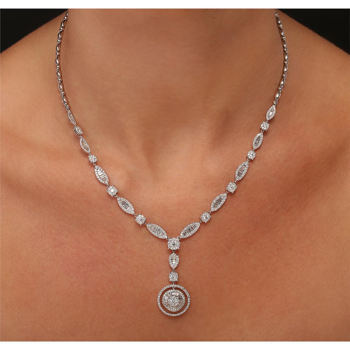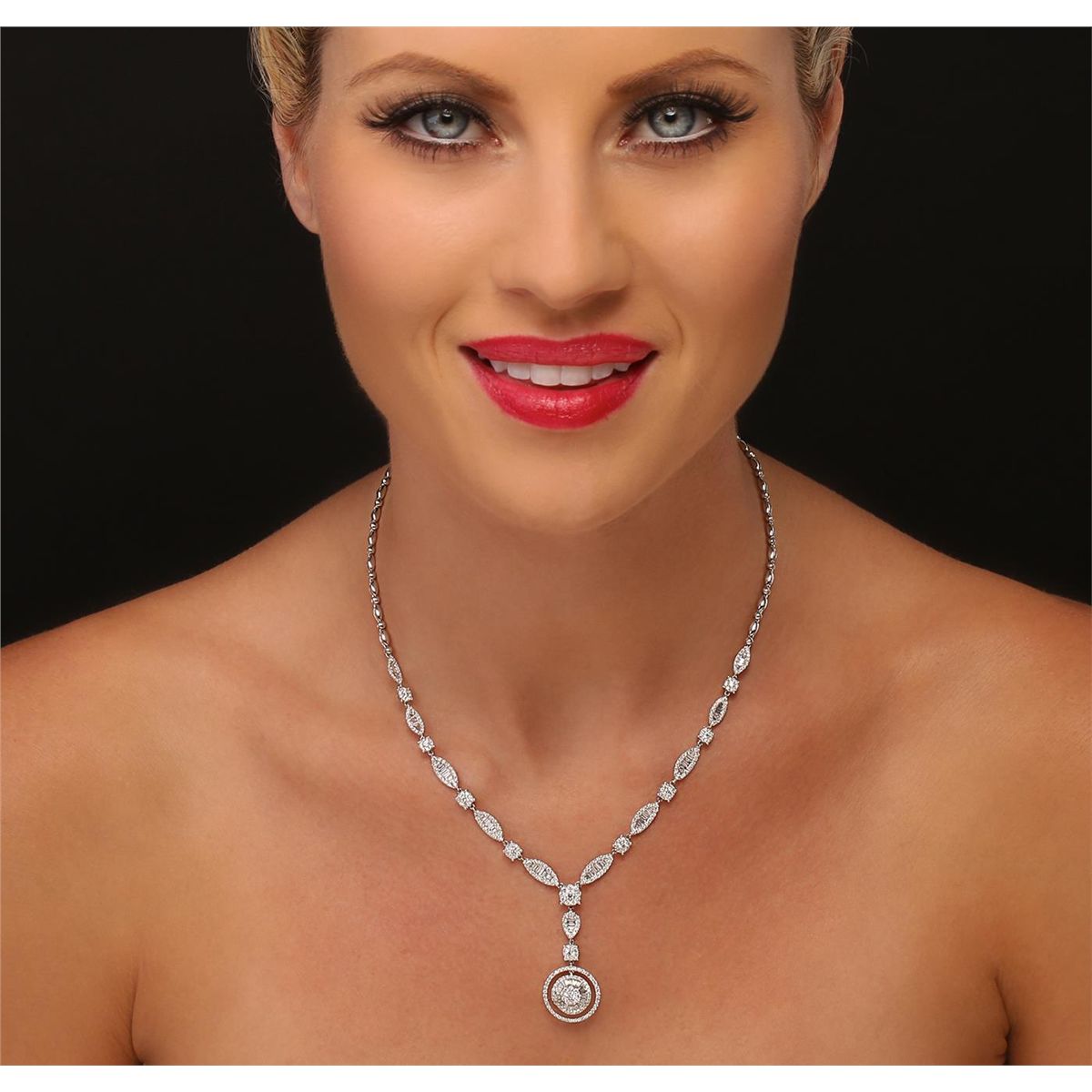 One 18KT white gold ladies necklace (19.52 grams) containing: 104 baguette-cut diamonds total 1.06 carats in weight. 362 round, brilliant-cut diamonds total 2.65 carats in weight. Average quality is: VS2-SI1 clarity grade; G-H color grade. GLS Appraised at $32,100.00.