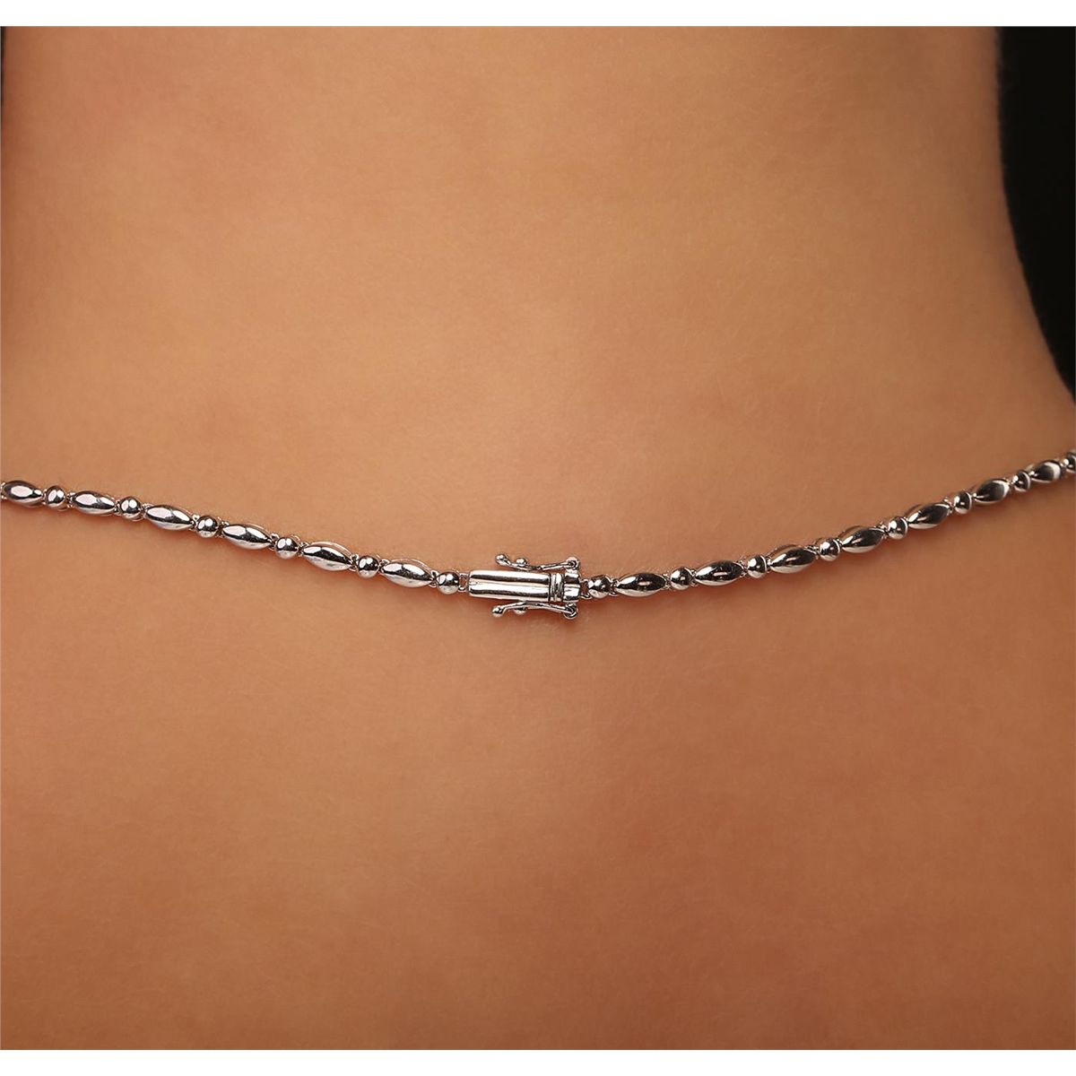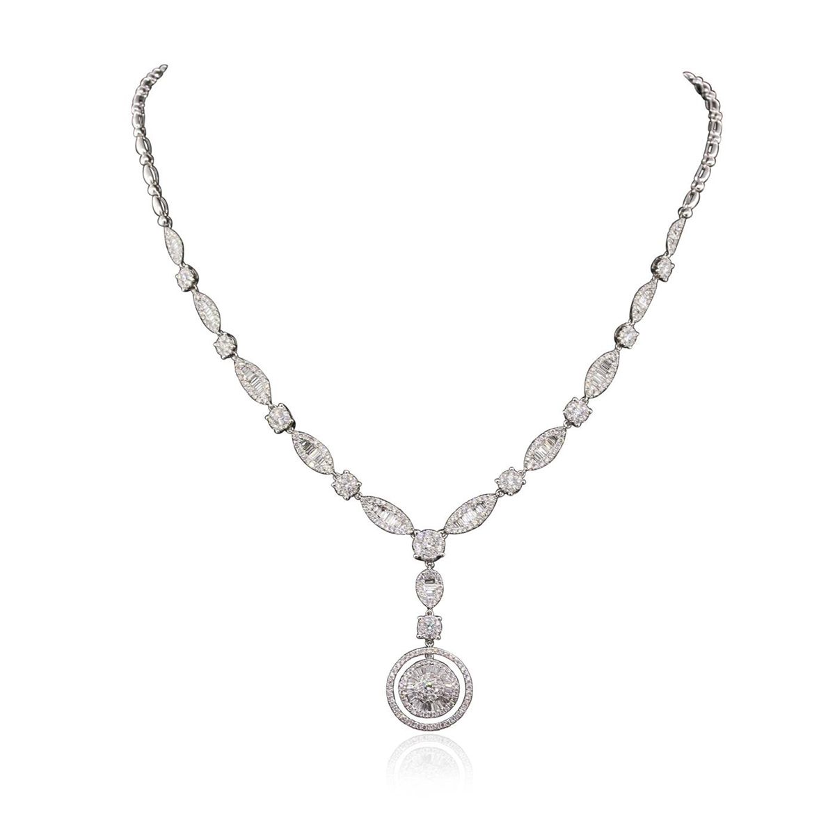 One 18KT white gold ladies necklace (19.52 grams) containing: 104 baguette-cut diamonds total 1.06 carats in weight. 362 round, brilliant-cut diamonds total 2.65 carats in weight. Average quality is: VS2-SI1 clarity grade; G-H color grade. GLS Appraised at $32,100.00.