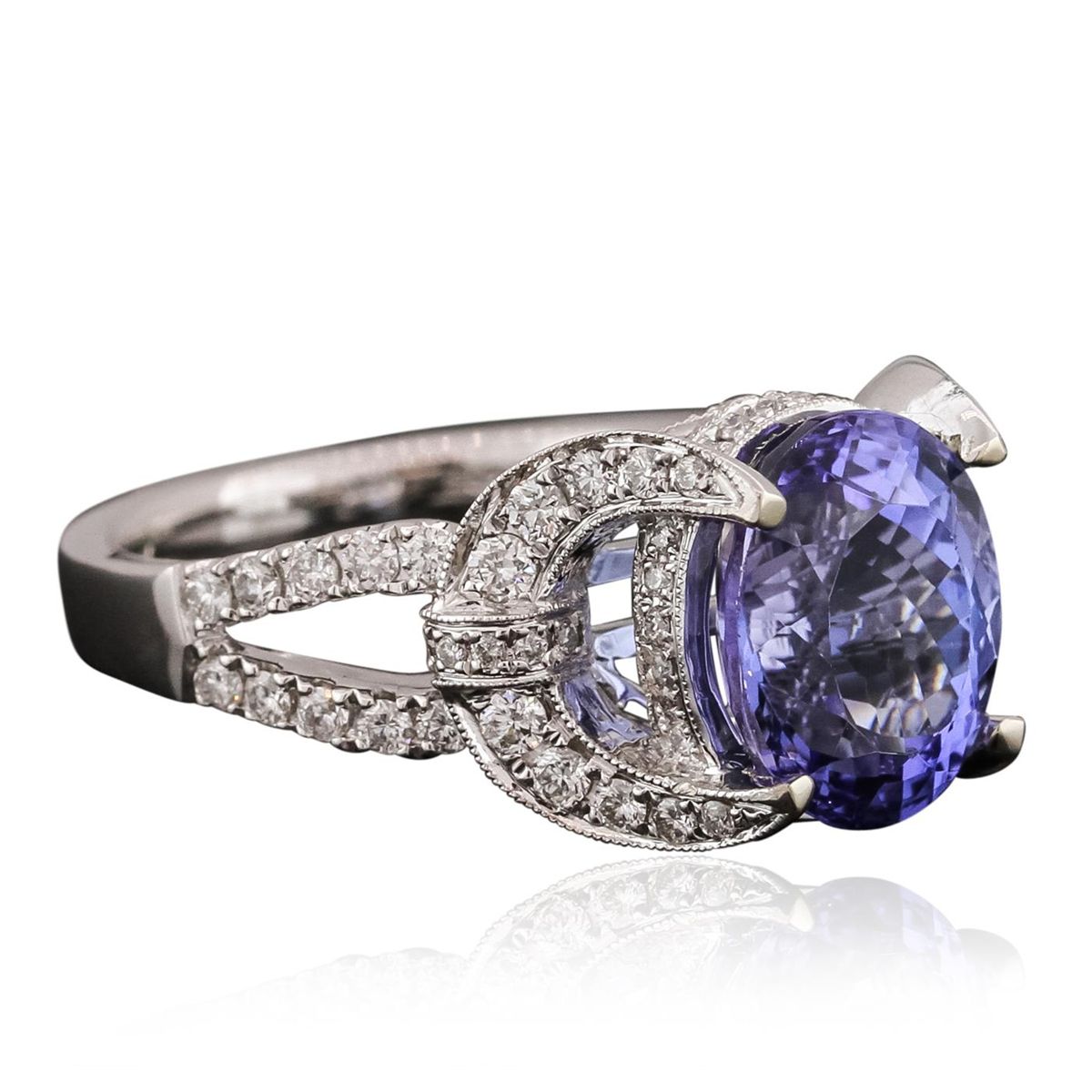 One electronically tested 18KT white gold ladies combination cast & assembled prong set ring with a split shank with a bright polish finish. Identified with markings of "750". Condition is new. Containing: One prong set oval modified brilliant cut natural tanzanite, measuring 10.30 x 8.39 x 6.40mm, approximate weight of 3.74ct., clarity is eye clean, type I, medium light, very slightly grayish, violet color, (GIA V 4/3), cut is good. One Hundred One prong set round brilliant cut diamonds, measuring 1.50 - 1.10 x 0.78mm (depth est.) approximate total weight of 101 Stones = 0.60ct. Clarity: SI-1 to SI-2. Color: H - I, Cut is Good. All diamonds are graded in the mounting, unless otherwise stated, Colored gemstones are presumed to have been subjected to commonly used enhancement processes. Total Weight of Colored Stones 3.74ct. Total Weight of Diamonds 0.60ct. Total Weight of Ring 8.00 grams. GGL Appraised at $10,880.00.