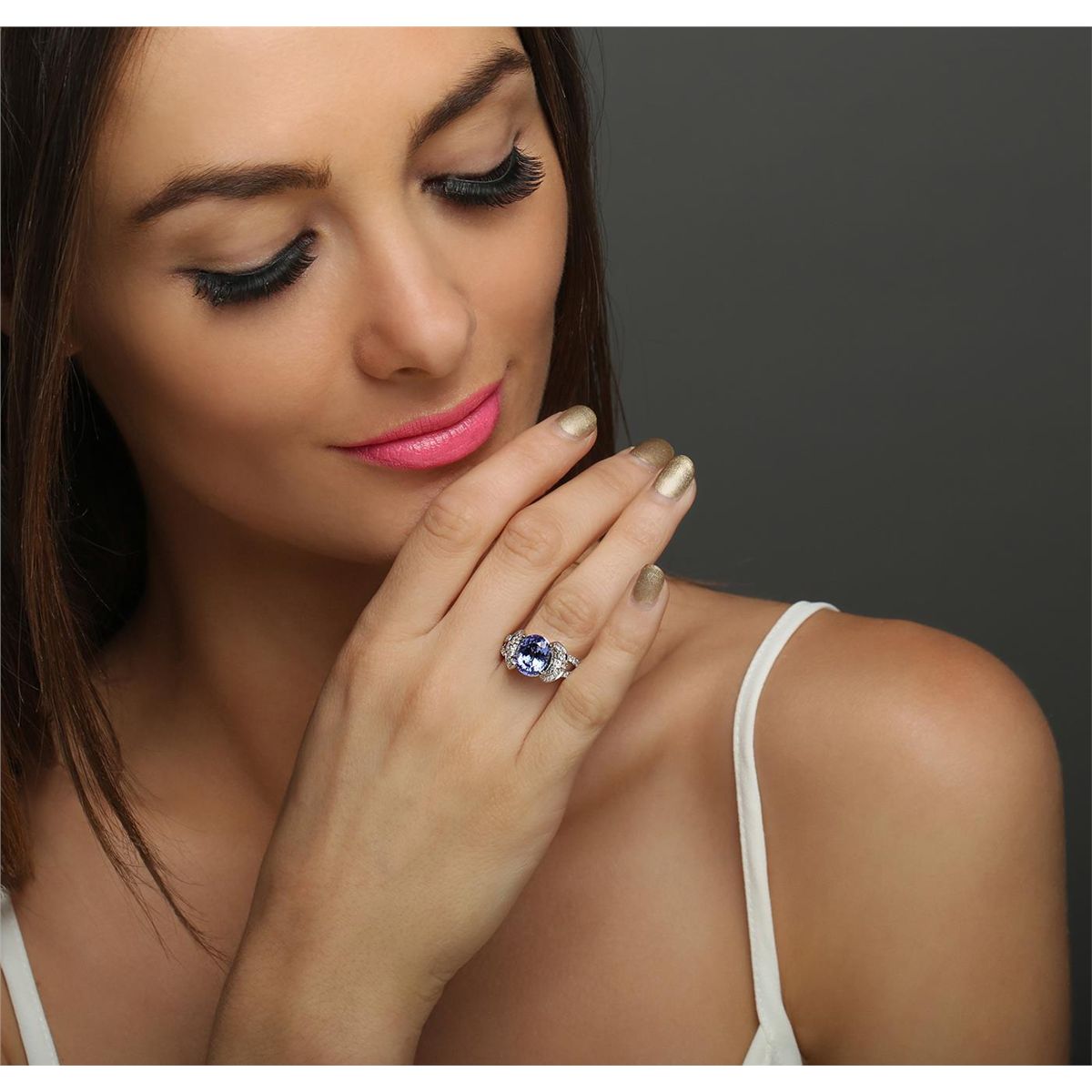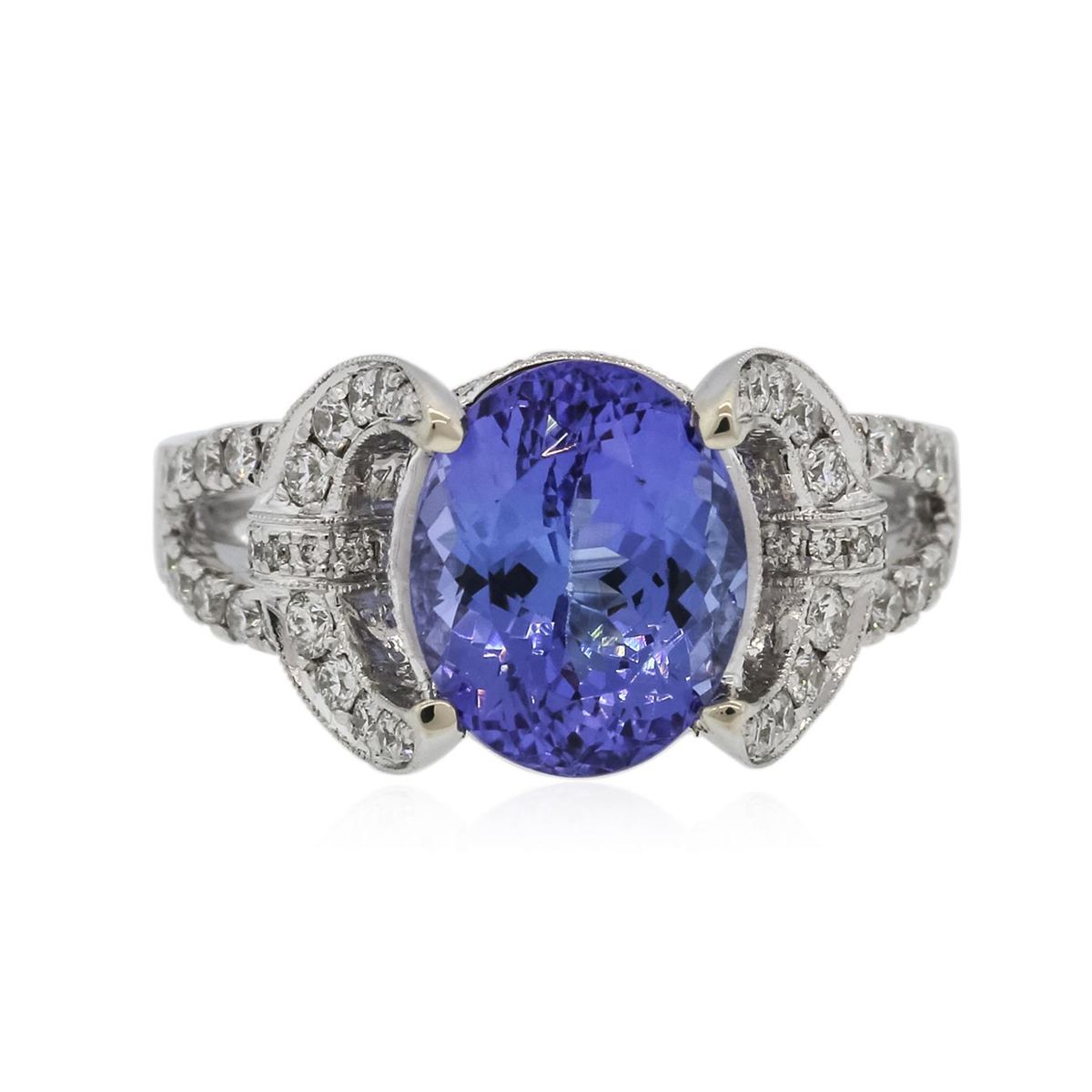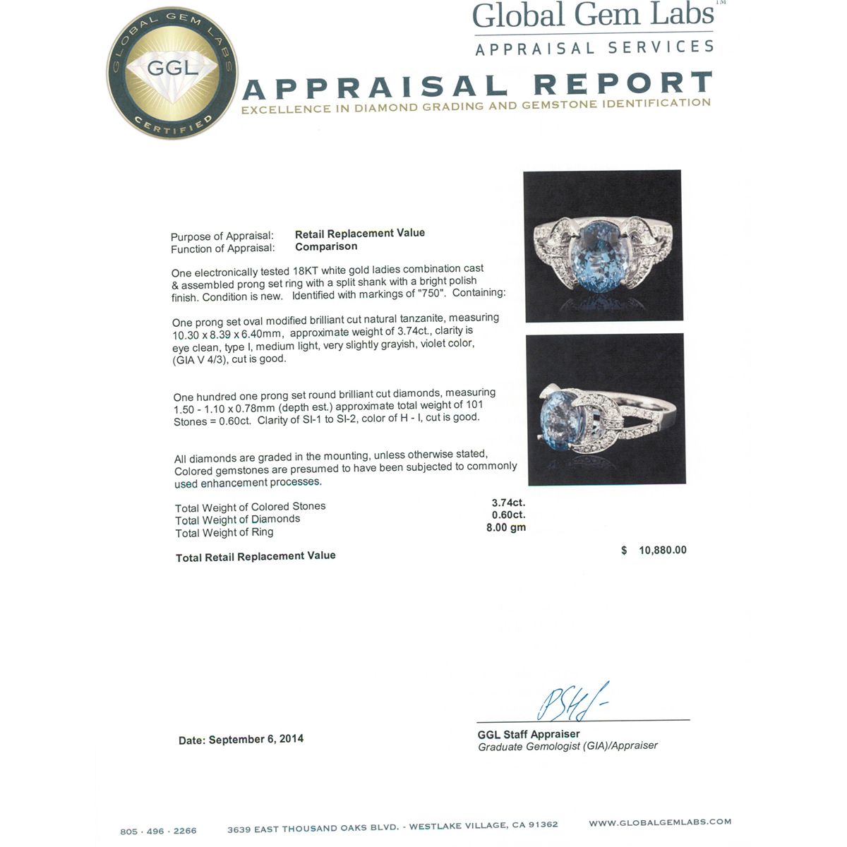 One electronically tested 18KT white gold ladies combination cast & assembled prong set ring with a split shank with a bright polish finish. Identified with markings of "750". Condition is new. Containing: One prong set oval modified brilliant cut natural tanzanite, measuring 10.30 x 8.39 x 6.40mm, approximate weight of 3.74ct., clarity is eye clean, type I, medium light, very slightly grayish, violet color, (GIA V 4/3), cut is good. One Hundred One prong set round brilliant cut diamonds, measuring 1.50 - 1.10 x 0.78mm (depth est.) approximate total weight of 101 Stones = 0.60ct. Clarity: SI-1 to SI-2. Color: H - I, Cut is Good. All diamonds are graded in the mounting, unless otherwise stated, Colored gemstones are presumed to have been subjected to commonly used enhancement processes. Total Weight of Colored Stones 3.74ct. Total Weight of Diamonds 0.60ct. Total Weight of Ring 8.00 grams. GGL Appraised at $10,880.00.