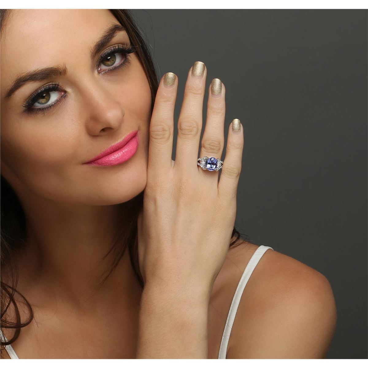 One electronically tested 18KT white gold ladies combination cast & assembled prong set ring with a split shank with a bright polish finish. Identified with markings of "750". Condition is new. Containing: One prong set oval modified brilliant cut natural tanzanite, measuring 10.30 x 8.39 x 6.40mm, approximate weight of 3.74ct., clarity is eye clean, type I, medium light, very slightly grayish, violet color, (GIA V 4/3), cut is good. One Hundred One prong set round brilliant cut diamonds, measuring 1.50 - 1.10 x 0.78mm (depth est.) approximate total weight of 101 Stones = 0.60ct. Clarity: SI-1 to SI-2. Color: H - I, Cut is Good. All diamonds are graded in the mounting, unless otherwise stated, Colored gemstones are presumed to have been subjected to commonly used enhancement processes. Total Weight of Colored Stones 3.74ct. Total Weight of Diamonds 0.60ct. Total Weight of Ring 8.00 grams. GGL Appraised at $10,880.00.