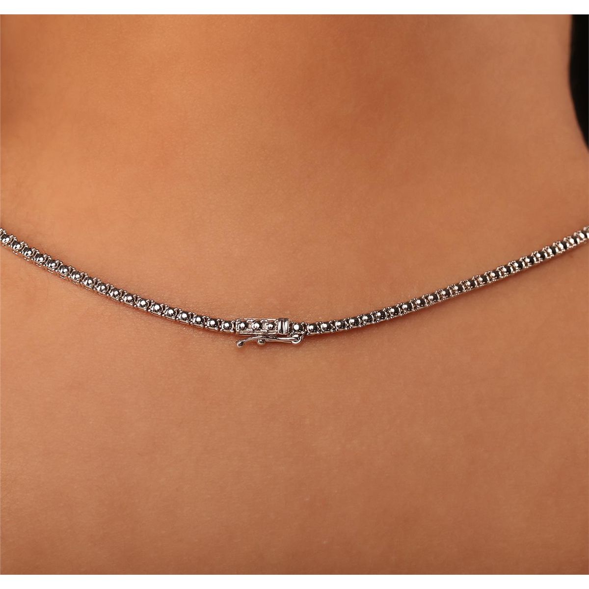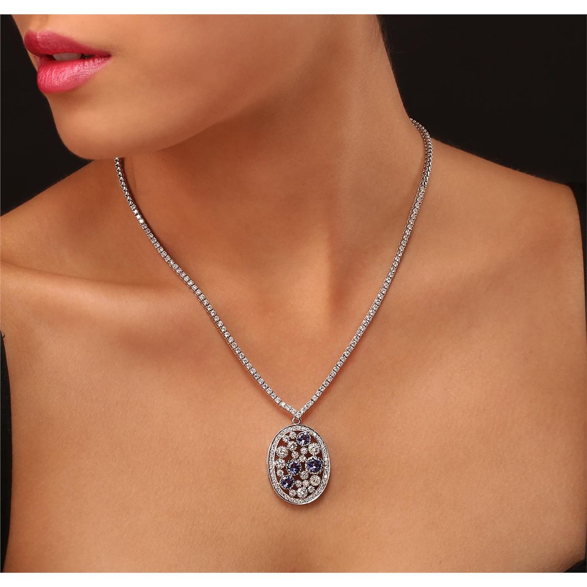One electronically tested 18KT white gold Ladies combination cast & assembled necklace with a hidden box clasp with a bright polish finish. Condition is new. Measurements: 16.5" in length. Identified with markings of "750". Containing: Four gypsy set round modified brilliant cut natural tanzanites, measuring 6.20 - 5.20 x 3.71 mm, approximate. Total Weight of 3.84ct., clarity is eye clean, type I, medium, moderately strong, bluish violet color, (GIA bV 5/4), cut is very good. Colored gemstones are presumed to have been subjected to commonly used color/clarity enhancement processes. Six prong set round brilliant cut diamonds, measuring 4.00 - 4.00 x 2.40mm (depth est.) approximate. Total Weight of 6 Stones = 1.41ct. Clarity: I-1 to I-2. Color: H - I, Cut is Good. One Hundred Forty-Six prong set round brilliant cut diamonds, measuring 2.00 - 1.30 x 0.99mm (depth est.) approximate. Total Weight of 146 Stones = 2.39ct. Clarity: I-1 to I-2. Color: H - I, Cut is Good. Total Weight of Colored Stones 3.84ct. Total Weight of Diamonds 3.80ct. Total Weight of Necklace 25.60 grams. GGL Appraised at $24,515.00.