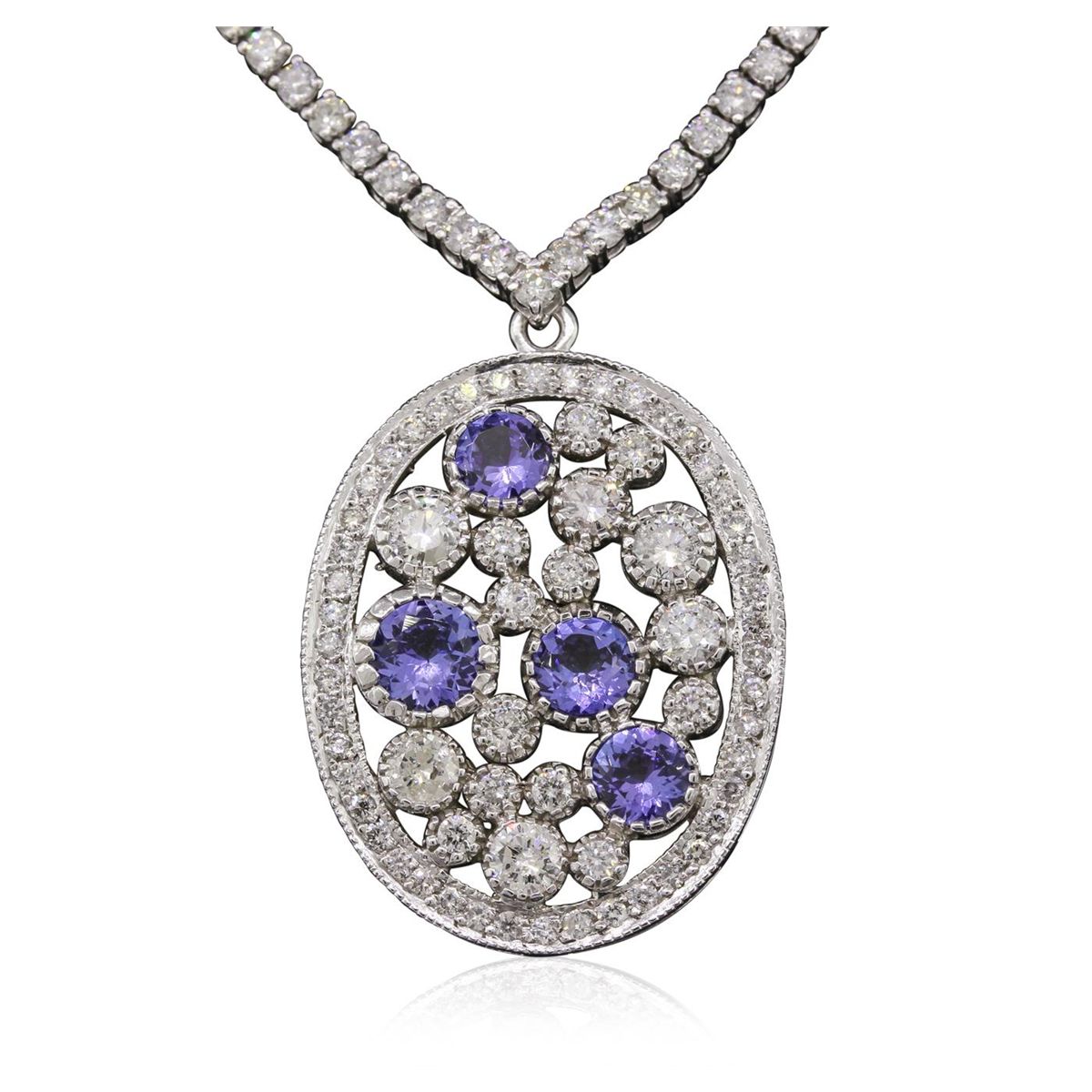 One electronically tested 18KT white gold Ladies combination cast & assembled necklace with a hidden box clasp with a bright polish finish. Condition is new. Measurements: 16.5" in length. Identified with markings of "750". Containing: Four gypsy set round modified brilliant cut natural tanzanites, measuring 6.20 - 5.20 x 3.71 mm, approximate. Total Weight of 3.84ct., clarity is eye clean, type I, medium, moderately strong, bluish violet color, (GIA bV 5/4), cut is very good. Colored gemstones are presumed to have been subjected to commonly used color/clarity enhancement processes. Six prong set round brilliant cut diamonds, measuring 4.00 - 4.00 x 2.40mm (depth est.) approximate. Total Weight of 6 Stones = 1.41ct. Clarity: I-1 to I-2. Color: H - I, Cut is Good. One Hundred Forty-Six prong set round brilliant cut diamonds, measuring 2.00 - 1.30 x 0.99mm (depth est.) approximate. Total Weight of 146 Stones = 2.39ct. Clarity: I-1 to I-2. Color: H - I, Cut is Good. Total Weight of Colored Stones 3.84ct. Total Weight of Diamonds 3.80ct. Total Weight of Necklace 25.60 grams. GGL Appraised at $24,515.00.