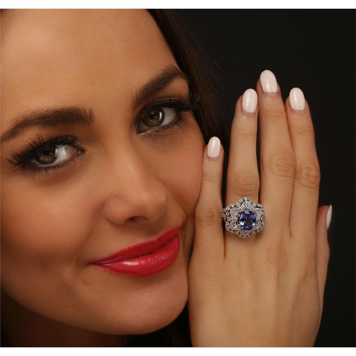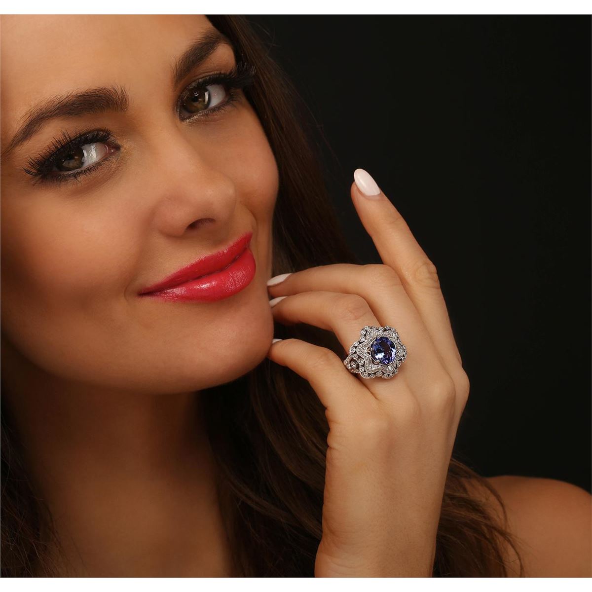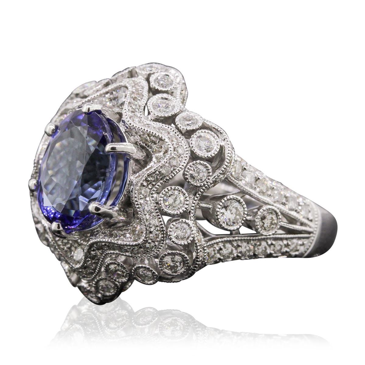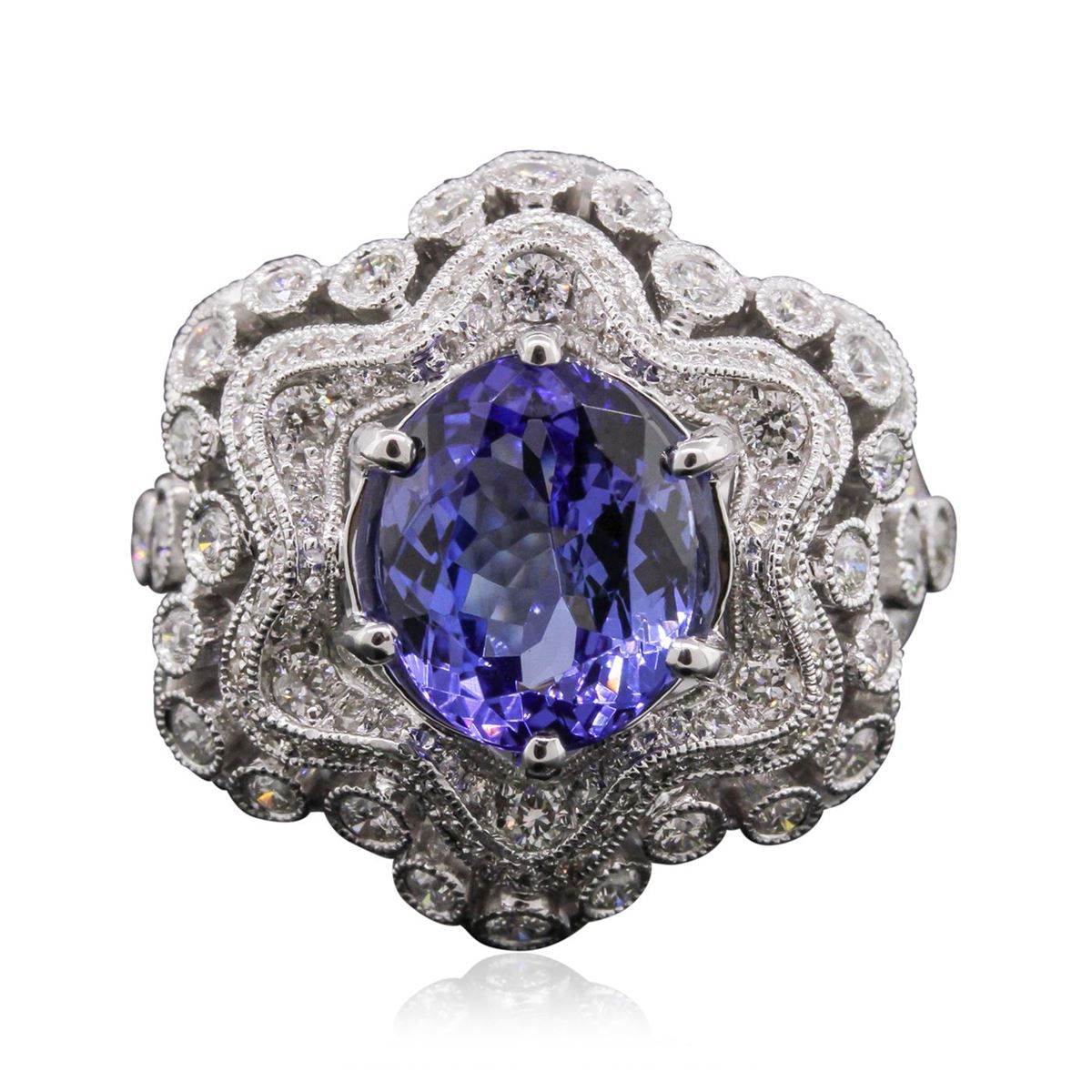 One electronically tested 18KT white gold Ladies combination cast & assembled ring with a bright polish finish. Condition is new. Identified with markings of "18K". Containing: One prong set oval modified mixed cut natural tanzanite, measuring 10.50 x 8.20 x 5.60mm, approximate weight of 3.92ct., clarity is eye clean, type II, medium, moderately strong, blue color, (GIA B 5/4), cut is very good. Colored gemstones are presumed to have been subjected to commonly used color/clarity enhancement processes. One Hundred Thirty-Five prong set round brilliant cut diamonds, measuring 2.50 - 1.30 x 1.14mm (depth est.) approximate. Total Weight of 135 Stones = 1.98ct. Clarity: SI-1 to SI-2. Color: H - I, Cut is Good. Total Weight of Colored Stones 3.92ct. Total Weight of Diamonds 1.98ct. Total Weight of Ring 13.40 grams. GGL Appraised at $16,060.00.