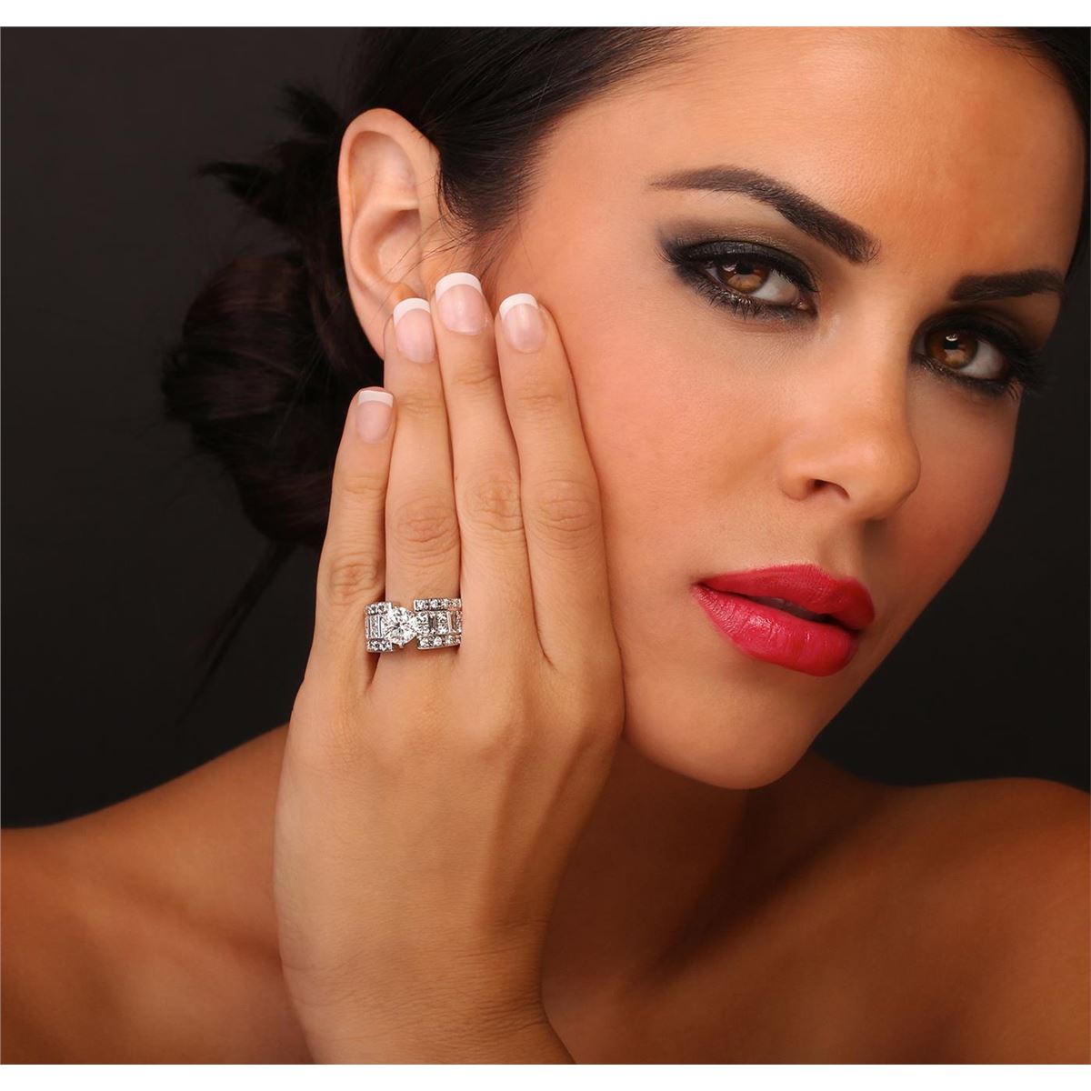 One electronically tested 18KT white gold Ladies combination cast & assembled engagement ring with a bright polish finish. Condition is new. Identified with markings of "18K". Containing: One prong set round brilliant cut diamond, measuring 8.00 - 8.00 x 5.10mm (depth est.) approximate weight of 1.99ct. Clarity: I-1. Color: I, Cut is Good. Twelve invisible set princess cut diamonds, measuring 2.50 x 2.50 x 1.89mm (depth est.) approximate. Total Weight of 12 Stones = 1.16ct. Clarity: SI-1. Color: J, Cut is Good. Four invisible set baguette cut diamonds, measuring 5.30 x 2.00 x 1.70mm (depth est.) approximate. Total Weight of 4 Stones = 0.32ct. Clarity: VS-2. Color: I - J, Cut is Good. Sixteen bead set round brilliant cut diamonds, measuring 2.00 - 2.00 x 1.20mm (depth est.) approximate. Total Weight of 16 Stones = 0.47ct. Clarity: I-1. Color: J - K, Cut is Good. Total Weight of Diamonds 3.94ct. Total Weight of Engagement Ring 16.30 grams. GGL Appraised at $43,685.00.