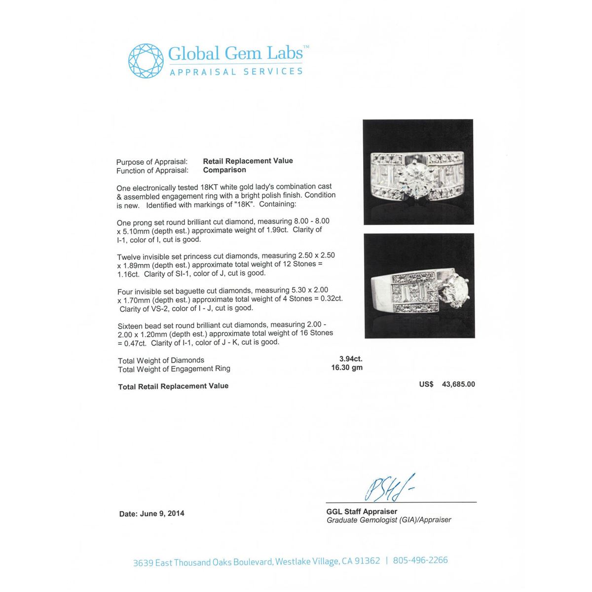 One electronically tested 18KT white gold Ladies combination cast & assembled engagement ring with a bright polish finish. Condition is new. Identified with markings of "18K". Containing: One prong set round brilliant cut diamond, measuring 8.00 - 8.00 x 5.10mm (depth est.) approximate weight of 1.99ct. Clarity: I-1. Color: I, Cut is Good. Twelve invisible set princess cut diamonds, measuring 2.50 x 2.50 x 1.89mm (depth est.) approximate. Total Weight of 12 Stones = 1.16ct. Clarity: SI-1. Color: J, Cut is Good. Four invisible set baguette cut diamonds, measuring 5.30 x 2.00 x 1.70mm (depth est.) approximate. Total Weight of 4 Stones = 0.32ct. Clarity: VS-2. Color: I - J, Cut is Good. Sixteen bead set round brilliant cut diamonds, measuring 2.00 - 2.00 x 1.20mm (depth est.) approximate. Total Weight of 16 Stones = 0.47ct. Clarity: I-1. Color: J - K, Cut is Good. Total Weight of Diamonds 3.94ct. Total Weight of Engagement Ring 16.30 grams. GGL Appraised at $43,685.00.