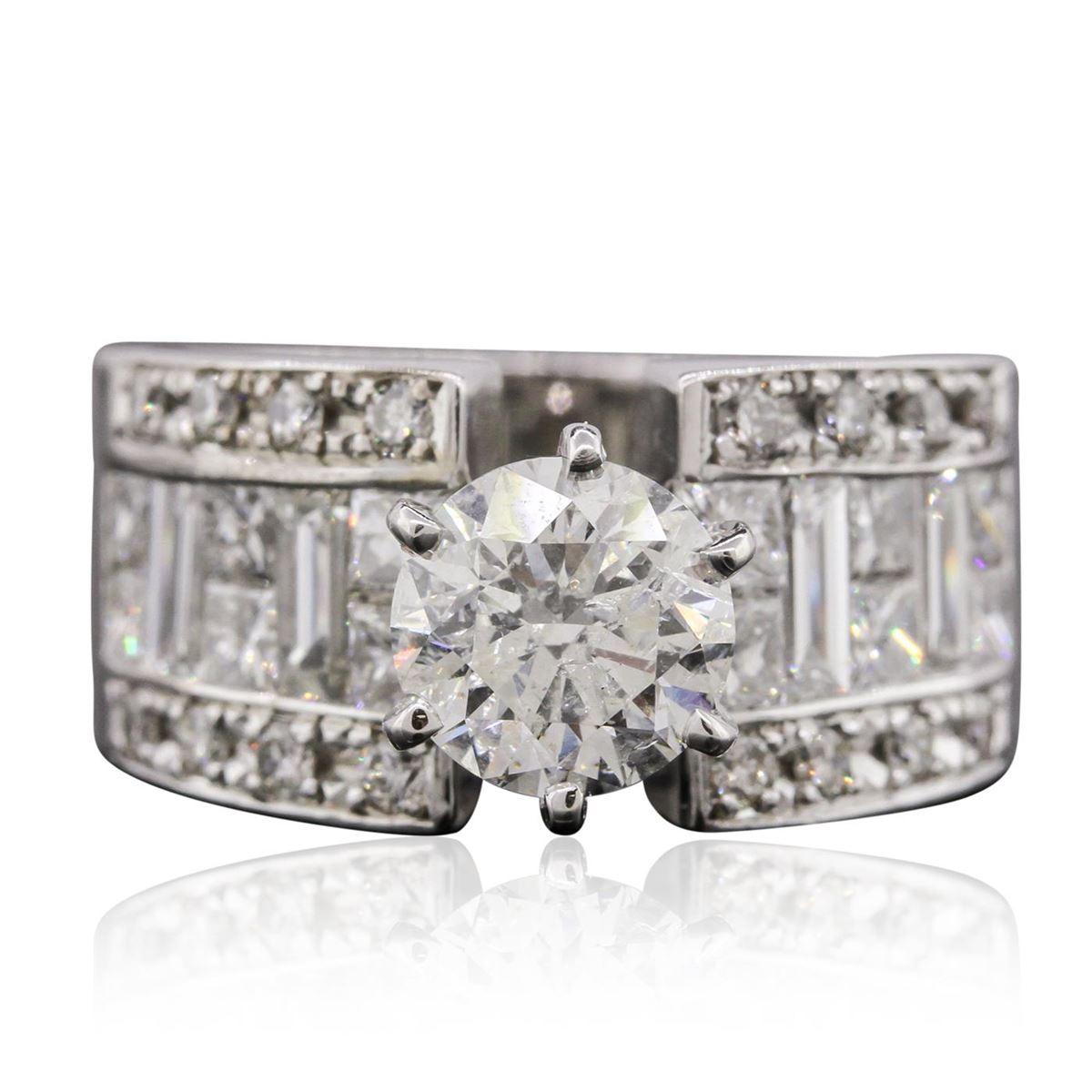 One electronically tested 18KT white gold Ladies combination cast & assembled engagement ring with a bright polish finish. Condition is new. Identified with markings of "18K". Containing: One prong set round brilliant cut diamond, measuring 8.00 - 8.00 x 5.10mm (depth est.) approximate weight of 1.99ct. Clarity: I-1. Color: I, Cut is Good. Twelve invisible set princess cut diamonds, measuring 2.50 x 2.50 x 1.89mm (depth est.) approximate. Total Weight of 12 Stones = 1.16ct. Clarity: SI-1. Color: J, Cut is Good. Four invisible set baguette cut diamonds, measuring 5.30 x 2.00 x 1.70mm (depth est.) approximate. Total Weight of 4 Stones = 0.32ct. Clarity: VS-2. Color: I - J, Cut is Good. Sixteen bead set round brilliant cut diamonds, measuring 2.00 - 2.00 x 1.20mm (depth est.) approximate. Total Weight of 16 Stones = 0.47ct. Clarity: I-1. Color: J - K, Cut is Good. Total Weight of Diamonds 3.94ct. Total Weight of Engagement Ring 16.30 grams. GGL Appraised at $43,685.00.