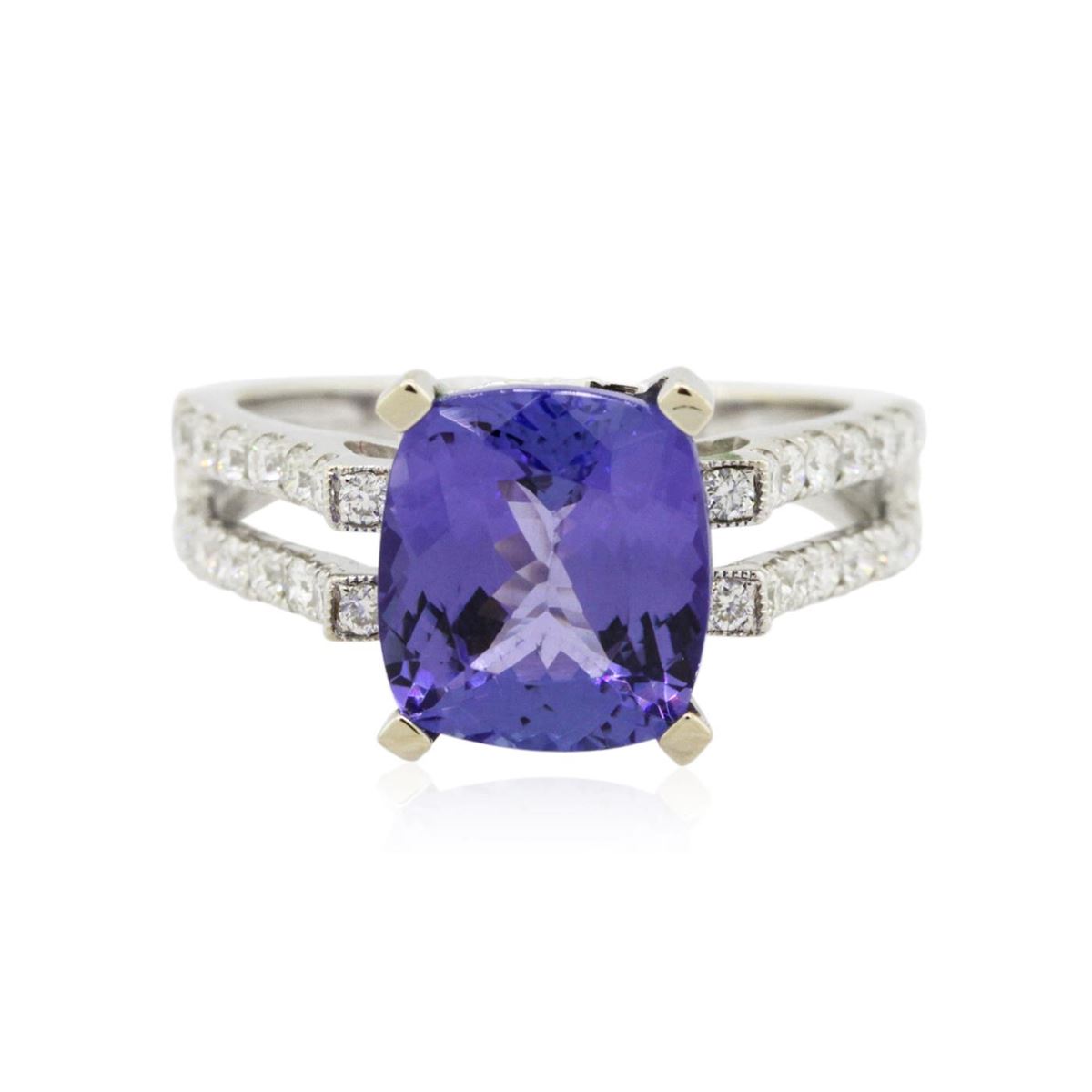 One electronically tested 18KT white gold ladies combination cast & assembled ring with a bright polish finish. Identified with markings of "750". Condition is new. Containing: One prong set rectangular cushion modified brilliant cut natural tanzanite, measuring 9.82 x 8.86 x 5.76mm, approximate weight of 3.95ct., clarity is eye clean, type I, medium, moderately strong, bluish violet color, (GIA bV 5/4), cut is good. Thirty-Two prong set round brilliant cut diamonds, measuring 1.50 - 1.50 x 0.90mm (depth est.) approximate total weight of 32 Stones = 0.39ct. Clarity: SI-1 to I-1. Color: H - I, Cut is Good. Colored gemstones are presumed to have been subjected to commonly used enhancement processes. All diamonds and colored gemstones are graded in the mounting, unless otherwise stated. Total Weight of Colored Stones 3.95ct. Total Weight of Diamonds 0.39ct. Total Weight of Ring 5.20 grams. GGL Appraised at $9,245.00.