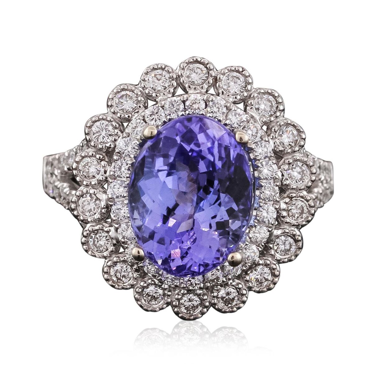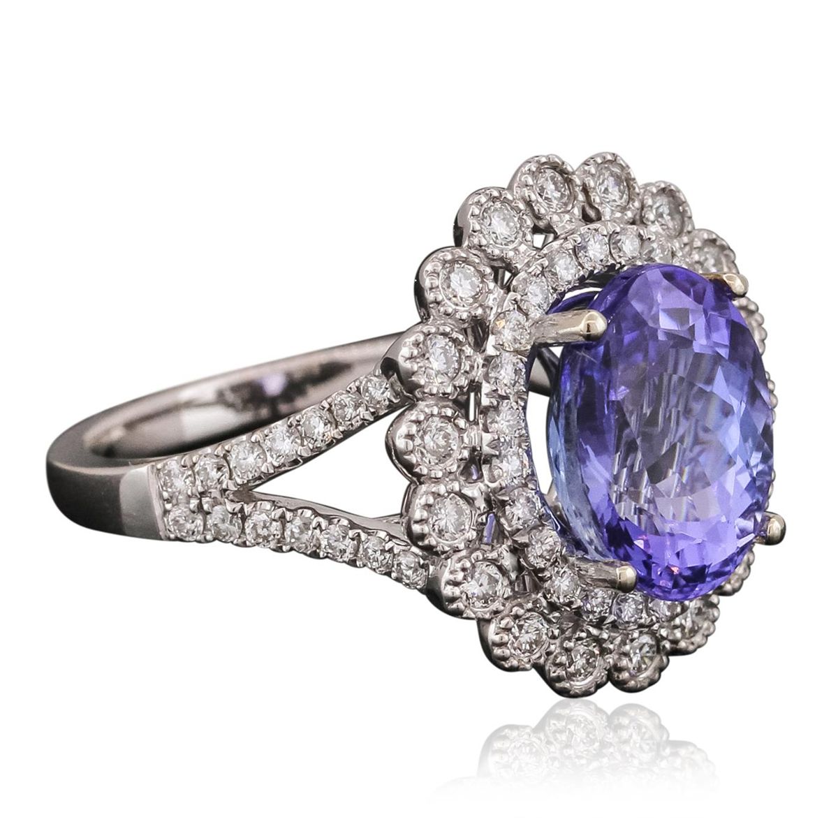 One electronically tested 18KT white gold ladies combination cast & assembled prong set ring with a cathedral shank with a bright polish finish. Identified with markings of "750 18K". Condition is new. Containing: One prong set oval modified brilliant cut natural tanzanite, measuring 11.00 x 8.34 x 6.30mm, approximate weight of 3.95ct., clarity is eye clean, type I, medium light, very slightly grayish, violet color, (GIA V 4/3), cut is good. Fifty-Two prong set round brilliant cut diamonds, measuring 1.30 - 1.30 x 0.78mm (depth est.) approximate total weight of 52 Stones = 0.42ct. Clarity: SI-2. Color: I, Cut is Good. Eighteen gypsy set round brilliant cut diamonds, measuring 1.50 - 1.50 x 0.90mm (depth est.) approximate total weight of 18 Stones = 0.22ct. Clarity: SI-1 to SI-2. Color: I, Cut is Good. All diamonds are graded in the mounting, unless otherwise stated, Colored gemstones are presumed to have been subjected to commonly used enhancement processes. Total Weight of Colored Stones 3.95ct. Total Weight of Diamonds 0.64ct. Total Weight of Ring 7.10 grams. GGL Appraised at $10,295.00.