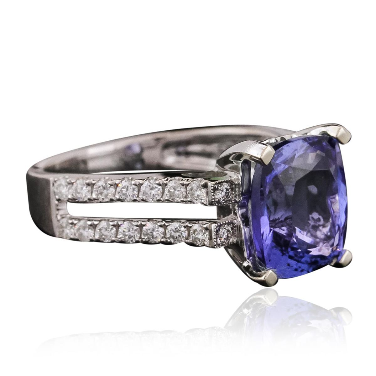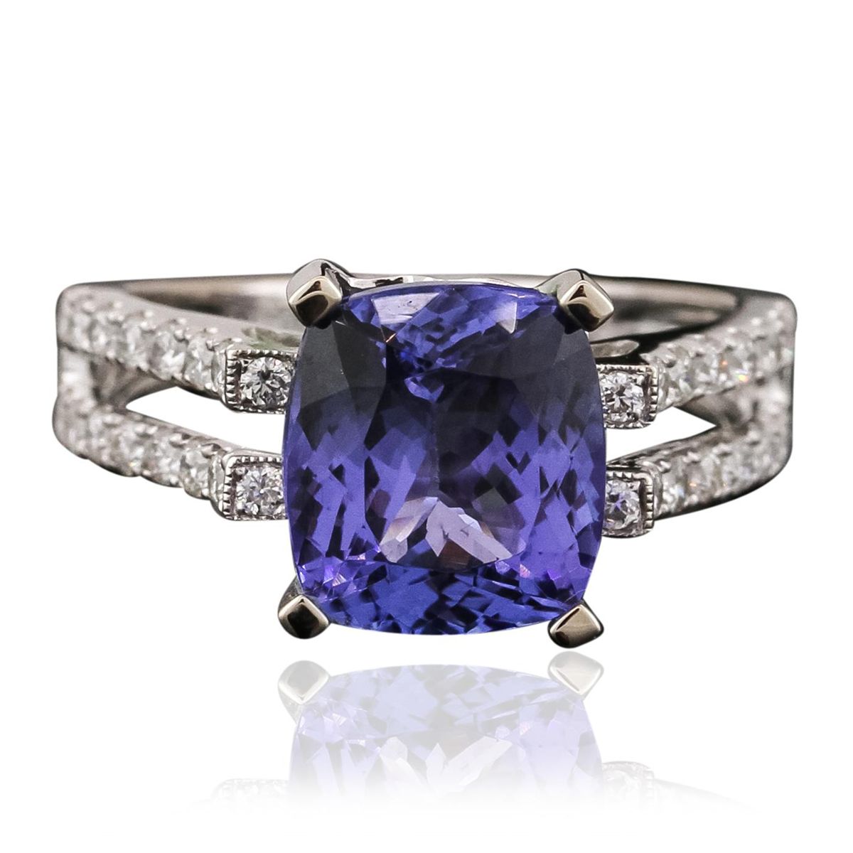 One electronically tested 18KT white gold ladies combination cast & assembled ring with a bright polish finish. Identified with markings of "750". Condition is new. Containing: One prong set rectangular cushion modified brilliant cut natural tanzanite, measuring 9.82 x 8.86 x 5.76mm, approximate weight of 3.95ct., clarity is eye clean, type I, medium, moderately strong, bluish violet color, (GIA bV 5/4), cut is good. Thirty-Two prong set round brilliant cut diamonds, measuring 1.50 - 1.50 x 0.90mm (depth est.) approximate total weight of 32 Stones = 0.39ct. Clarity: SI-1 to I-1. Color: H - I, Cut is Good. Colored gemstones are presumed to have been subjected to commonly used enhancement processes. All diamonds and colored gemstones are graded in the mounting, unless otherwise stated. Total Weight of Colored Stones 3.95ct. Total Weight of Diamonds 0.39ct. Total Weight of Ring 5.20 grams. GGL Appraised at $9,245.00.