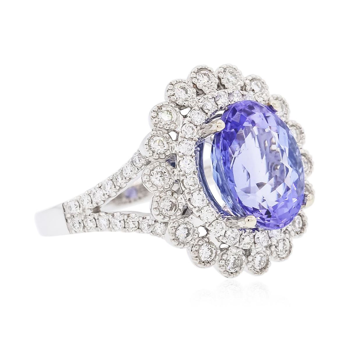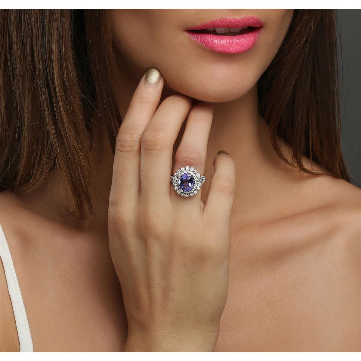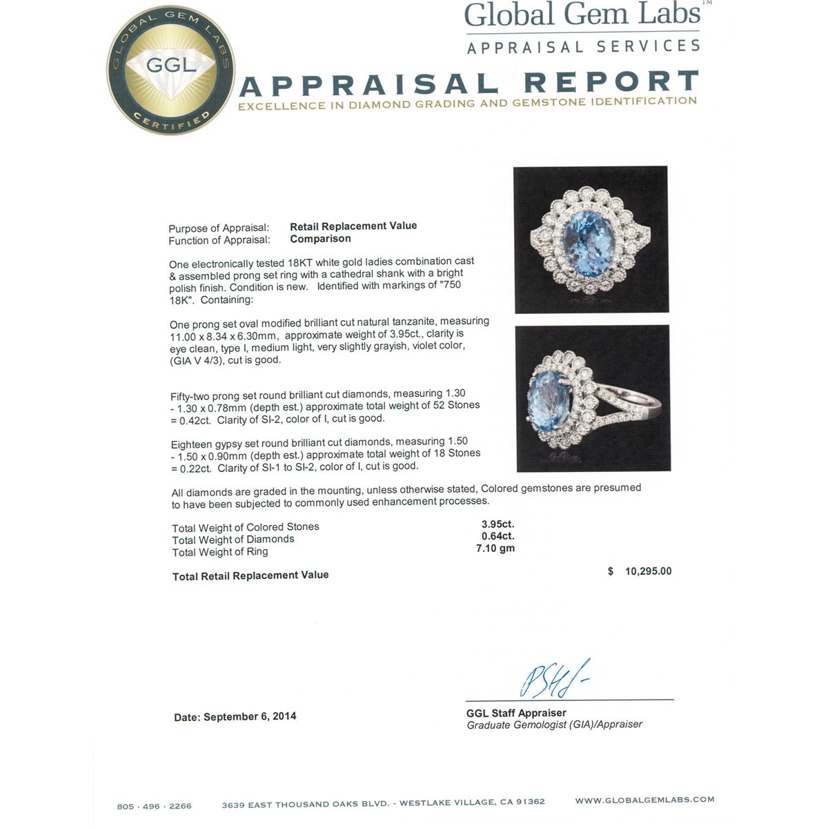 One electronically tested 18KT white gold ladies combination cast & assembled prong set ring with a cathedral shank with a bright polish finish. Identified with markings of "750 18K". Condition is new. Containing: One prong set oval modified brilliant cut natural tanzanite, measuring 11.00 x 8.34 x 6.30mm, approximate weight of 3.95ct., clarity is eye clean, type I, medium light, very slightly grayish, violet color, (GIA V 4/3), cut is good. Fifty-Two prong set round brilliant cut diamonds, measuring 1.30 - 1.30 x 0.78mm (depth est.) approximate total weight of 52 Stones = 0.42ct. Clarity: SI-2. Color: I, Cut is Good. Eighteen gypsy set round brilliant cut diamonds, measuring 1.50 - 1.50 x 0.90mm (depth est.) approximate total weight of 18 Stones = 0.22ct. Clarity: SI-1 to SI-2. Color: I, Cut is Good. All diamonds are graded in the mounting, unless otherwise stated, Colored gemstones are presumed to have been subjected to commonly used enhancement processes. Total Weight of Colored Stones 3.95ct. Total Weight of Diamonds 0.64ct. Total Weight of Ring 7.10 grams. GGL Appraised at $10,295.00.